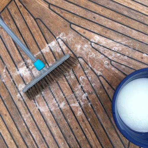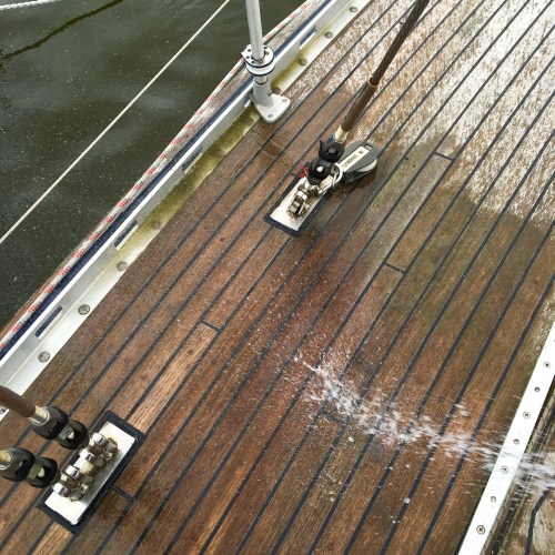 We halen alle lijnen van het dek, en geven het teak een schoonheidsbehandeling. Met een zachte borstel en zuiver water het meeste groen weghalen, daarna een tweede beurt met bruine zeep en ten slotte instrijken met Boracol. Zon en zee doen de komende weken de rest.
