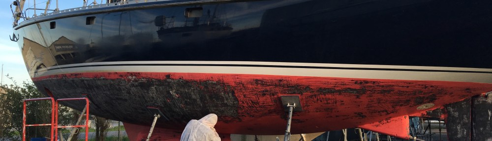 Want we hebben een plan. We gaan het onderwaterschip aanpakken. Bij de keuring van onze boot -toen zagen we voor het eerst haar onderkant- was het ons niet zo zeer opgevallen. Het moet gezegd, het was pokkenweer toen, regen en wind moeten het zicht beperkt hebben. Of waren we iets té verliefd op haar en vertroebelde dat onze kritische blik? Maar toen ze enkele maanden later in de loods van Breehorn stond, werd Las een beetje ongelukkig bij de aanblik van haar gebobbelde huidje. Resten antifouling vormden een korstig maanlandschap. Maar de enkele plaatsen waar zowel antifouling als coating hadden losgelaten en blank aluminium toonden, kregen op dat moment prioriteit. Er waren nog zo veel klussen, het werd een beetje kiezen. En zo zeilden we ons eerste seizoen met het onderwaterschip ongeveer zoals het was.