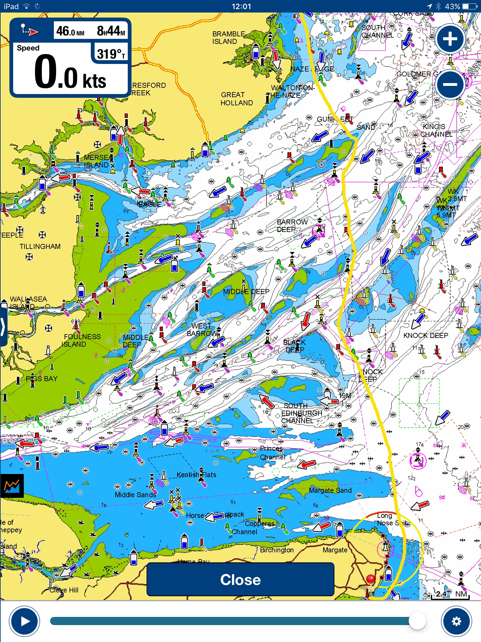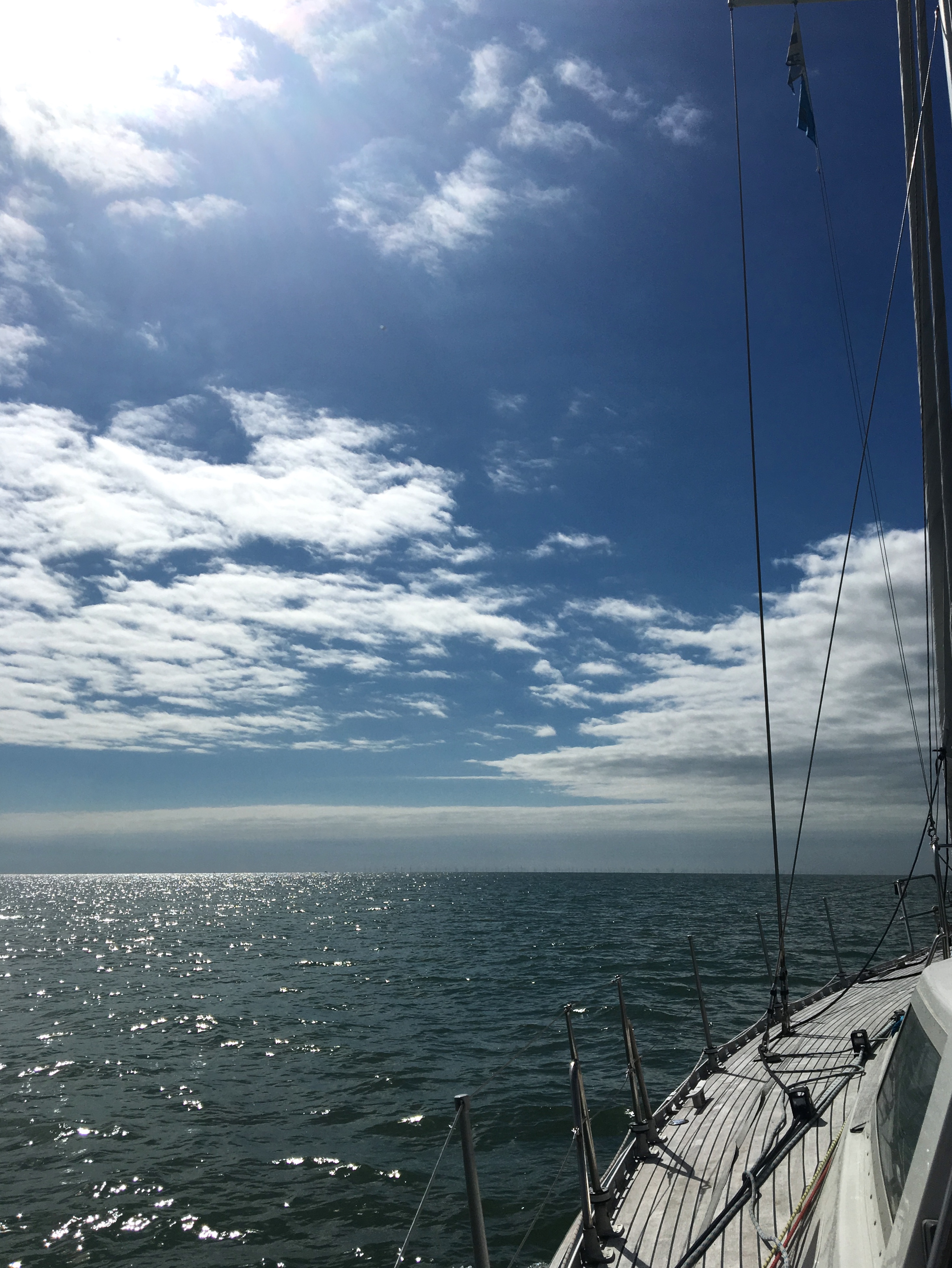 Harwich – Ramsgate, 46 mijl. Wie de vaargidsen er op naleest zou haast schrikken van dit stuk water. Zandbanken, windmolenparken, drukke scheepvaart, stroming. Als je naar de kaart kijkt wordt dat er niet meteen beter op. Maar eigenlijk valt het wel mee, zeker op een dag als vandaag. Van taaie omstandigheden die hier frequent voorkomen, lees: nijdige golfslag bij wind tegen stroom, is geen sprake.