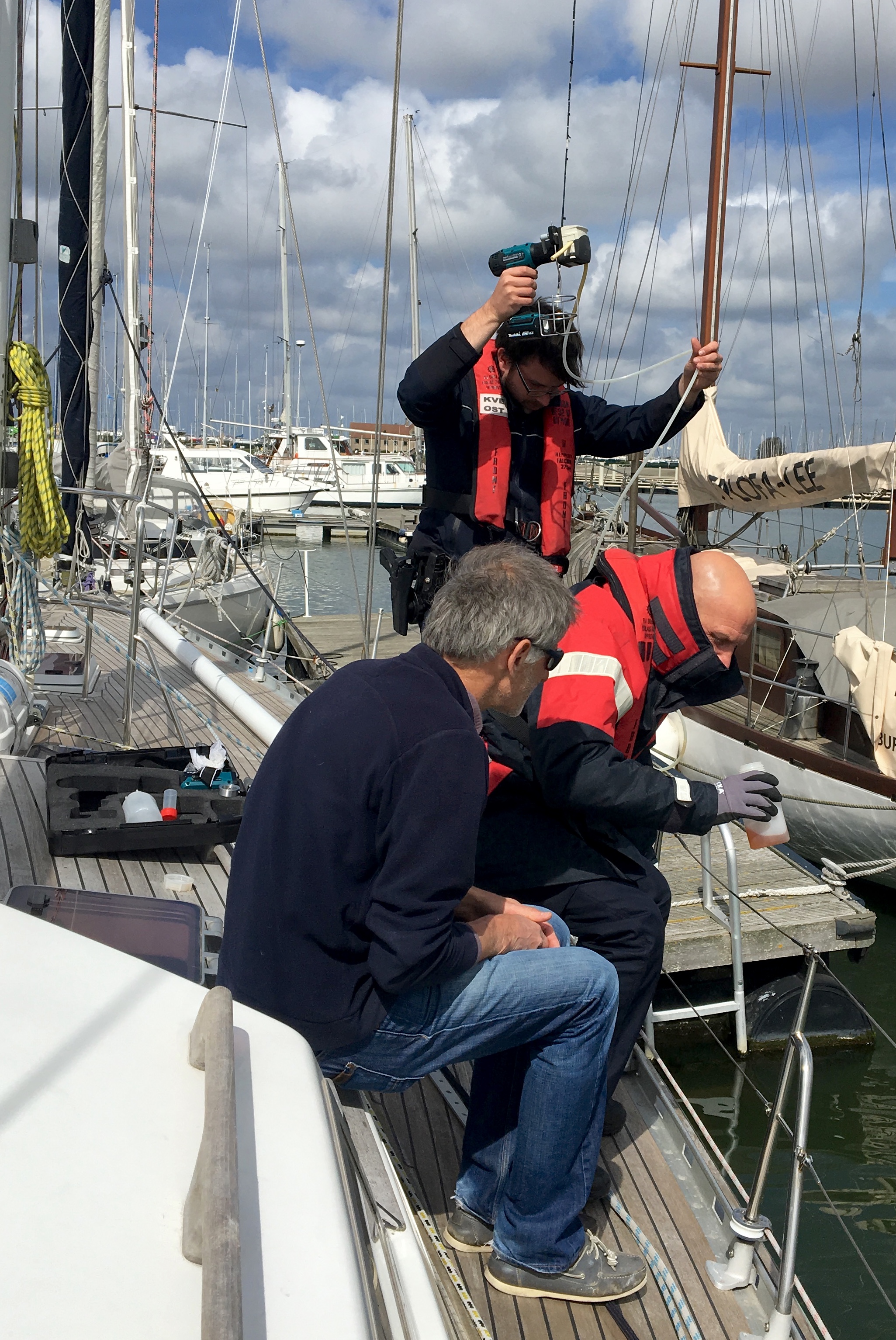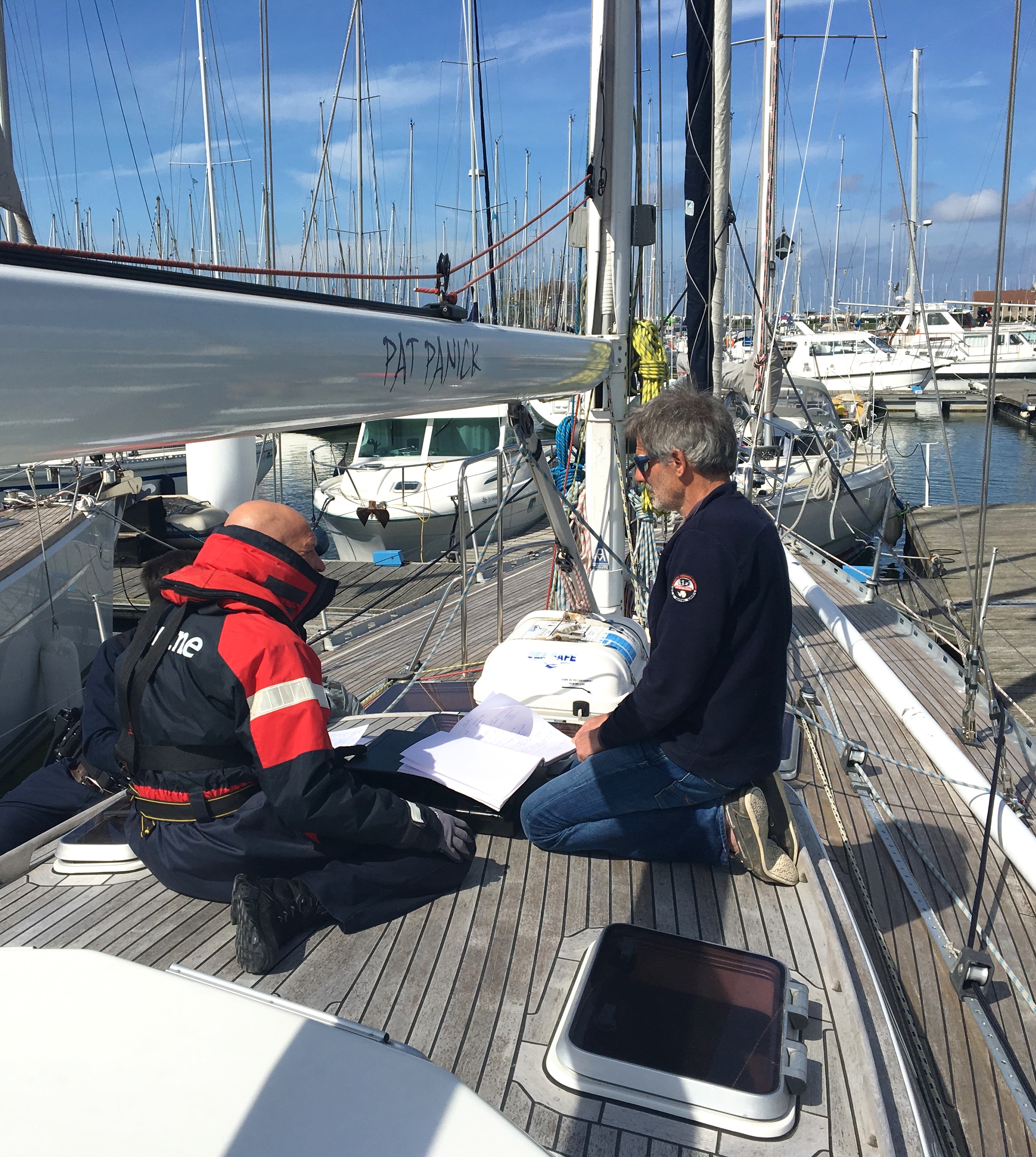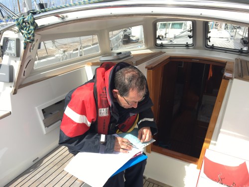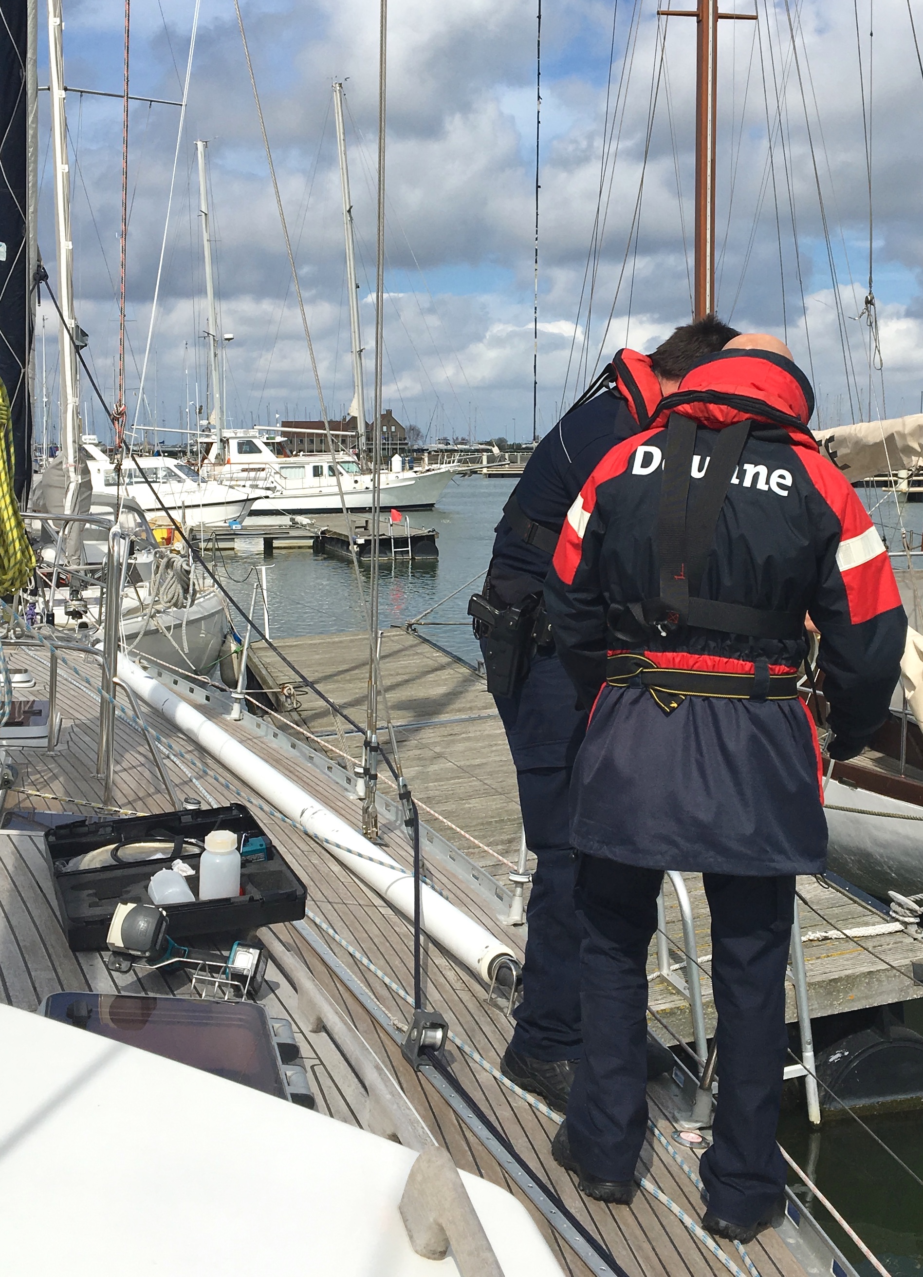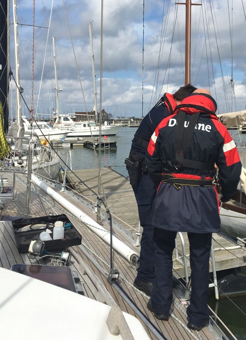 Het paasweekend ligt voor de boeg. Boodschappen zijn gedaan, weerberichtjes binnengehaald, water en fuel getankt. We hebben nog maar net de laatste plooibox aan boord gezet of drie mannen in het zwart, mét reddingsvest en aktentas komen het ponton op gelopen, onze richting uit.
