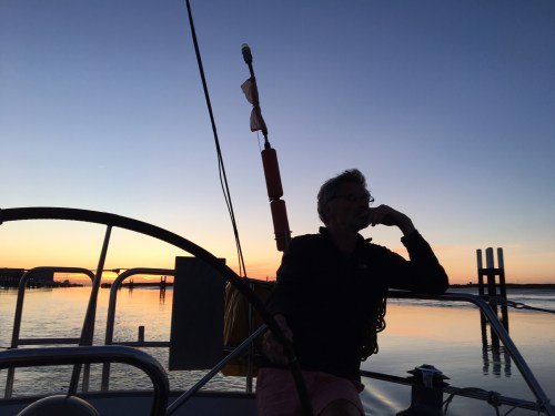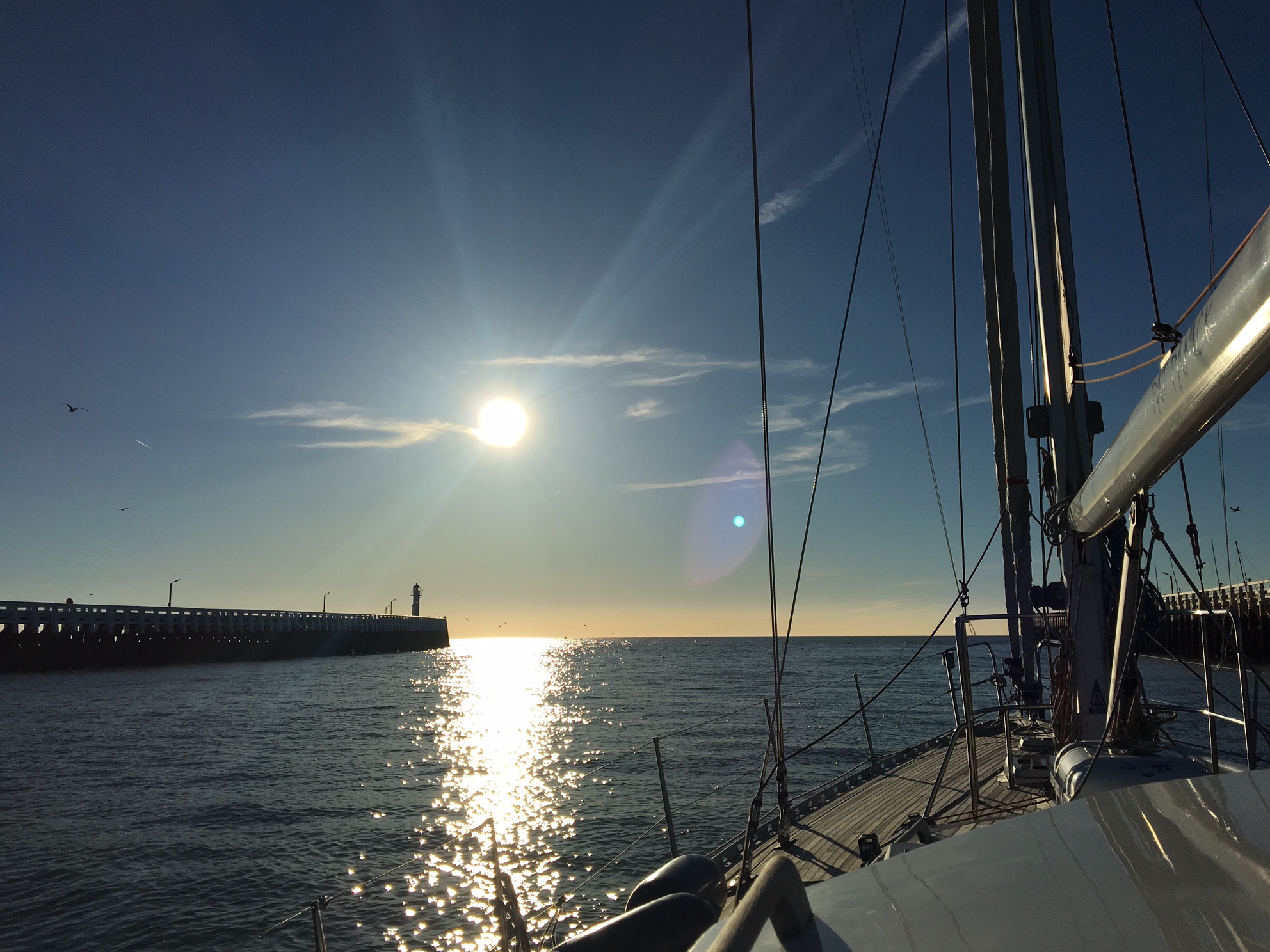 Gewoon trossen los, de havengeul uit en het water op. Het heerlijke van deze dagen is dat we het stukje zee voor onze thuishaven bijna voor ons alleen hebben, zo kort voor de zomergekte van juli en augustus. Onze speeltuin. We varen recht het zeegat in, de zon tegemoet. Om dan traag zeilend terug te keren richting havengeul, met vanuit de kuip eersteklas zicht op een machtige zonsondergang.