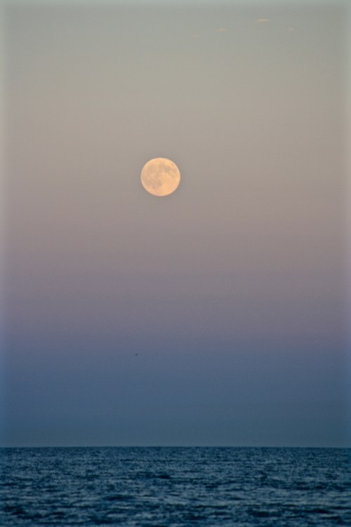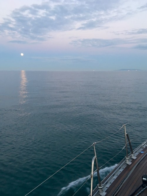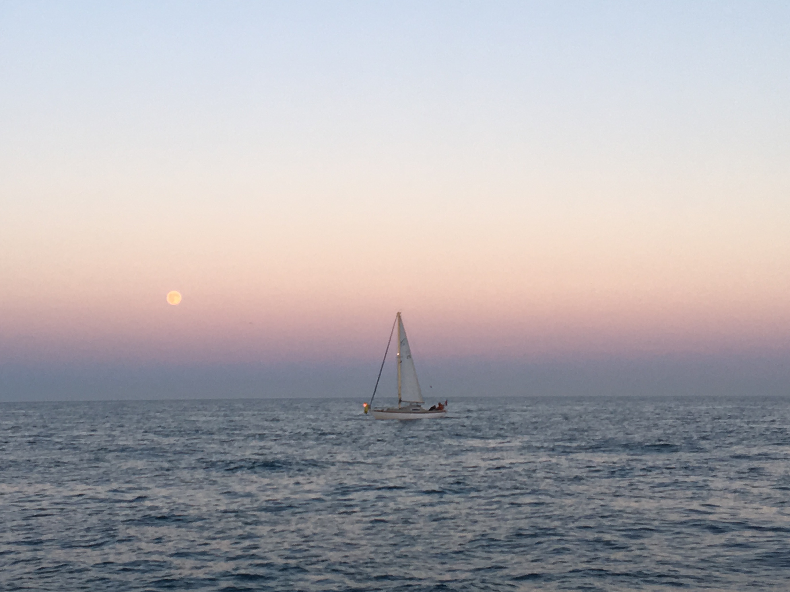 Na een zonnige dag kwakkelen, zeil, motor, zeil, motor naderen we Beachy Head. In het westen zakt de zon traag achter de klif, in het oosten gaat de volle maan op in een zweem van babyroze en babyblauw.