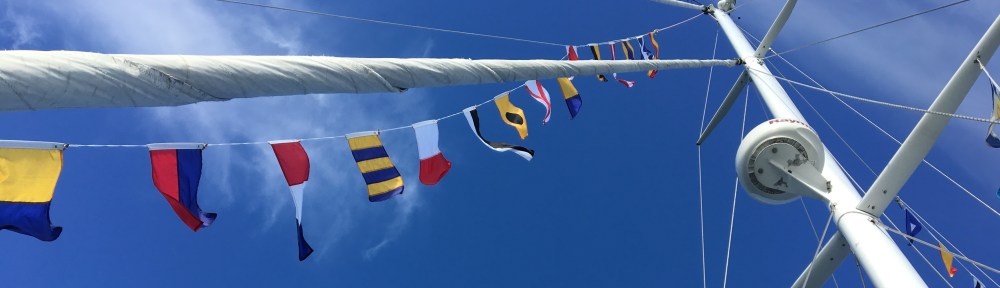 Jaren geleden bestelde ik zo’n seinvlaggenset als verjaardagscadeau voor Las. Het geheel kwam als een rode lap met zakjes er op gestikt, elk met een keurig gevouwen vlaggetje erin. 26 letters van het alfabet, 10 cijferwimpels, 3 vervangingswimpels. Nee, dat ging ik niet zomaar als geschenk verpakken, ik zou ze ophangen en mijn schipper er mee verrassen. Gemakkelijker gezegd dan gedaan. Ik zie me nog zitten met het pak opgeplooide vlaggen en metershoog boven mijn hoofd de mast. Vlag per vlag peuterde ik de houtjes-touwtjes in elkaar tot een lang sliert. A, B, C, … Vooraan zou ik de spinnakerval gebruiken om het geheel omhoog te hijsen, achteraan de grootzeilval. Gemakkelijk was anders, hoe langer de slinger met vlaggen werd, hoe meer de wind er mee aan de haal ging. Fier als een gieter was ik toen het uiteindelijk lukte. Wat ik niet opgemerkt had, was onze overbuur Philippe die mij van op zijn boot geamuseerd gadesloeg. Weken later maakte hij me er fijntjes op attent dat het er allemaal wel feestelijk had uitgezien maar dat ik het niet echt volgens de regels van de kunst had gedaan. Hoezo, niet volgens de regels van de kunst? Blijkbaar mogen de seinvlaggen helemaal niet alfabetisch worden gehangen, maar wel volgens een afgesproken volgorde, waar hard over nagedacht is. Vlaggen wisselen af met wimpels, kleuren zijn zo gerangschikt dat ze voor een evenwichtig geheel zorgen en de letters waar ze voor staan mogen geen ongepaste of beledigende boodschap vormen.