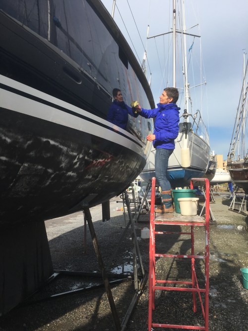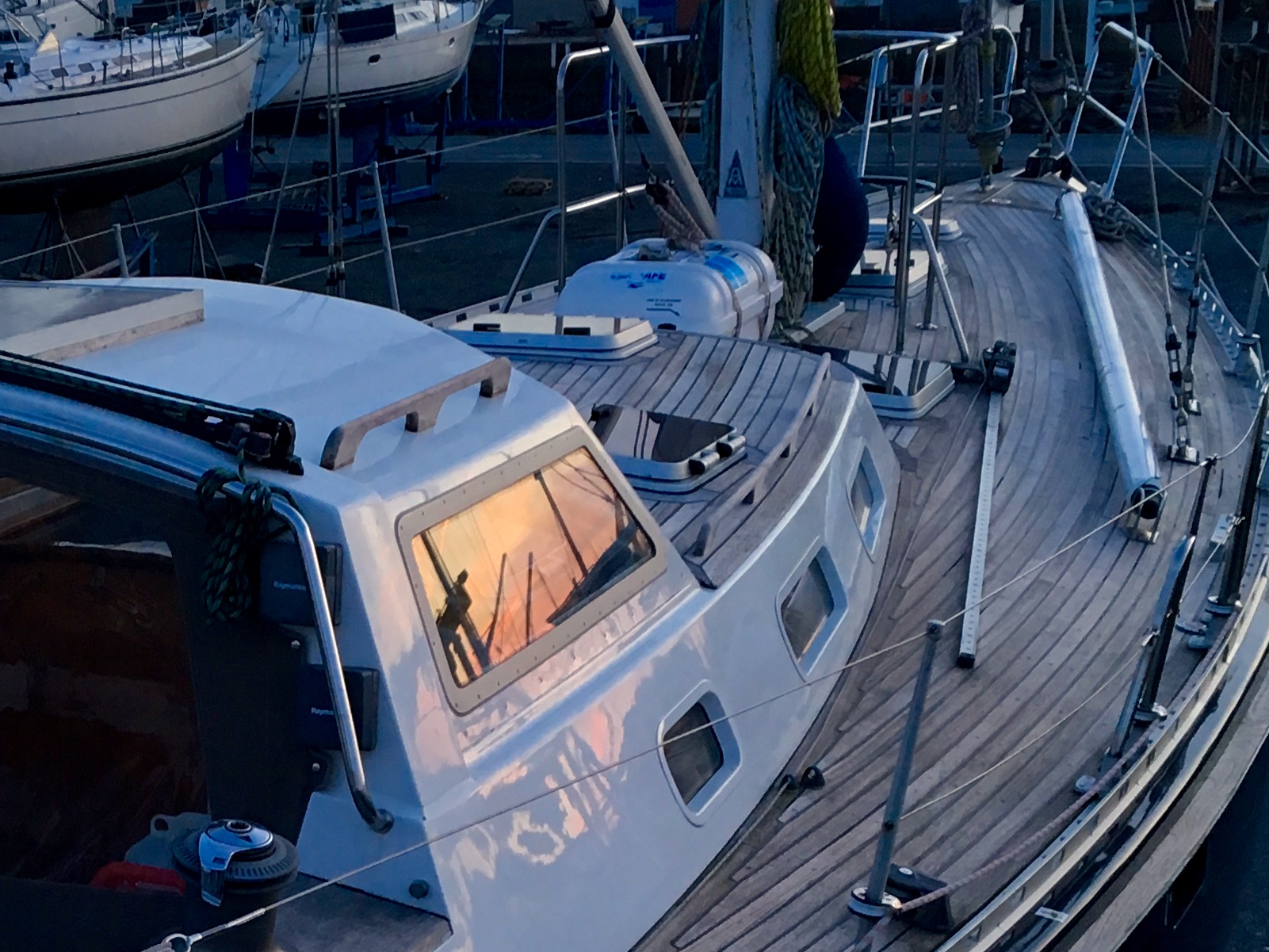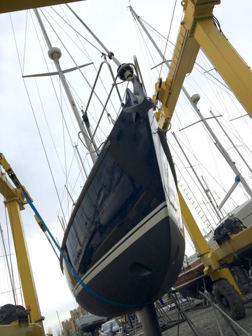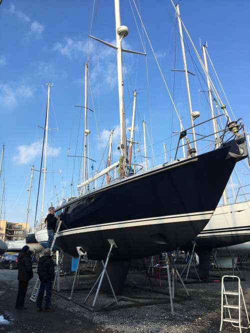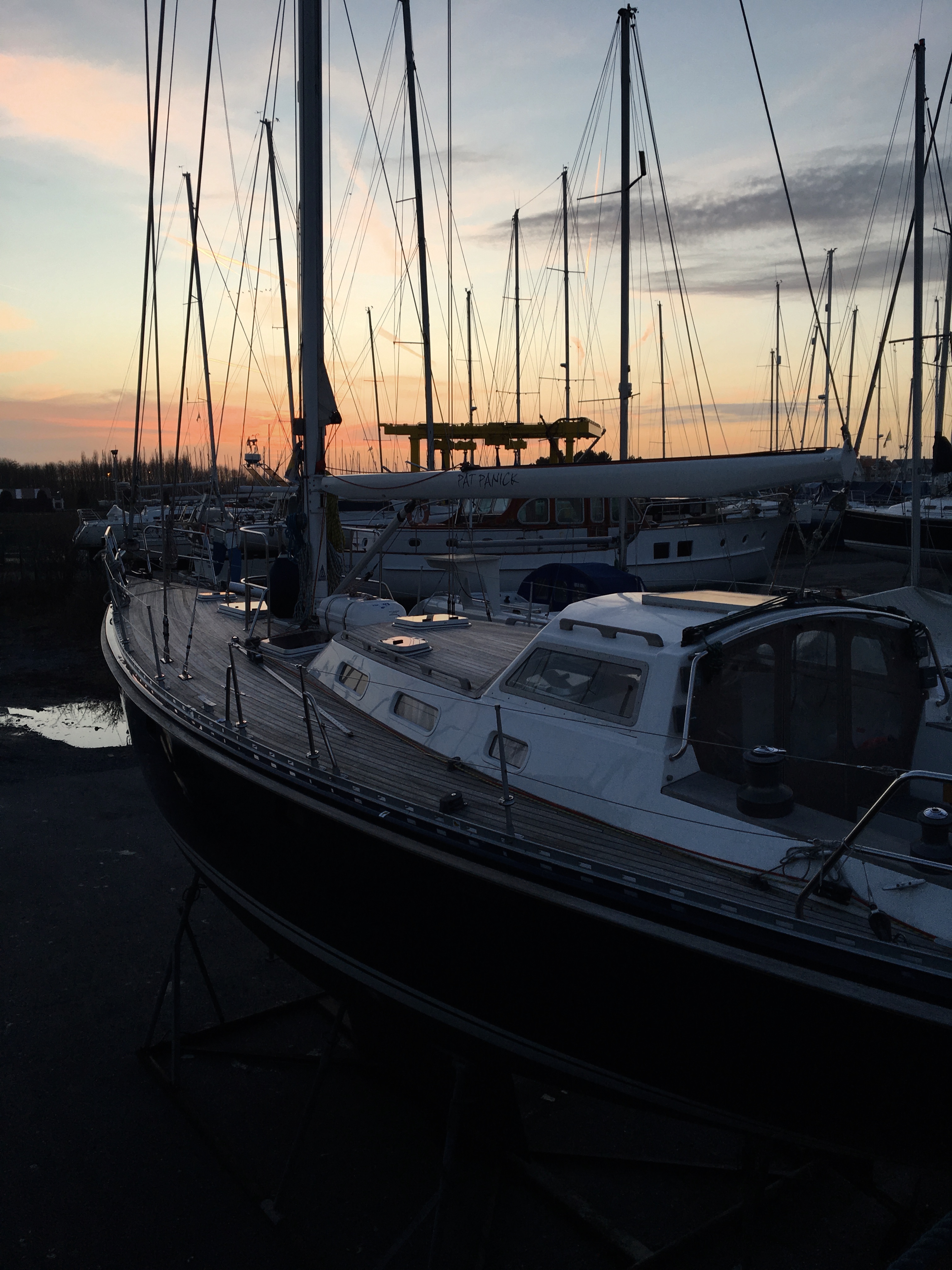 Daar staat ze dan, hoog en droog in de avondlijke vrieslucht. Nog één keer slapen en ze mag het water weer in. Er zit een nieuwe rubber dichting om haar schroefas. Helaas, ik heb geen vrije dag morgen. Maar de zeilvrienden, die zijn al zalig met pensioen en komen trouw terug om mijn schipper een helpende hand toe te steken. Ik ben gerust.