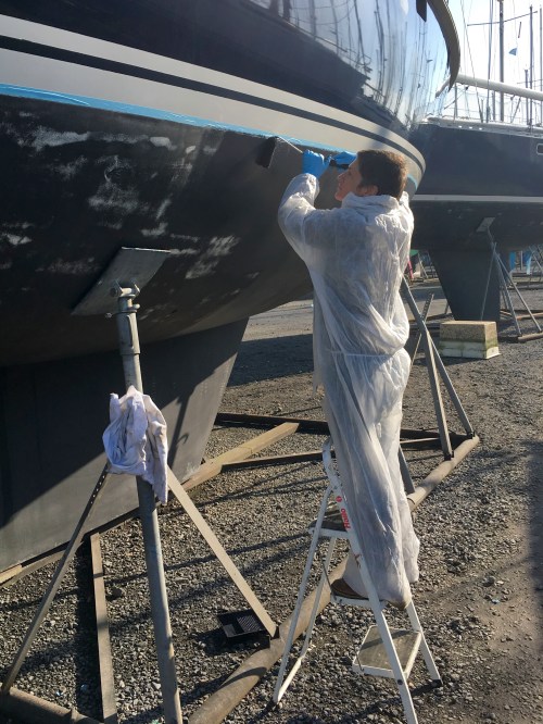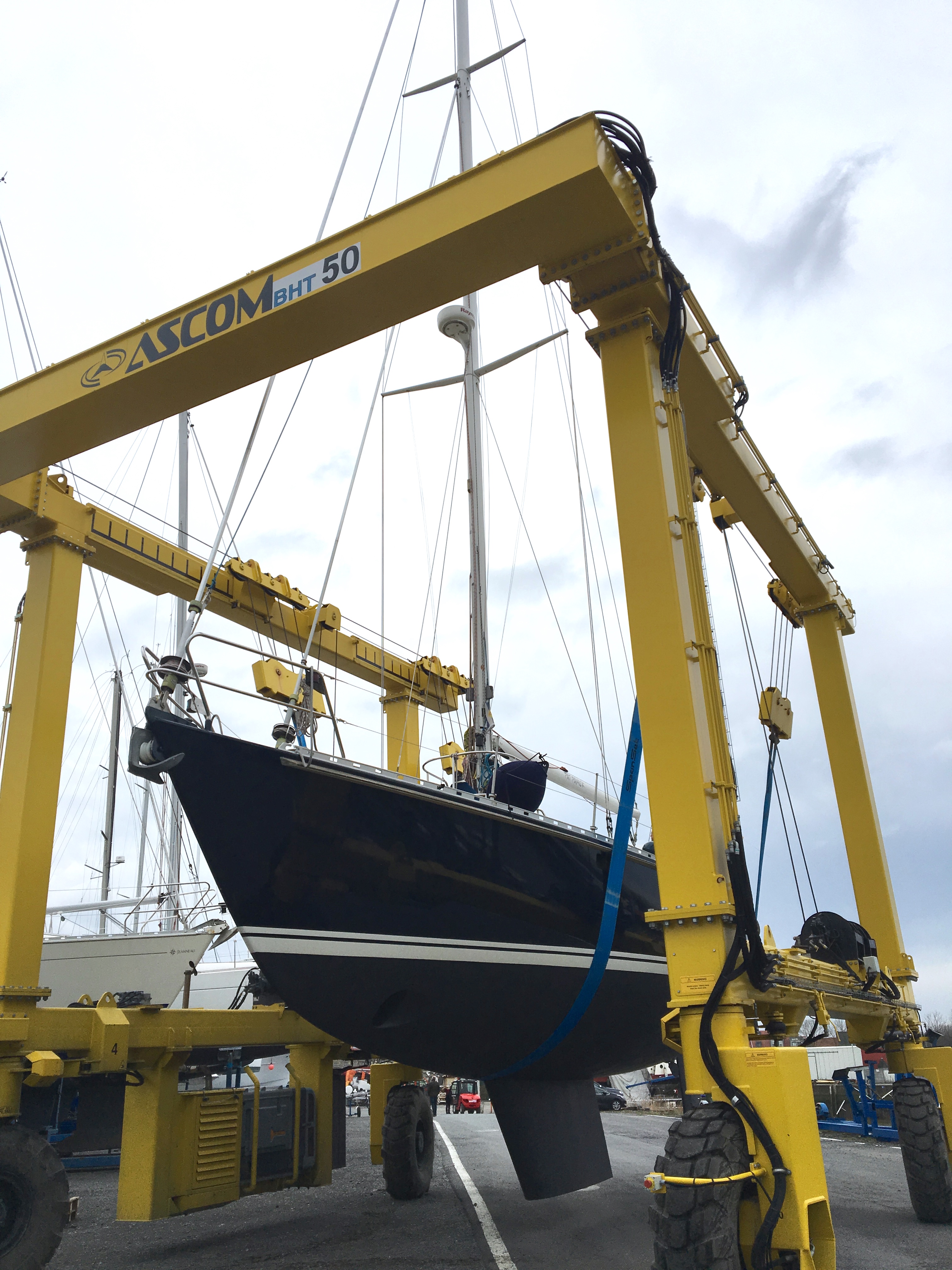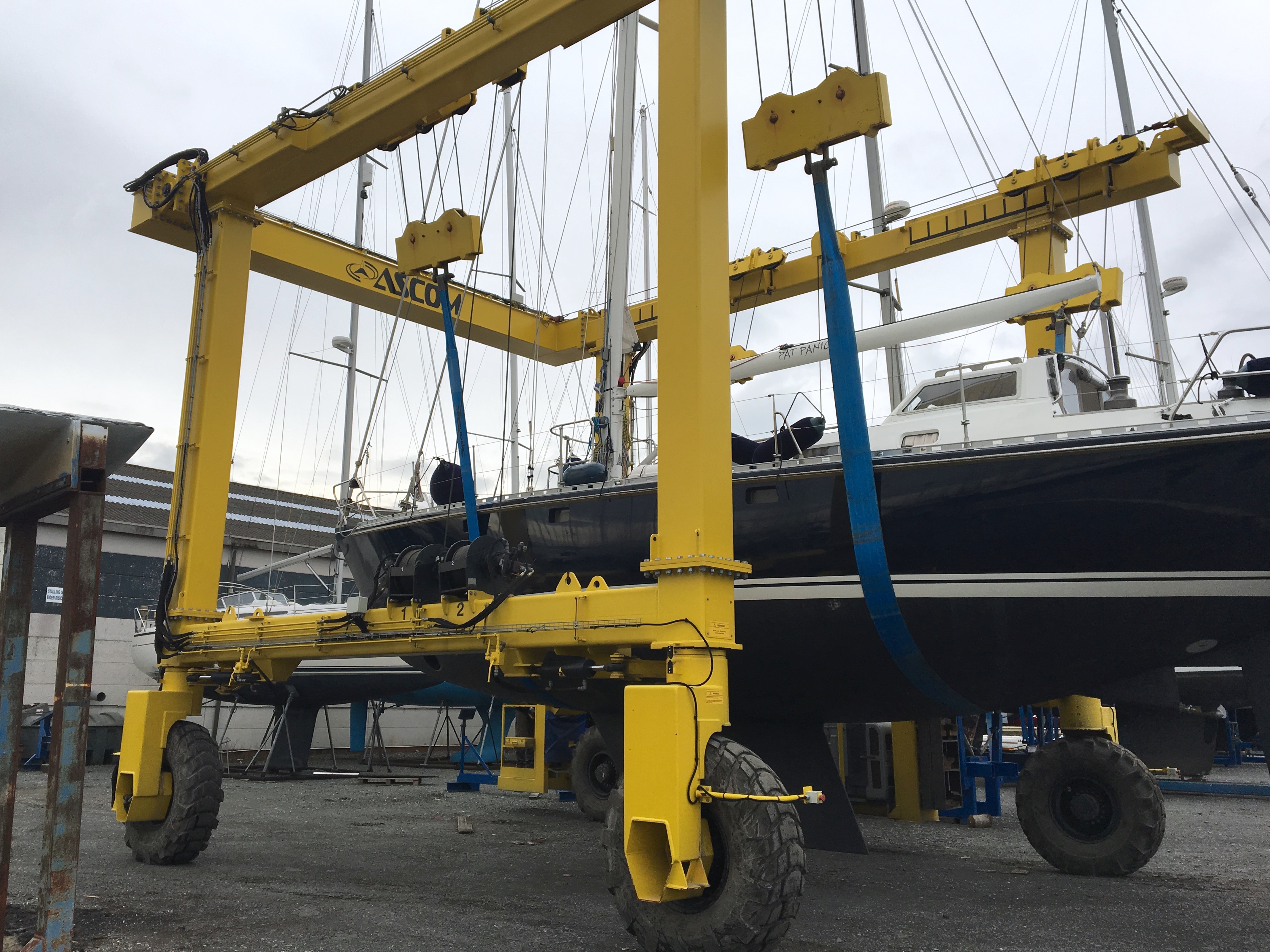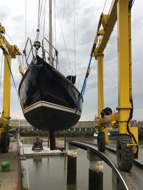 Om 8h30 zijn wij als eerste aan de beurt. Zeilvrienden Alain en Philip komen ondanks het vroege uur een handje toesteken en dat maakt het toch een stuk relaxter. Ik heb geen vrije dag vandaag, en wil, als het even kan, tegen 10h00 op kantoor zijn.