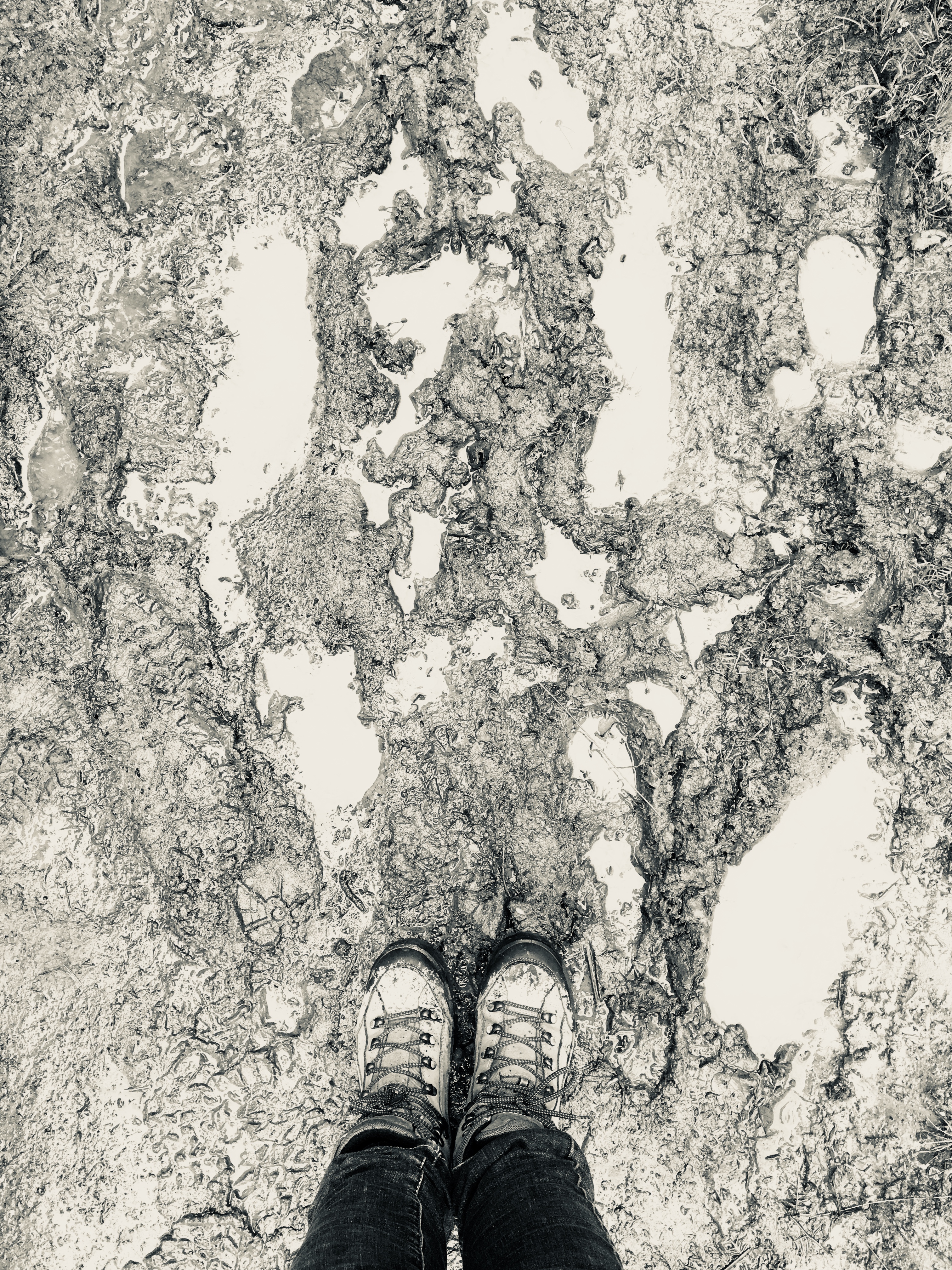 “Ik zou het niet weten!”, lach ik terug. “We zien wel wat morgen brengt!” Uitvallende mist die overgaat in motregen, motregen die zich vermomt als mist, grijs en nat, hoe dan ook.