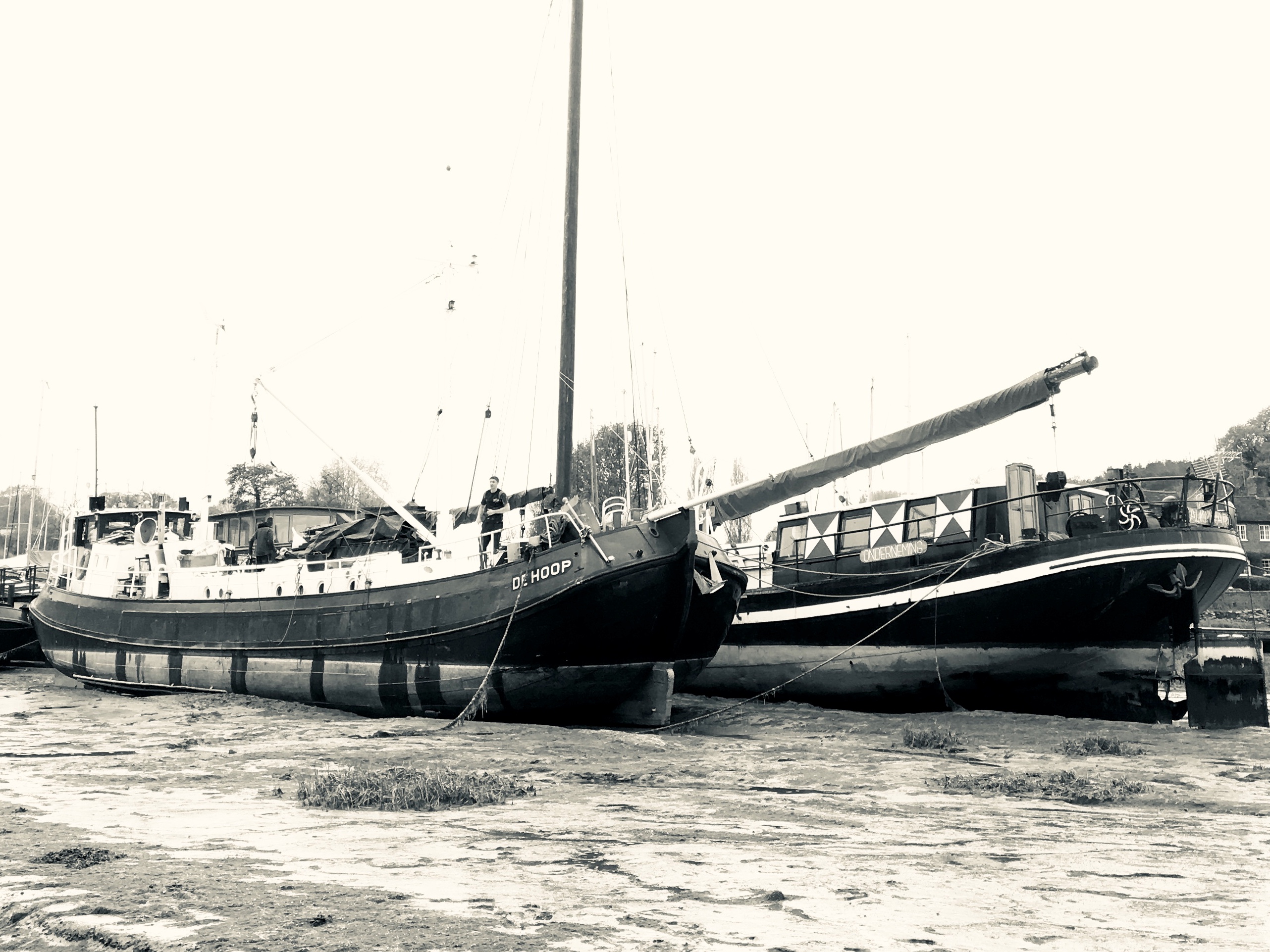 Pin Mill lijkt nog in wintermodus, veel boten staan nog boven. Sommige zullen nooit meer varen, ook al heten ze ‘De Hoop’ en ‘Onderneming’..