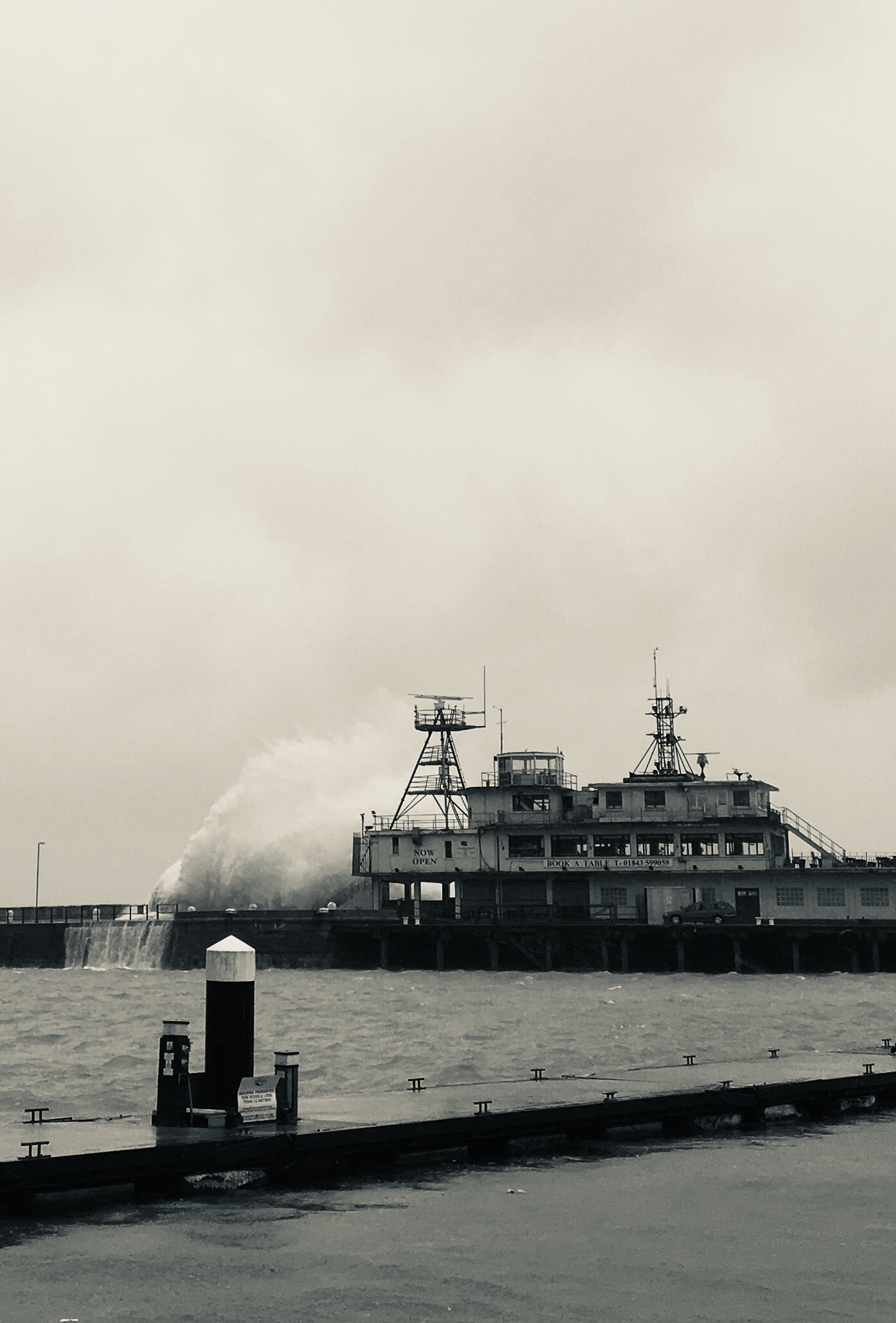 We liggen als gek te jagen aan het ponton. De havenmeester komt tegen een uur of elf bij ons langs. Dat het lelijk gaat doen, waarschuwt hij. Over een uur, bij hoog water zal de storm op zijn ergst zijn, en zal de zee vast over de muur slaan. Blijf aan boord, kom niet buiten, geeft hij nog mee. Niets wandelen, niets fietsen. Wij blijven aan boord, gegijzeld in Ramsgate…