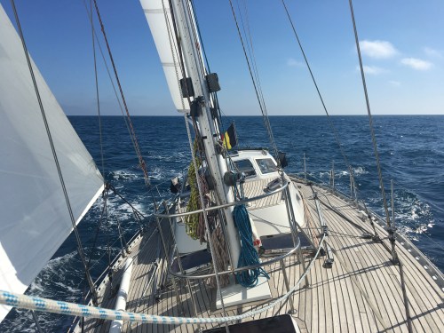 De Noren op de zeilboot een eindje verderop blijven uitnodigend kijken en lachen naar ons. Als Las er met de bijboot naar toe roeit en ze voor een drankje en een babbel aan boord uitnodigt, zijn ze “ja, takk” meteen akkoord.