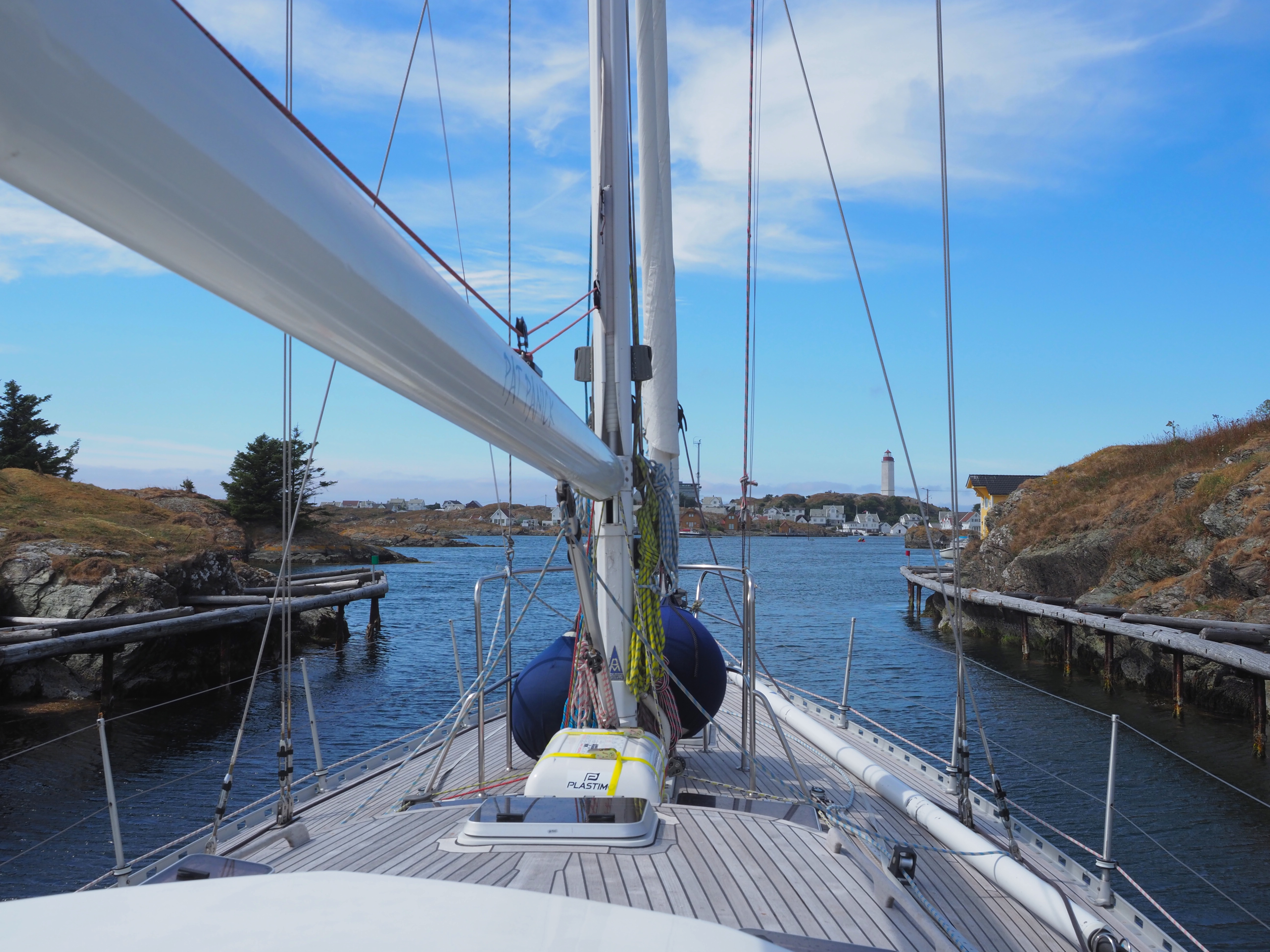 Daarvoor moeten we om het eiland Bokn heen en of je daarvoor noord of zuid kiest, maakt niet uit, het is ongeveer even ver. In de hoop de wind eens niét tegen te hebben, kiezen we voor de zuidkant… Maar wat ik niet gezien heb op de kaart is dat er op deze vaarroute een kabel van 22m tussen twee eilanden hangt. Help, onze mast! Zijn we nu 20, 21 of 22m doorvaarthoogte? Veel tijd om ons hierover druk te maken, is er niet. We schuiven sneller dan ik wil dichter en dichter naar de kabel toe, die voor mij slechts halverwege onze mast reikt. Ik weet wel dat dit gezichtsbedrog is maar tot de laatste seconde ziet het er griezelig te laag uit. Ik verbaas me er over hoe rustig Las blijft wanneer we er probleemloos onderdoor gaan. “De kaarten nemen een goeie marge, en het is laag water…” Even later liggen we voor anker in een filmdecor.