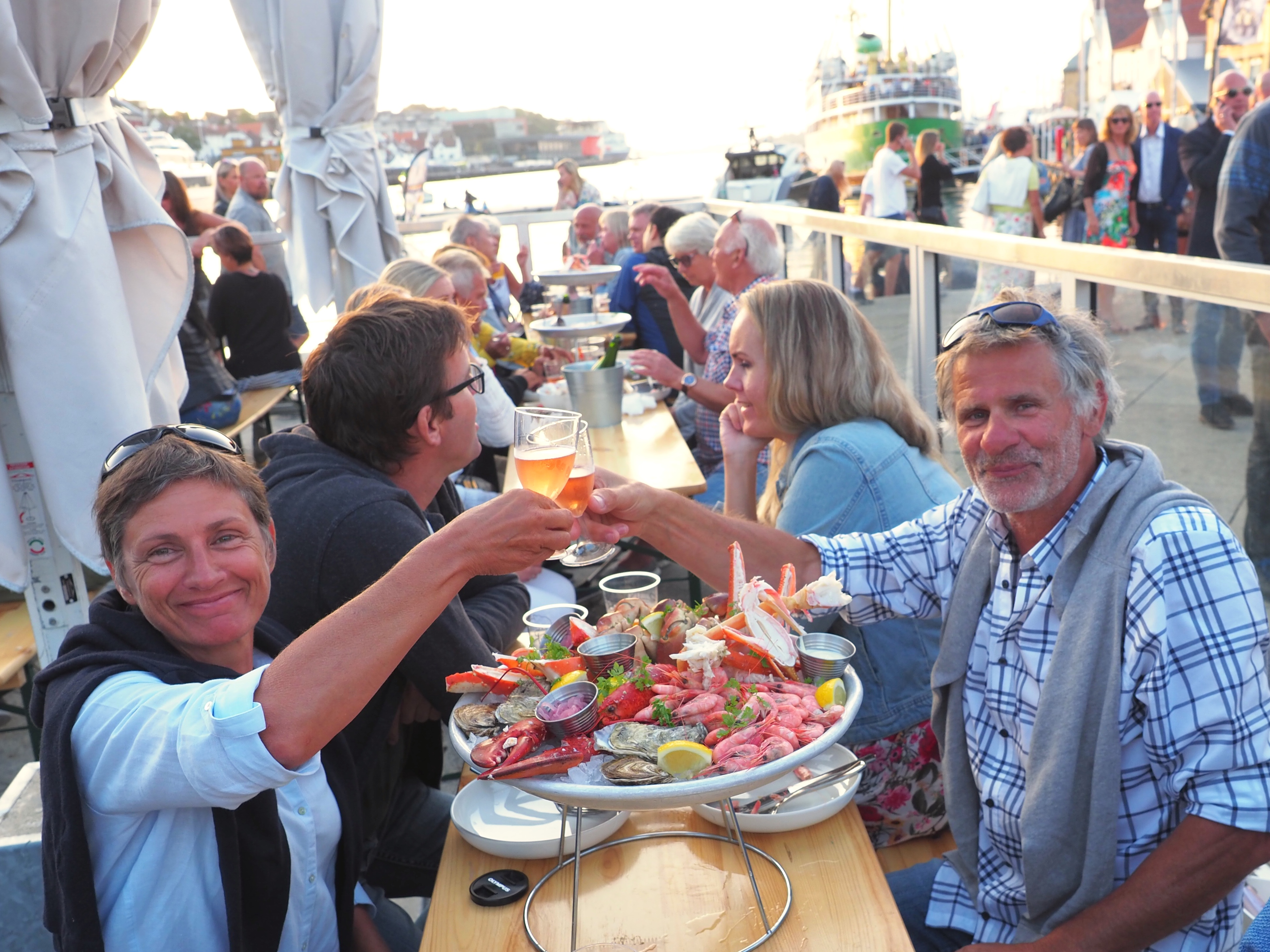 Tot blijkt dat we enkel nog een glas witte wijn kunnen bestellen, de kongekrabben zijn uitverkocht… Een bakje halen aan een van de vele eettenten -heb je die roofzuchtige meeuwen al gezien- vind ik niet meteen iets voor een verjaardagsetentje… We wringen ons tussen de mensenmassa terug naar het eerste restaurant. En kijk, we kunnen aanschuiven aan een lange tafel. Bij een overheerlijke schotel zeevruchten babbelen en lachen we links en rechts met onze onbekende tafelgenoten. De beste remedie tegen onvoorzien feestgeweld is er in meegaan. En champagne…