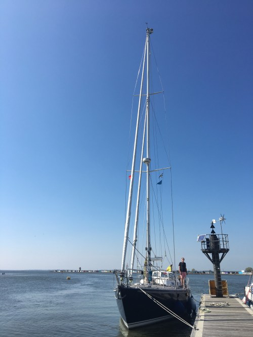 Hij begeleidt ons naar het eerste drijvende ponton aan de overkant van het dorp waar we een royale plek toegewezen krijgen. Dikke meertouwen laten vermoeden dat dit de vaste ligplaats van een werkschip is. Kunnen we hier wel blijven, moeten we ons nog verleggen? De havenmeester wuift onze zorg weg, het schip komt toch niet meer dit weekend, we kunnen hier blijven liggen, no worries! Even later liggen we afgemeerd, neus in de strakke oostenwind, en de zonovergoten kuip heerlijk beschut, mét zicht op de zeilwedstrijd…