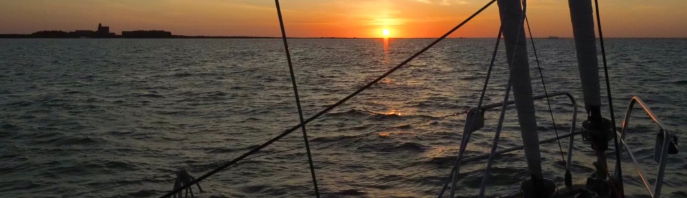 We komen bij valavond aan en omdat de toegangspoort naar de haven door het getij nog gesloten is, ankeren we net zoals een achttal andere boten. Wat ons zó bevalt dat, wanneer de poort opengaat en de hele vloot naar binnen vaart, wij rustig blijven liggen en de nacht voor anker doorbrengen…