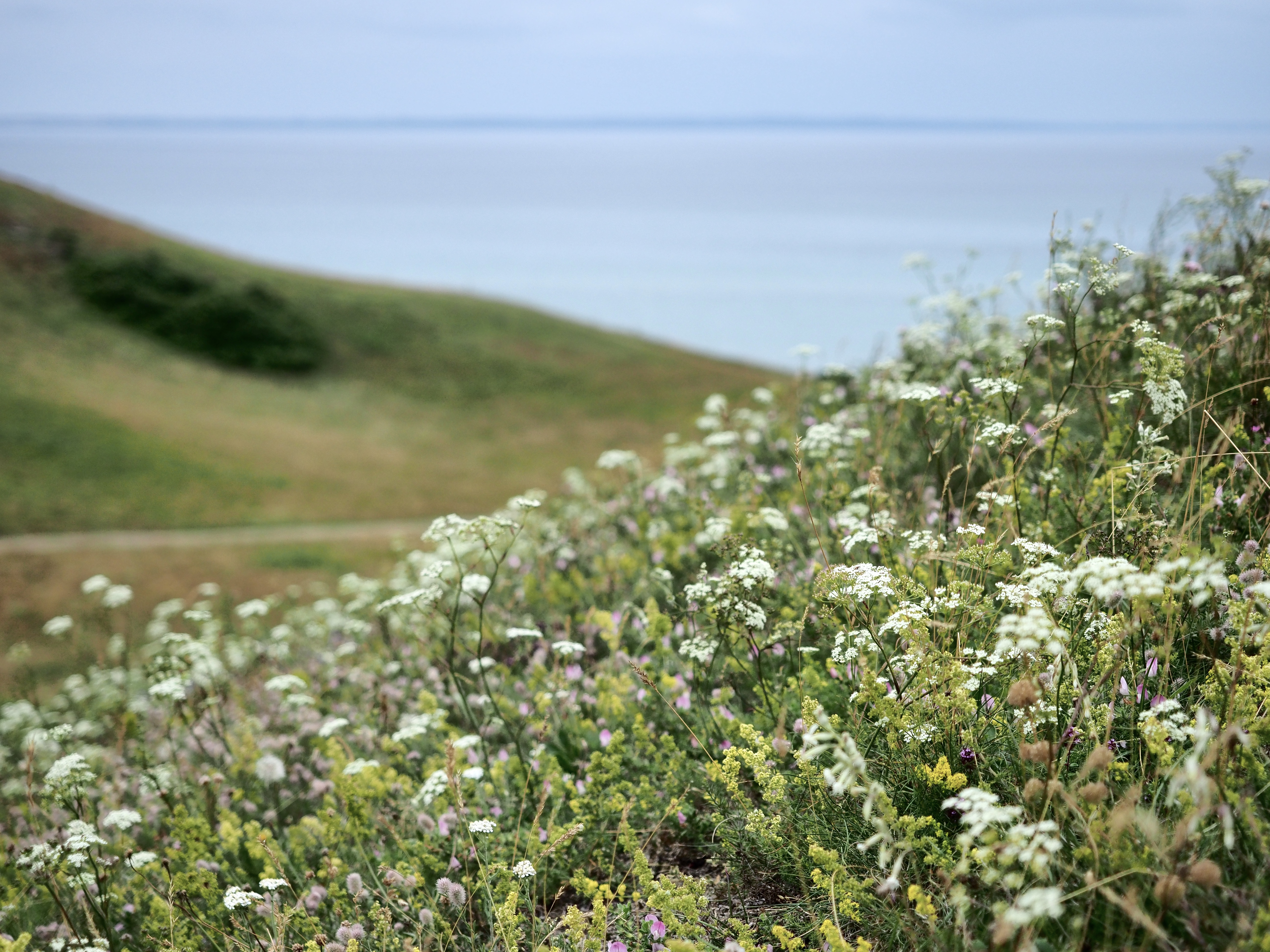 Het aarzelende licht dat deels achter de wolken blijft haperen bedrijft poëzie met de kleuren van het moerassige gebied op de terugweg naar Langør. Traag fietsen we tussen een weelde van zachte grijzen, contrasterende groenen en witte spikkels van frêle bloempjes. Tegen de monotone lucht tekenen planten zich sierlijk af als kunstig kantwerk…
