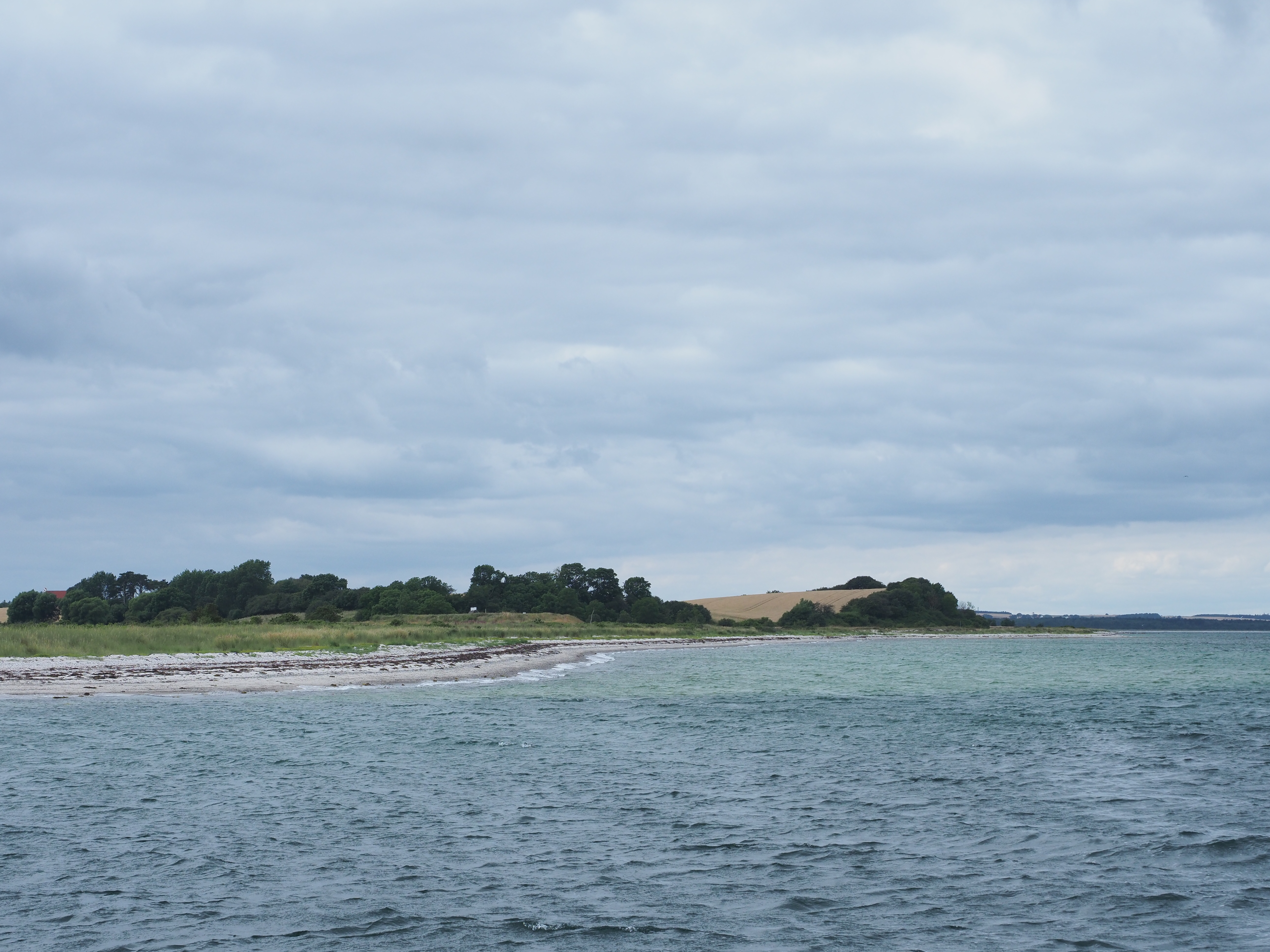 Het klaart op en na een lunch in het pittoreske Kirkeby fietsen we verder tot Issedhoved, dat op 15 km van de haven van Langør ligt. Het landschap op deze noordelijke top van het eiland is apart in zijn eenvoud. Bolle hellingen met kort droog gras, heideachtige planten en zoute bloemen in zachte kleuren. Beneden het strand.