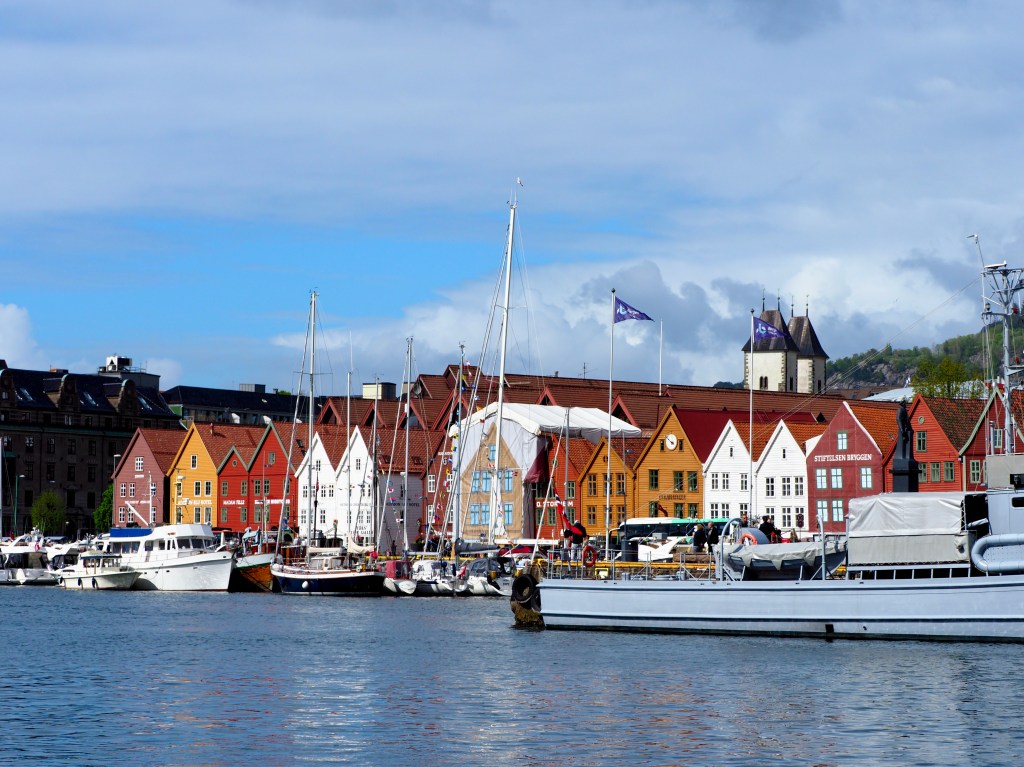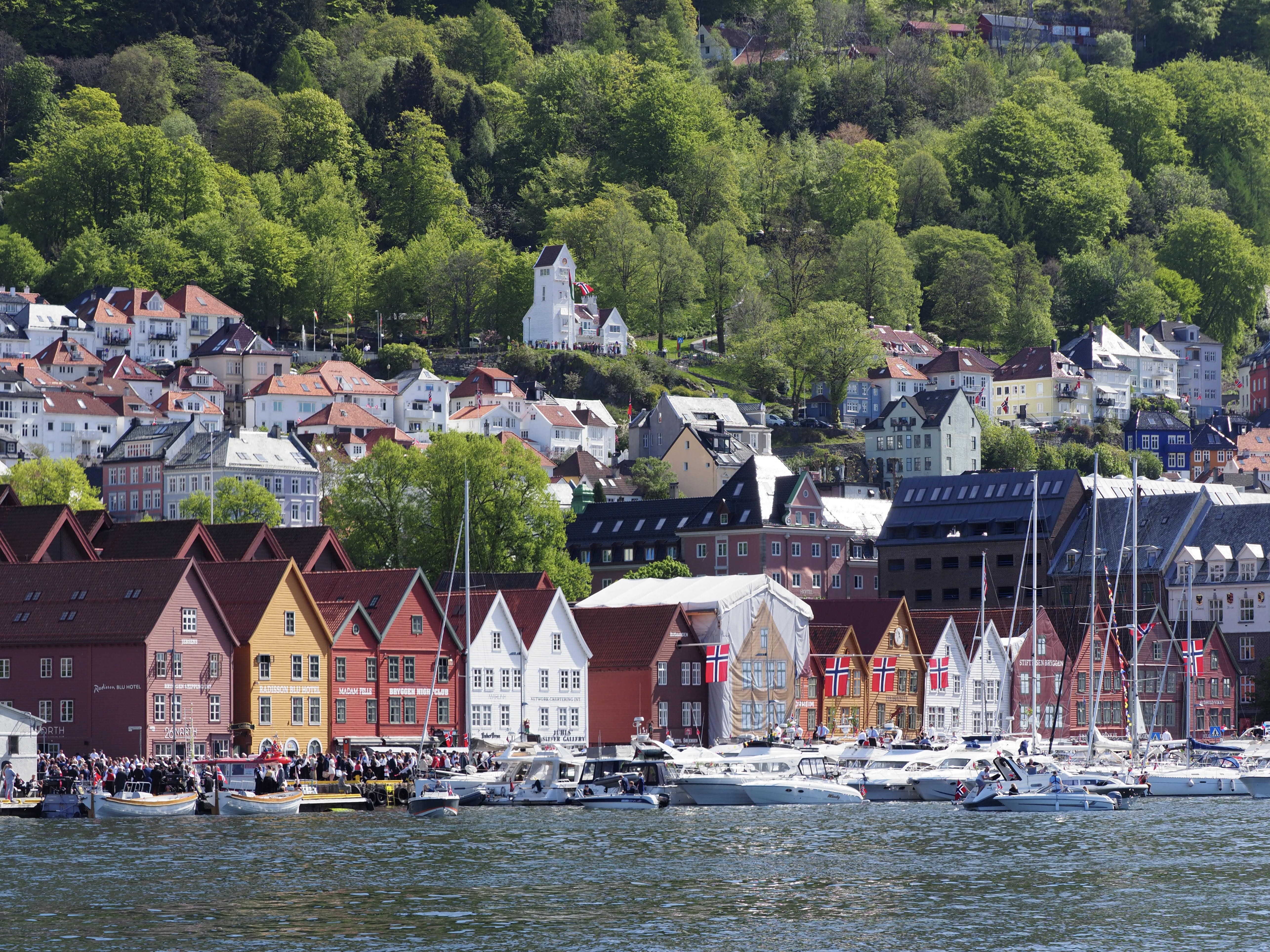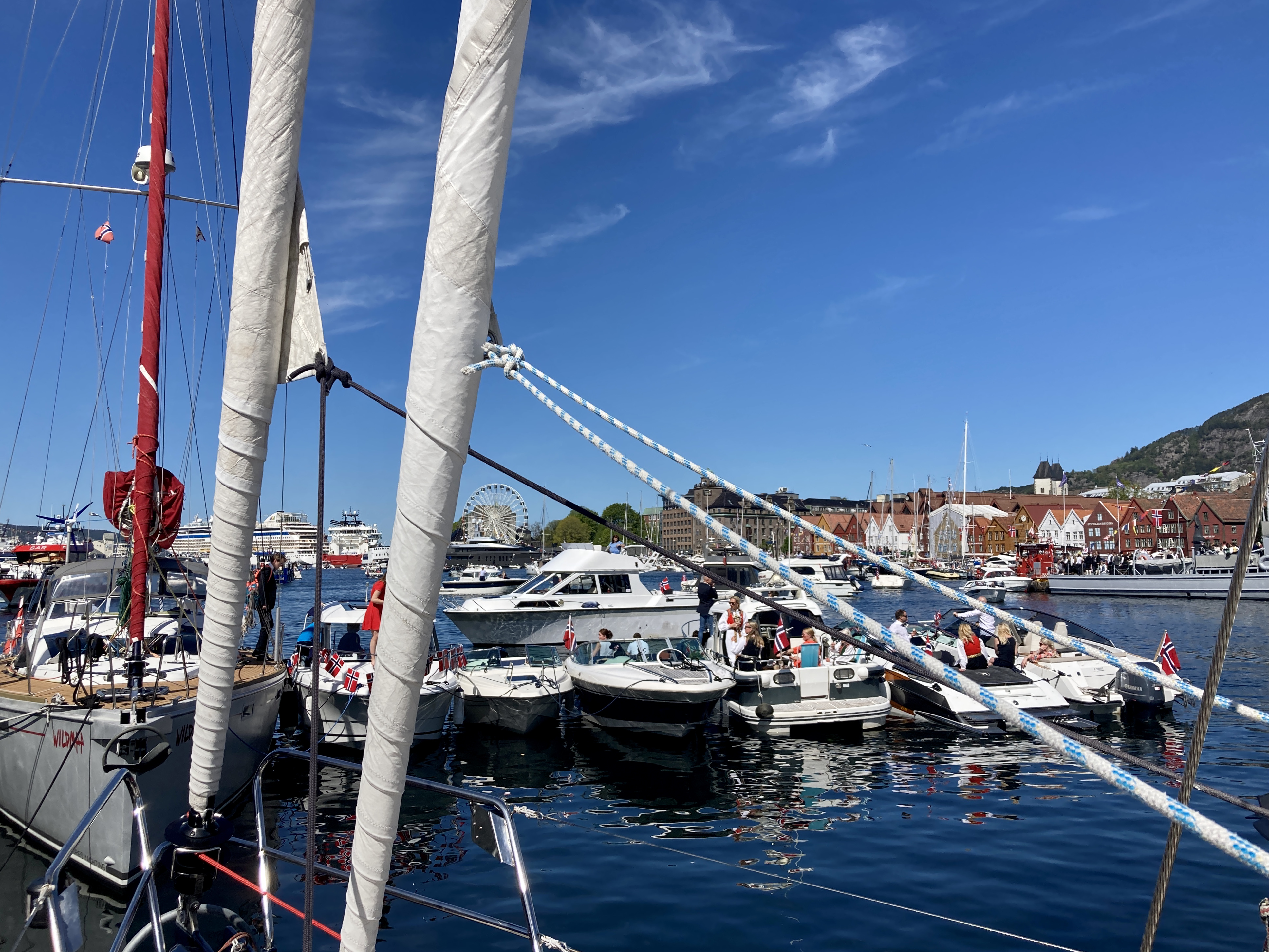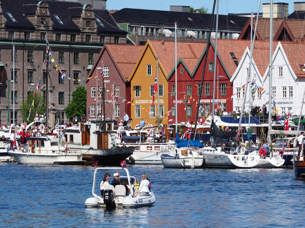 15 mei 2022. Al van ver zie ik ze door de verrekijker, de iconische rood en oranje huizen van de wijk Bryggen in Bergen. Maar wat ik ook zie, is dat de kade eronder afgeladen vol ligt met boten, rijen dik. De havenmeester verwijst ons naar de kade bij de Fiskeforget, waar we nog net langszij kunnen afmeren bij een Zwitserse zeilboot, Raroia. Wat we nog niet weten, is dat we hier op de eerste rij gaan liggen voor hét grootste feest in Noorwegen, de Syttende Mai… Een nationale feestdag als geen ander, Hipp Hipp Hurra!