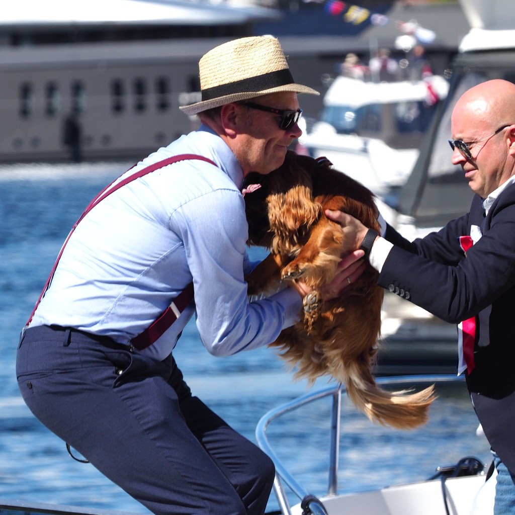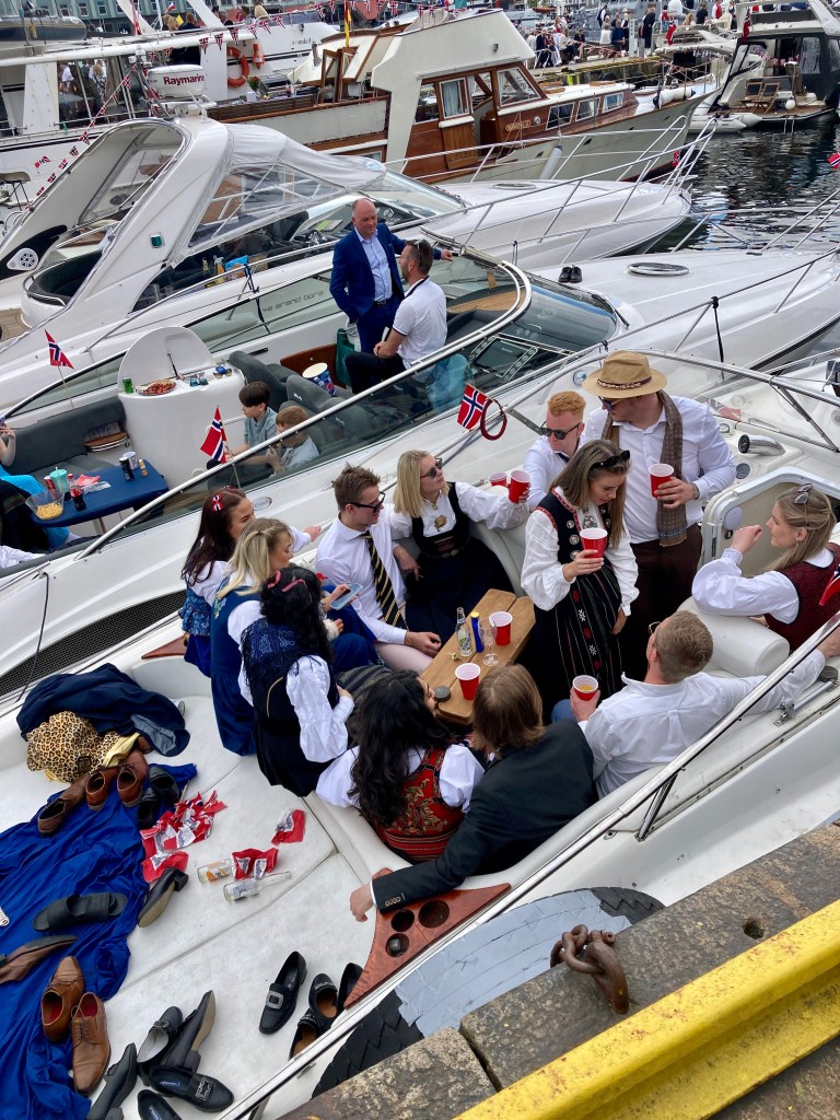 Het toenemende alcoholpercentage levert grappige taferelen op, we komen ogen tekort. Op sommige bootjes zitten dubbel zoveel mensen als die bootjes aankunnen waardoor ze vervaarlijk gaan hellen. Licht of minder licht benevelde dames in bunad en op schoenen met hakken klauteren over boten, soms acht rijen dik. Een hondje wordt doorgegeven.