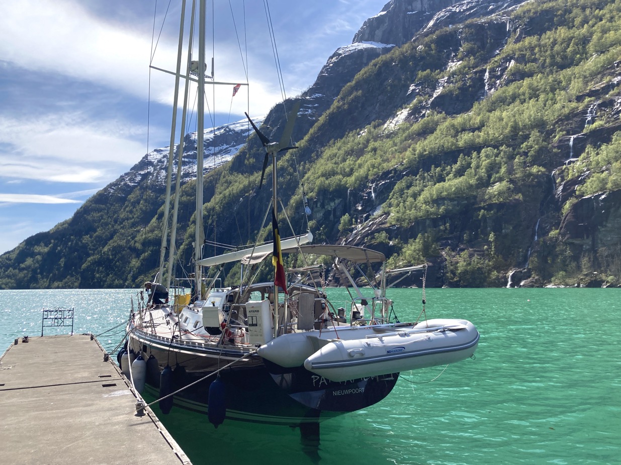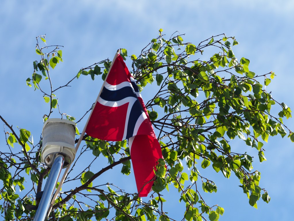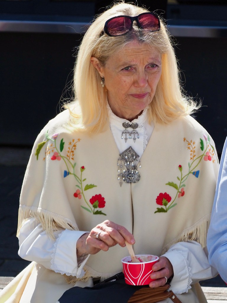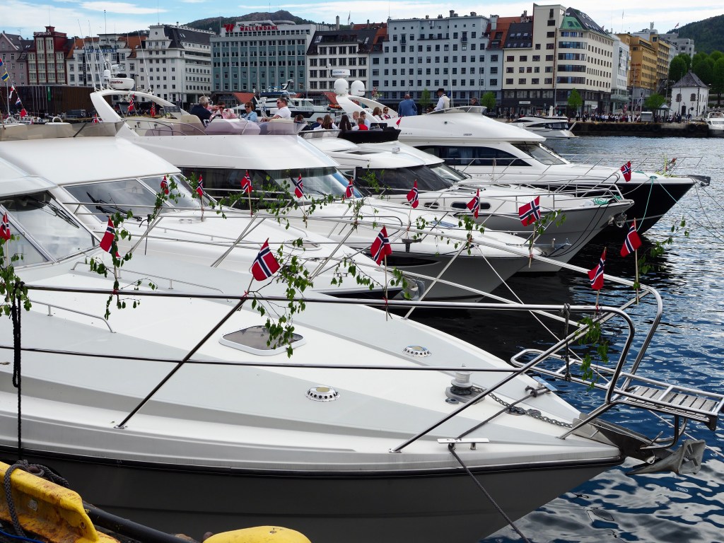 Vanuit huizen en vanop balkons klinkt gezang en handgeklap, jongeren vieren feestjes en het gaat er luidruchtig aan toe. Gratulerer med dagen! klinkt het overal. Gefeliciteerd! Noren beginnen deze dag traditioneel met een royaal ontbijt. Eitjes en zalm, aardbeien en champagne. Verder eten ze de hele dag ijs, veel ijs. En ze blijven drinken… Ik denk aan de wijnkaart van Fjellskål, het visrestaurant waarvoor we afgemeerd liggen. Gisteren dachten we nog dat 199 kr (19,90 €) voor een Sancerre toch niet gek was, tot we zagen dat de prijzen op de kaart per glas waren… Nu zit het restaurant tjokvol en op elke tafel staan flessen wijn en champagne. Hier wordt omzet gedraaid.