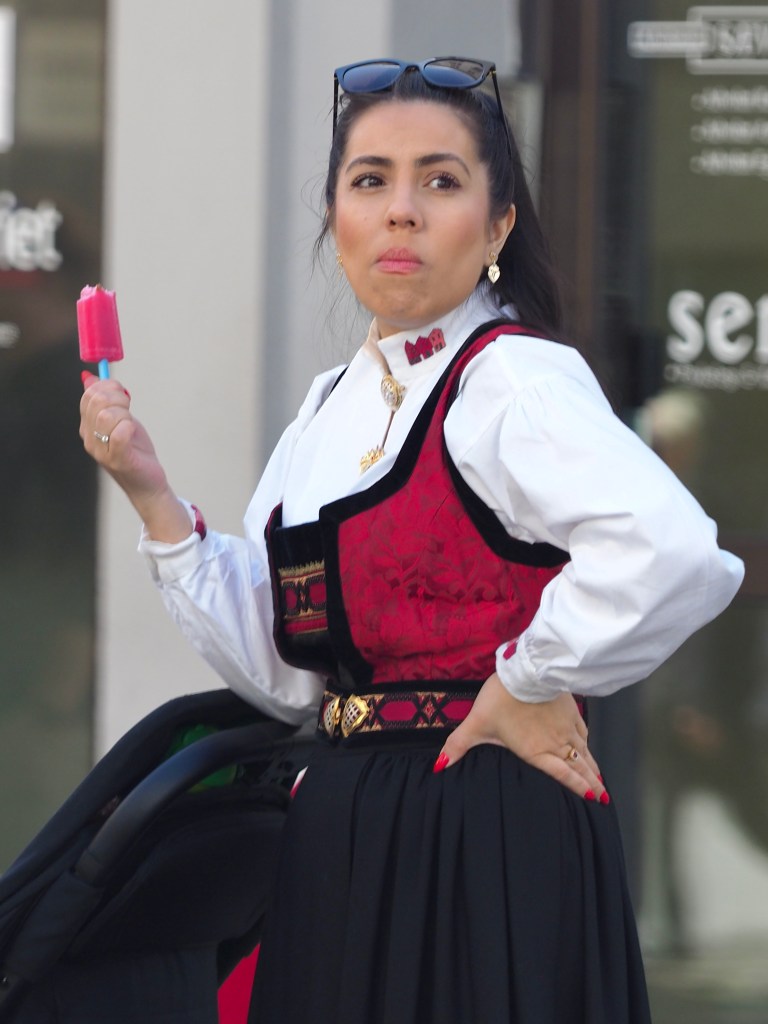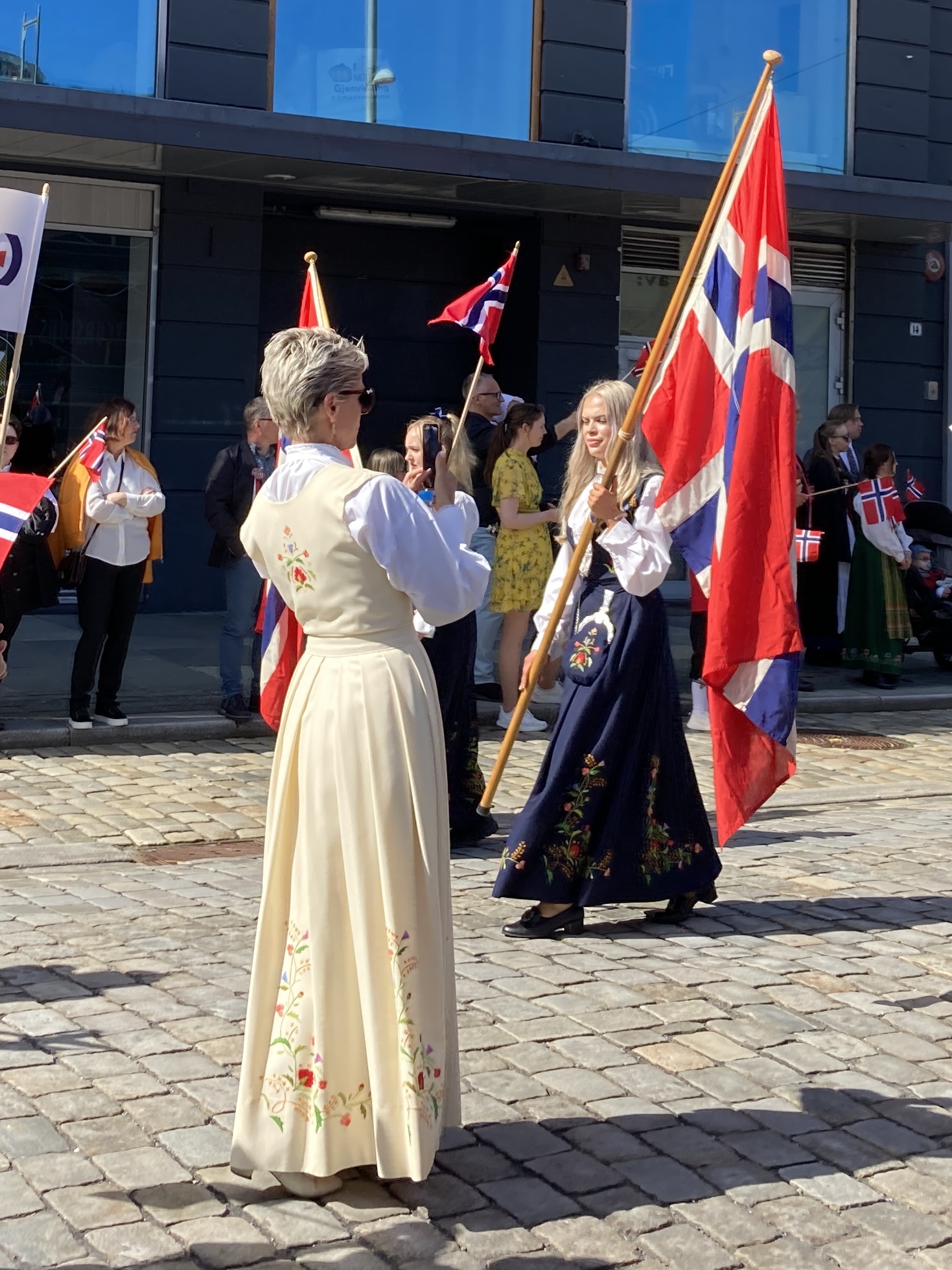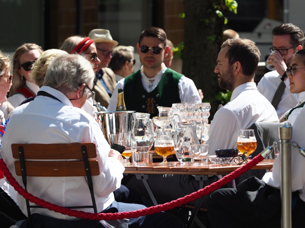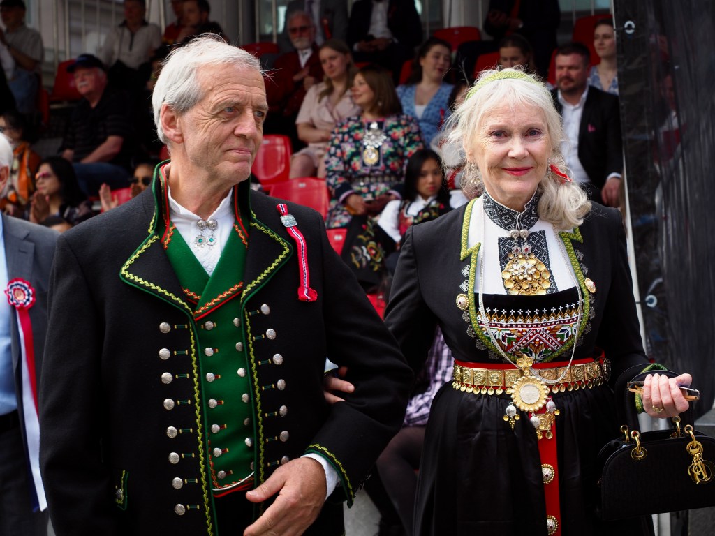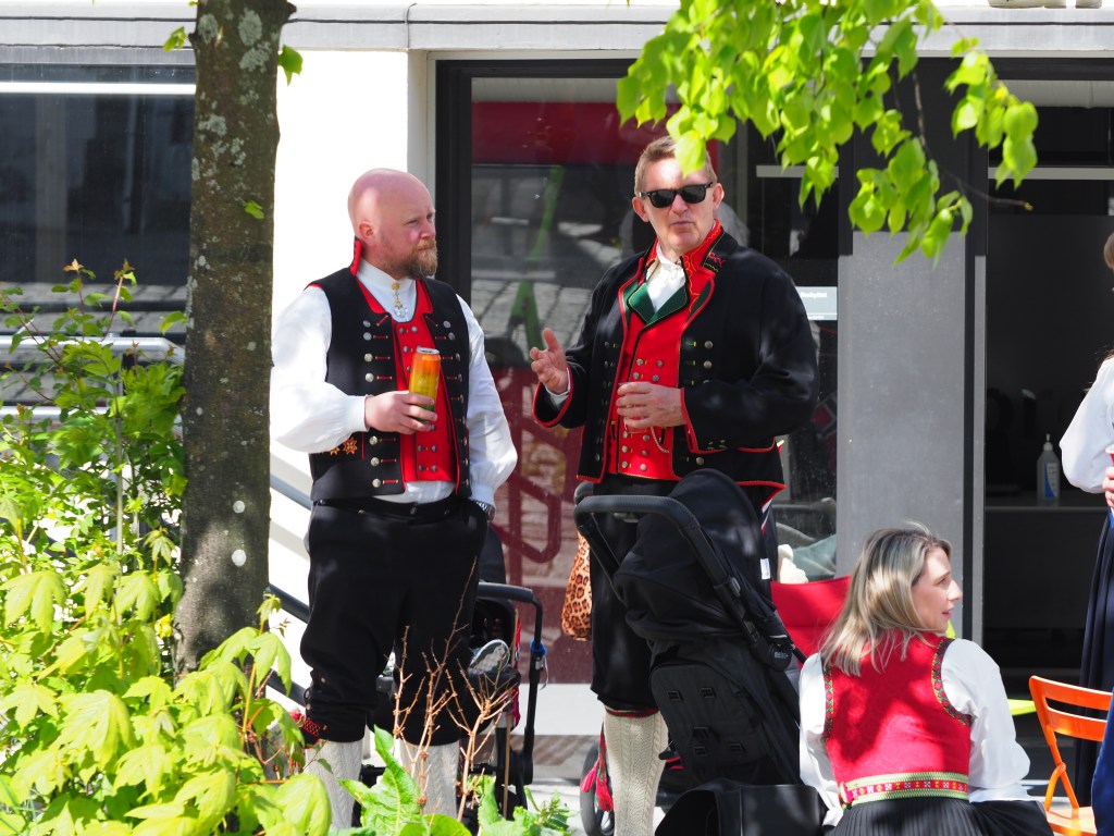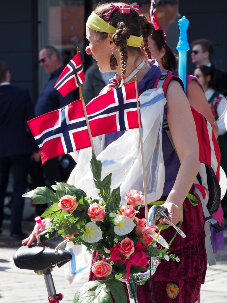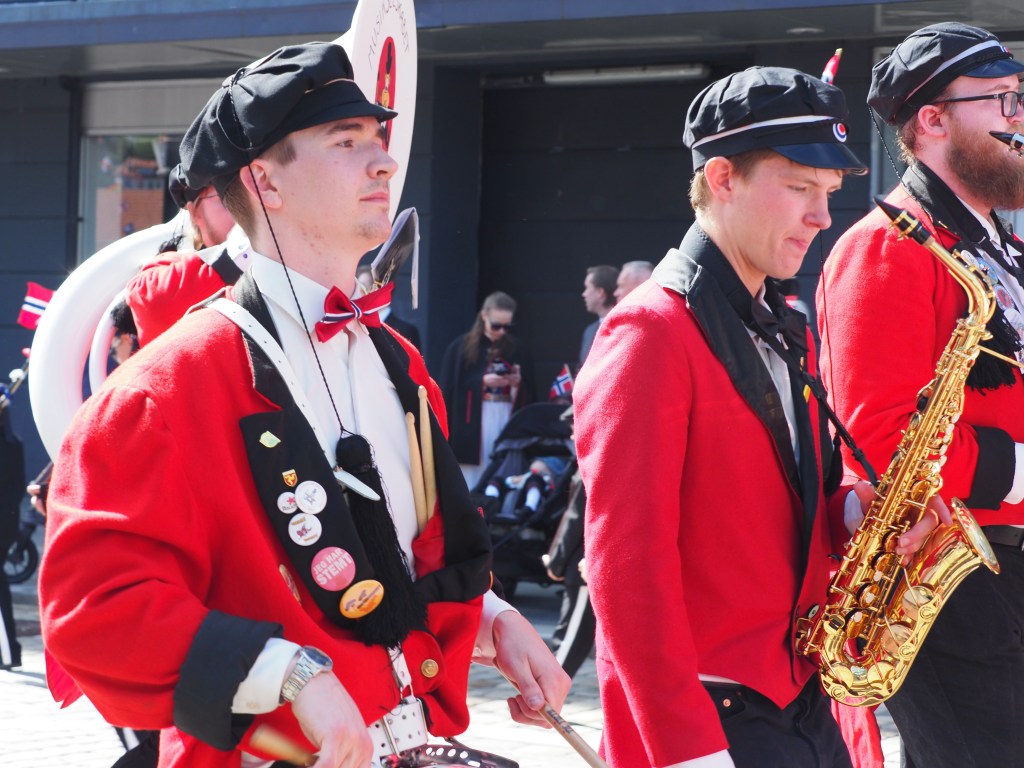 Dwars door de stad paraderen niet veel later alle denkbare verenigingen, opgedoft en met een onwaarschijnlijk enthousiasme. Scholen, studentenkringen, verpleegsters, brandweerlui, politie, zeelui… Maar ook kinderen, soms in militair aandoende outfits, houten kruisbogen of geweren over de schouder… Iedereen, jong en oud, wappert driftig met Noorse vlaggetjes en velen dragen de Bunad, de traditionele kledij. Er zijn ook fanfares, veel fanfares. De parcours van parades en fanfares kruisen elkaar, tromgeroffel en trompetten versmelten in een uitbundige kakafonie.