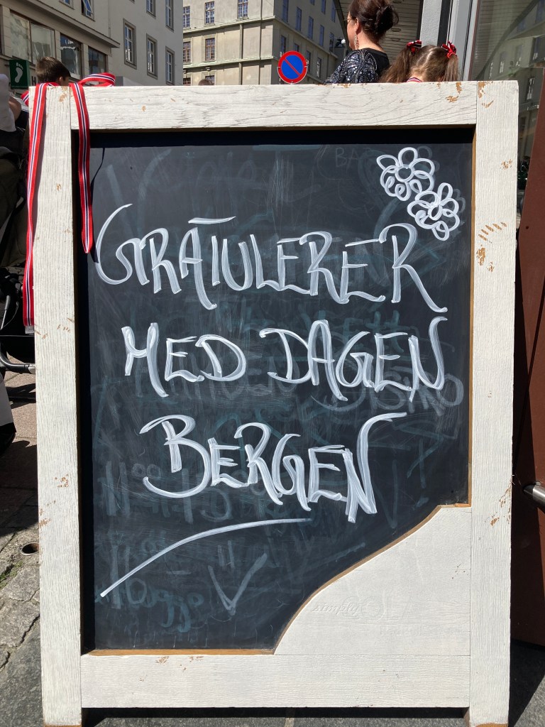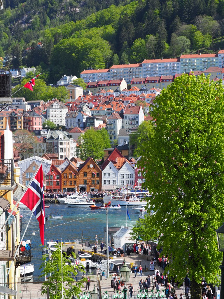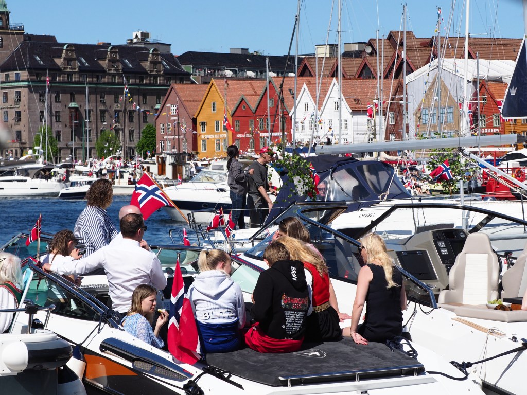 In de natste stad van Europa is het stralend lenteweer, de zon straalt aan een helblauwe hemel. Er volgen nog een vliegshow, een optocht met oldtimers en een botenparade. Alle boten zijn versierd met Noorse vlaggen en berkengroen of bjørk, symbool voor de ontluikende lente, nieuw leven, energie. Iets waar men hier in het Noorden, na een lange donkere winter, reikhalzend naar uitkijkt. Of dit groter is dan Kerstmis vraag ik iemand. Het is vooral anders, weet de dame me te vertellen, Kerstmis is intiem, dit is uitbundig, het speelt zich buiten af en iedereen komt samen. Het is bovendien de eerste keer sinds Covid dat de feestelijkheden weer mogen doorgaan.