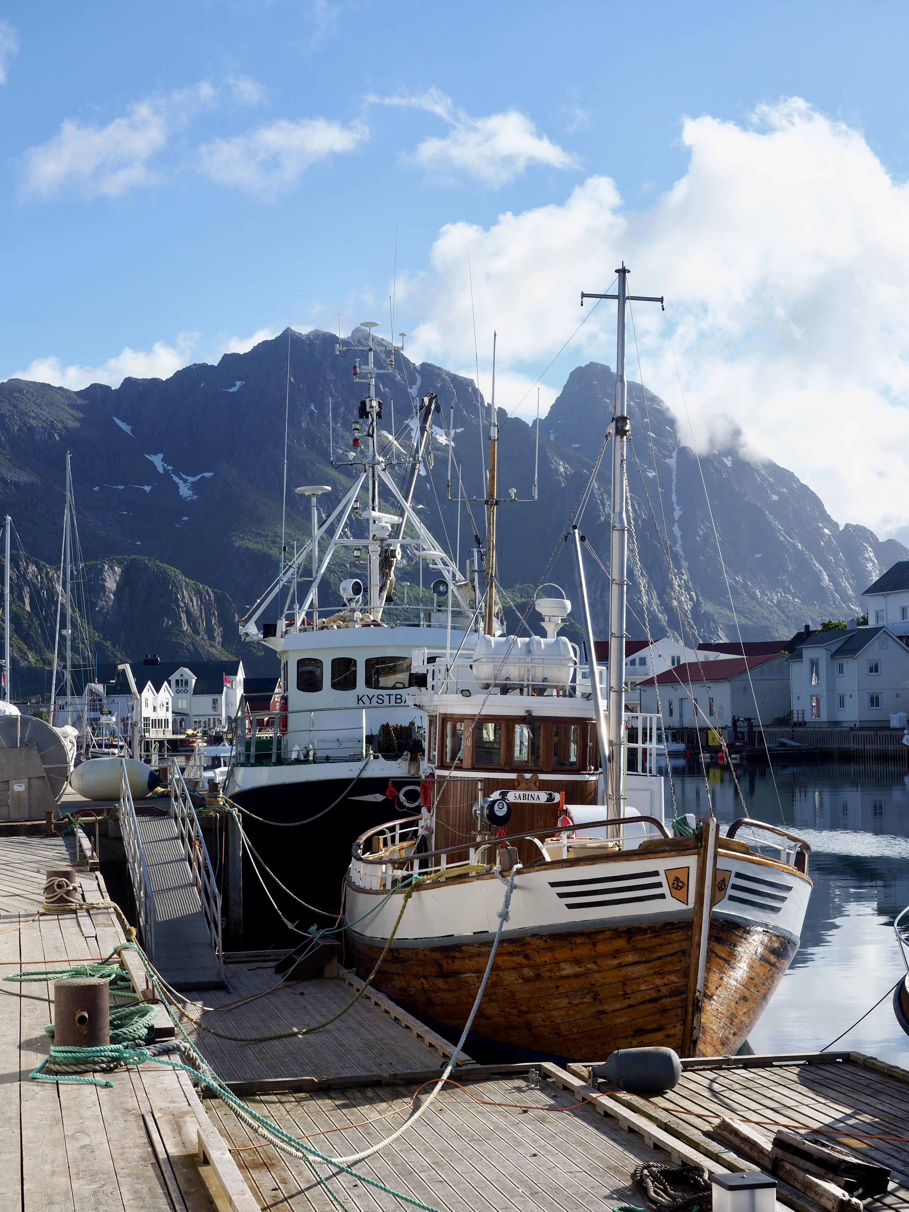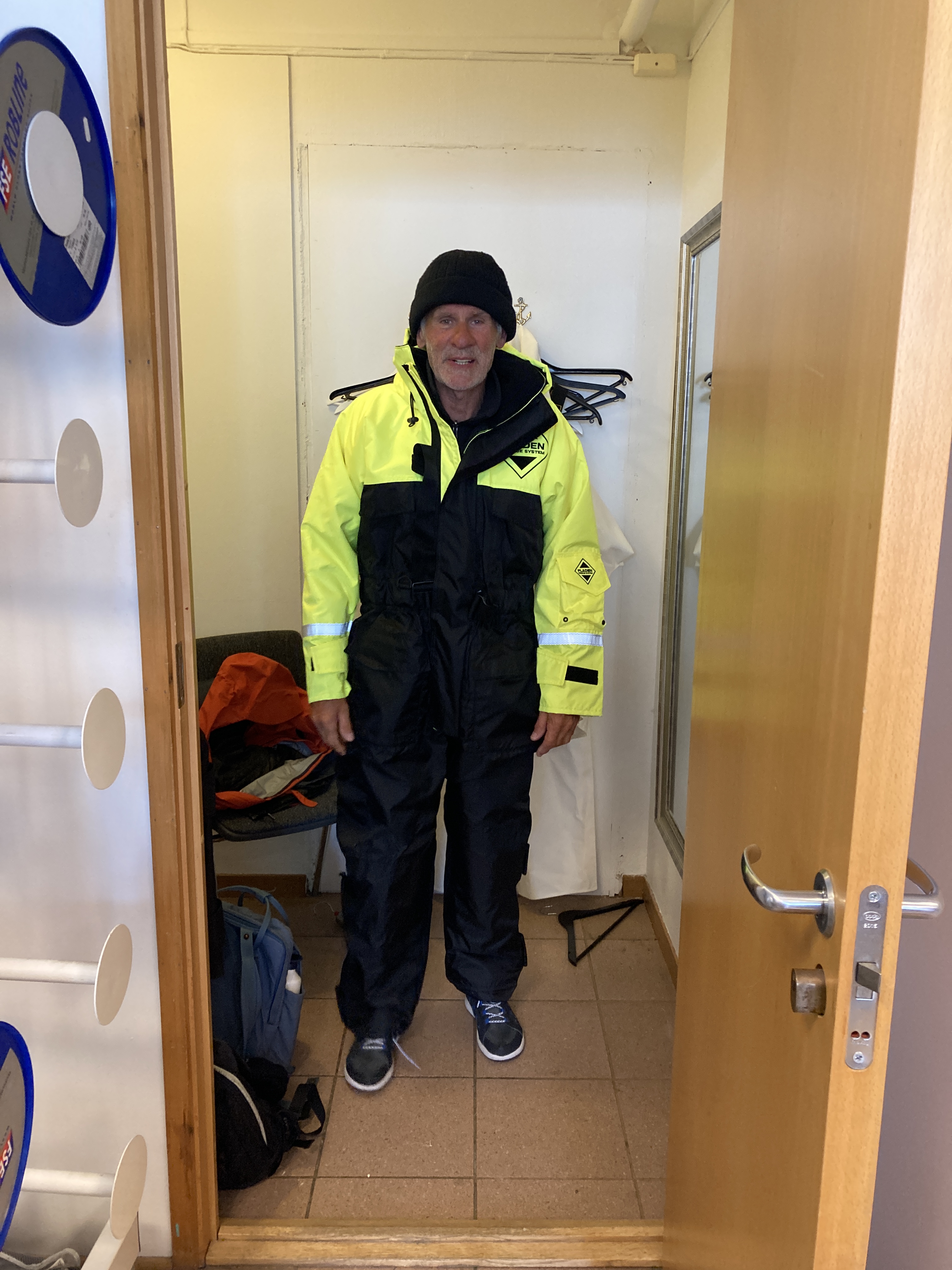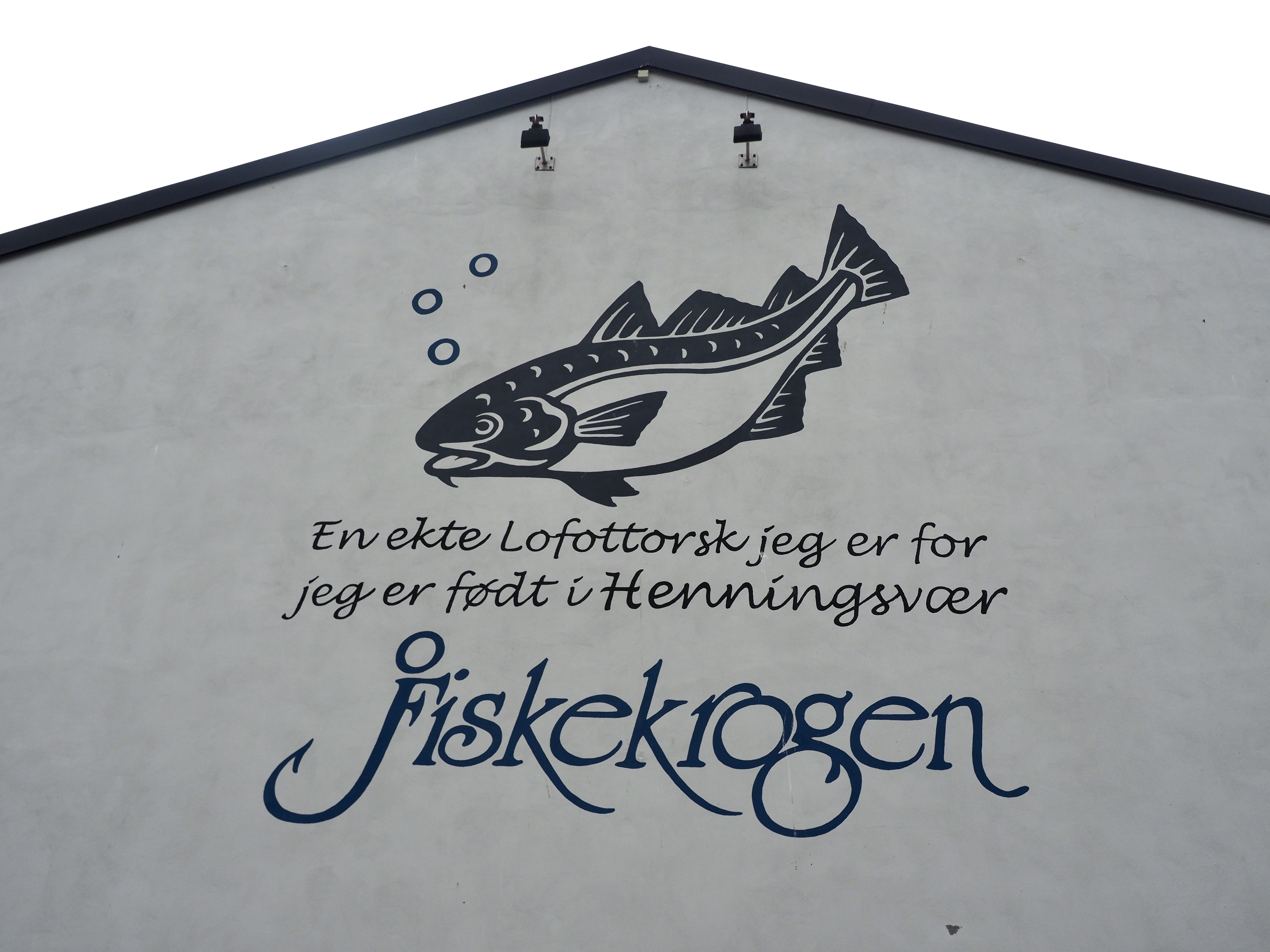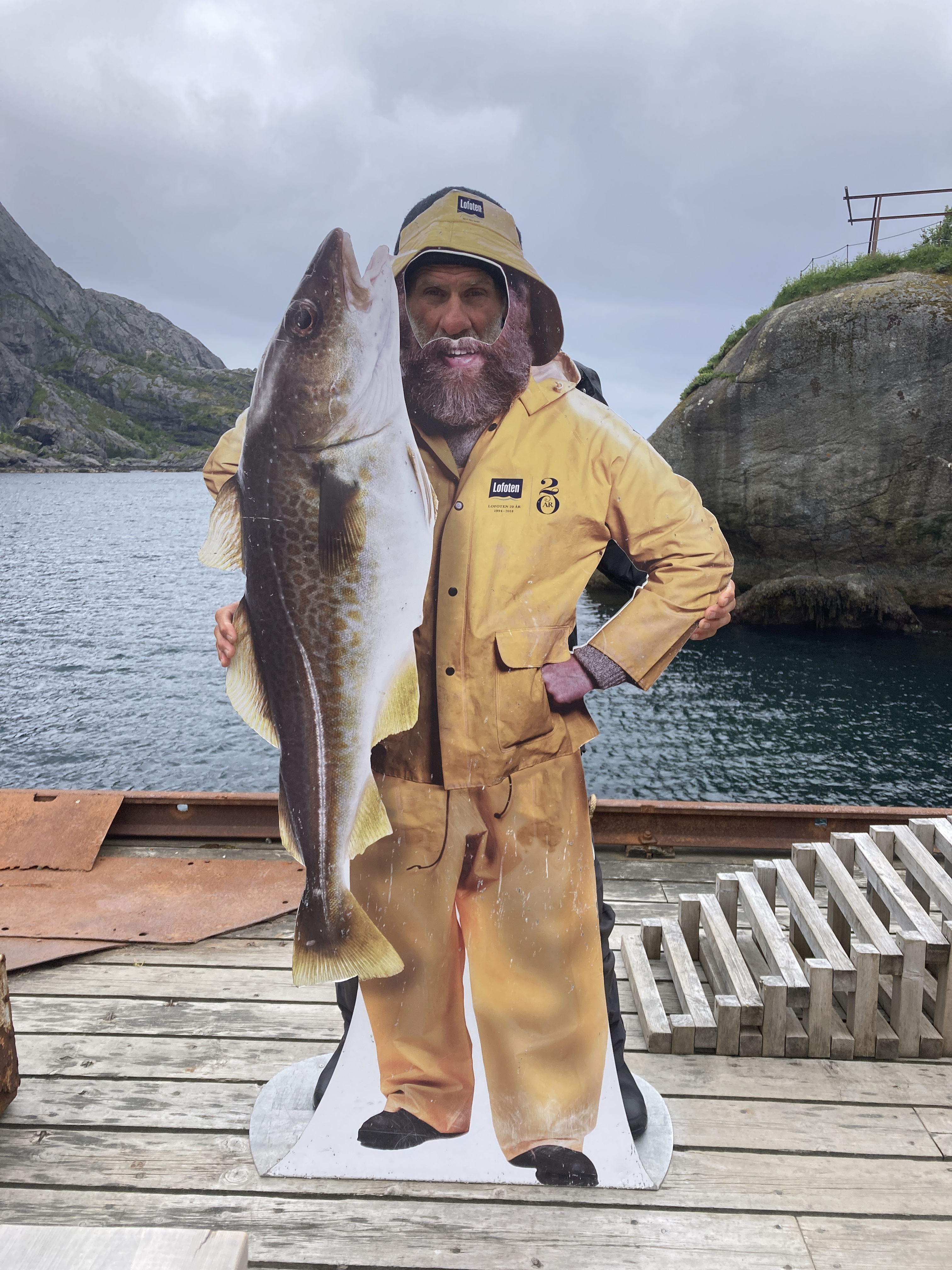 Het is veel te warm en het pashokje van Felstad, Fiskeutsyr is krap. Fiskeutsyr, vrij vertaald, ‘gerief voor vissers’. We zijn in Svolvær, de grootste stad van de Lofoten. Nee, we zijn hier niet met onze boot gekomen maar met de ferry. Ik zweet me te pletter in de zwart met fluogele overall. Nadat we allebei een gevecht geleverd hebben, besluiten we om ze te kopen. Elk een pak van Fladen, de iconische water- en winddichte overall met drijfvermogen zoals alle vissers hier dragen. Ze zijn te omvangrijk voor gewone plastic winkeltassen en de man vraagt bezorgd of we het niet vervelend vinden om ze zo, zonder verpakking mee te nemen. Daar lopen we door de stad, elk met een omvangrijk pak als een bewusteloze drenkeling over de arm.