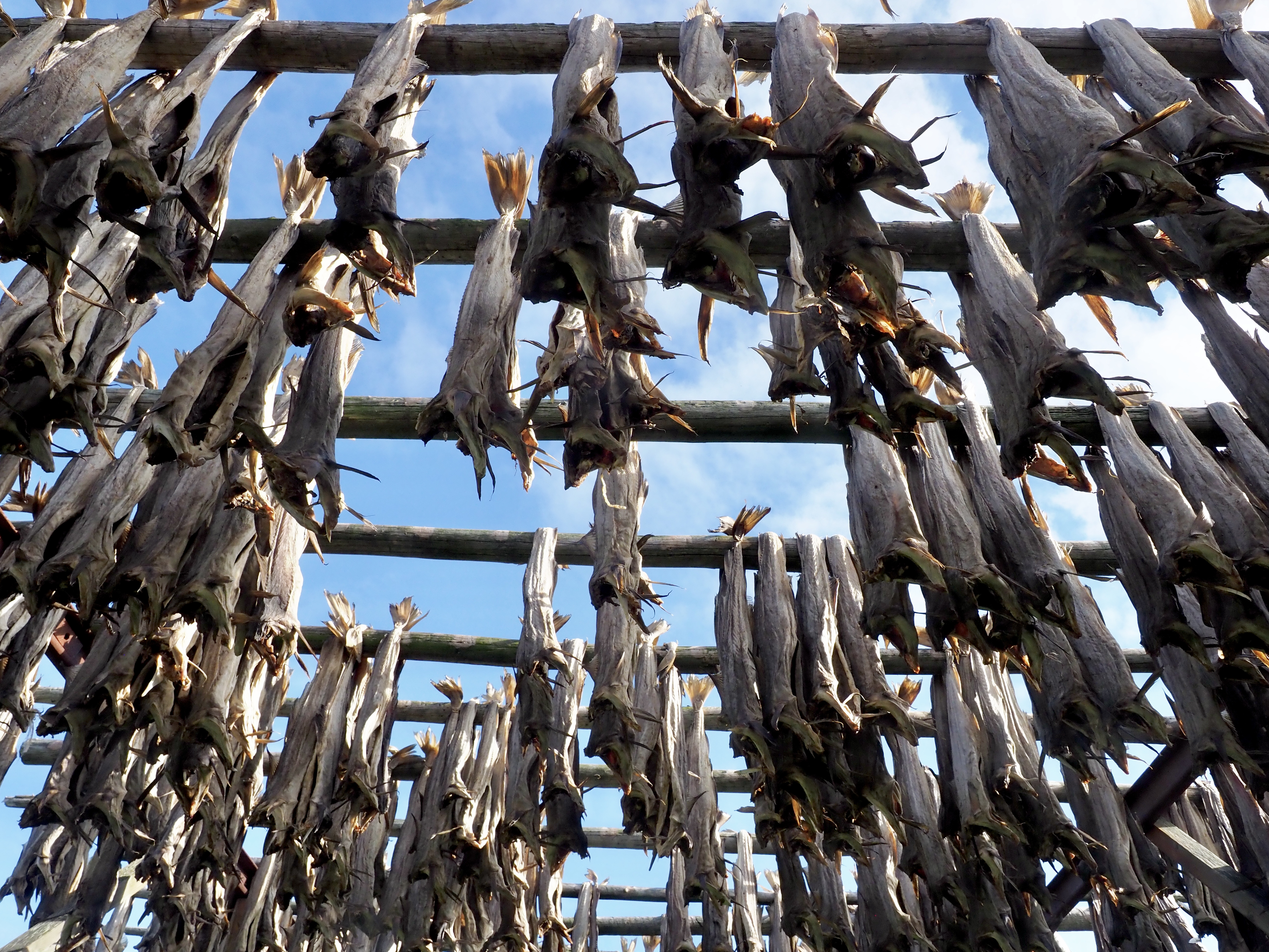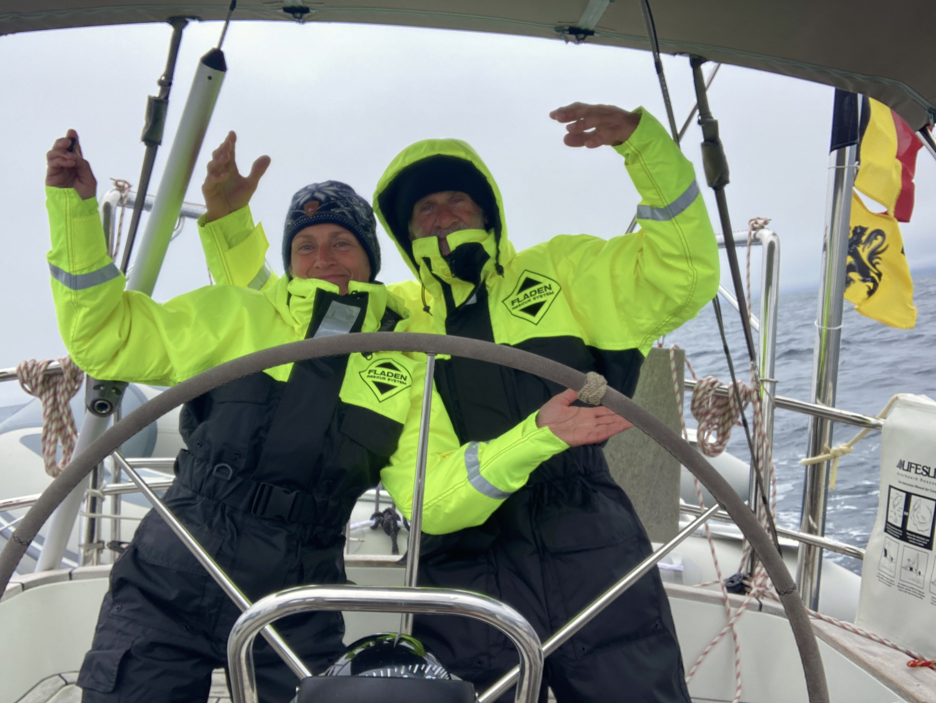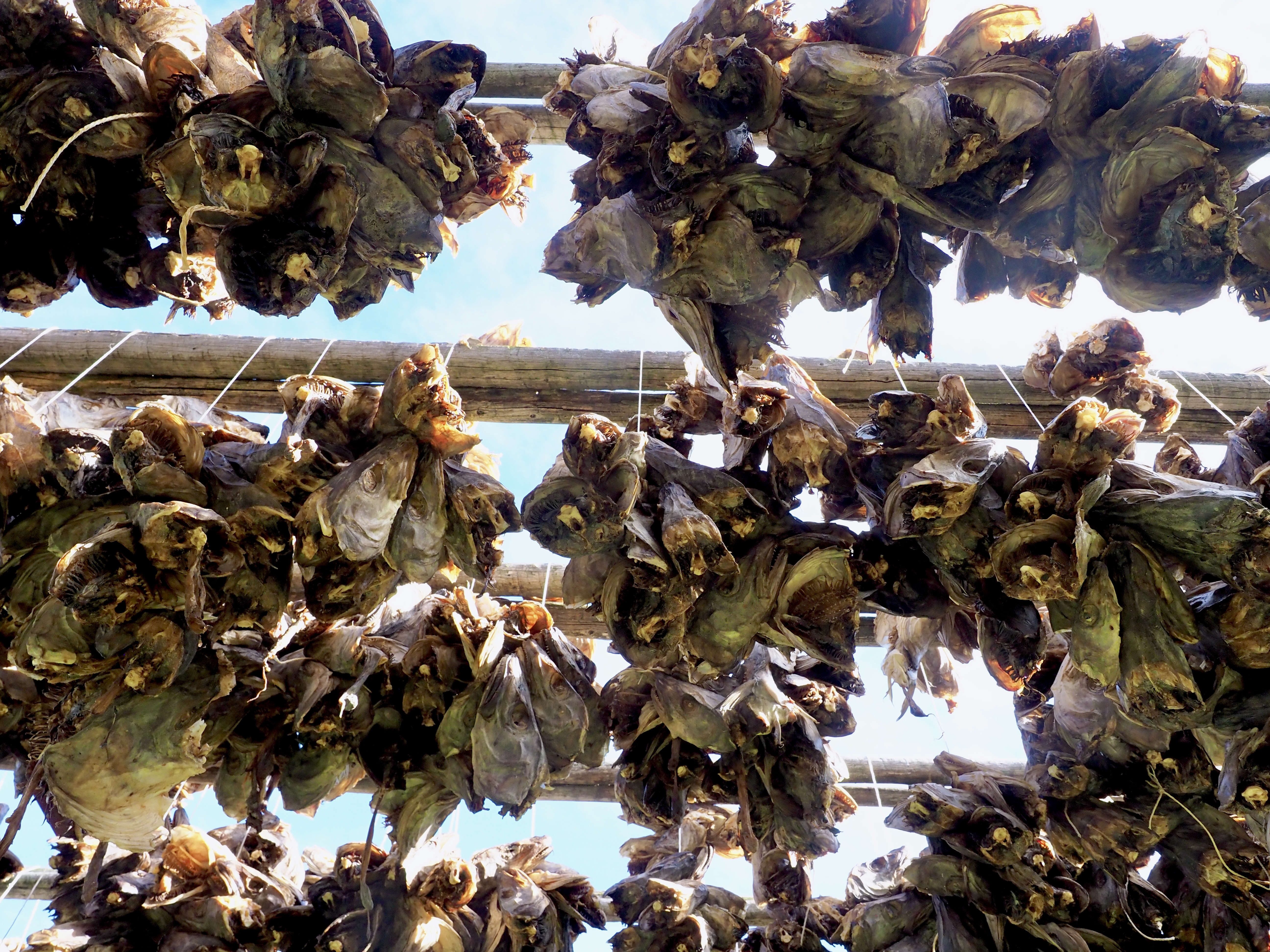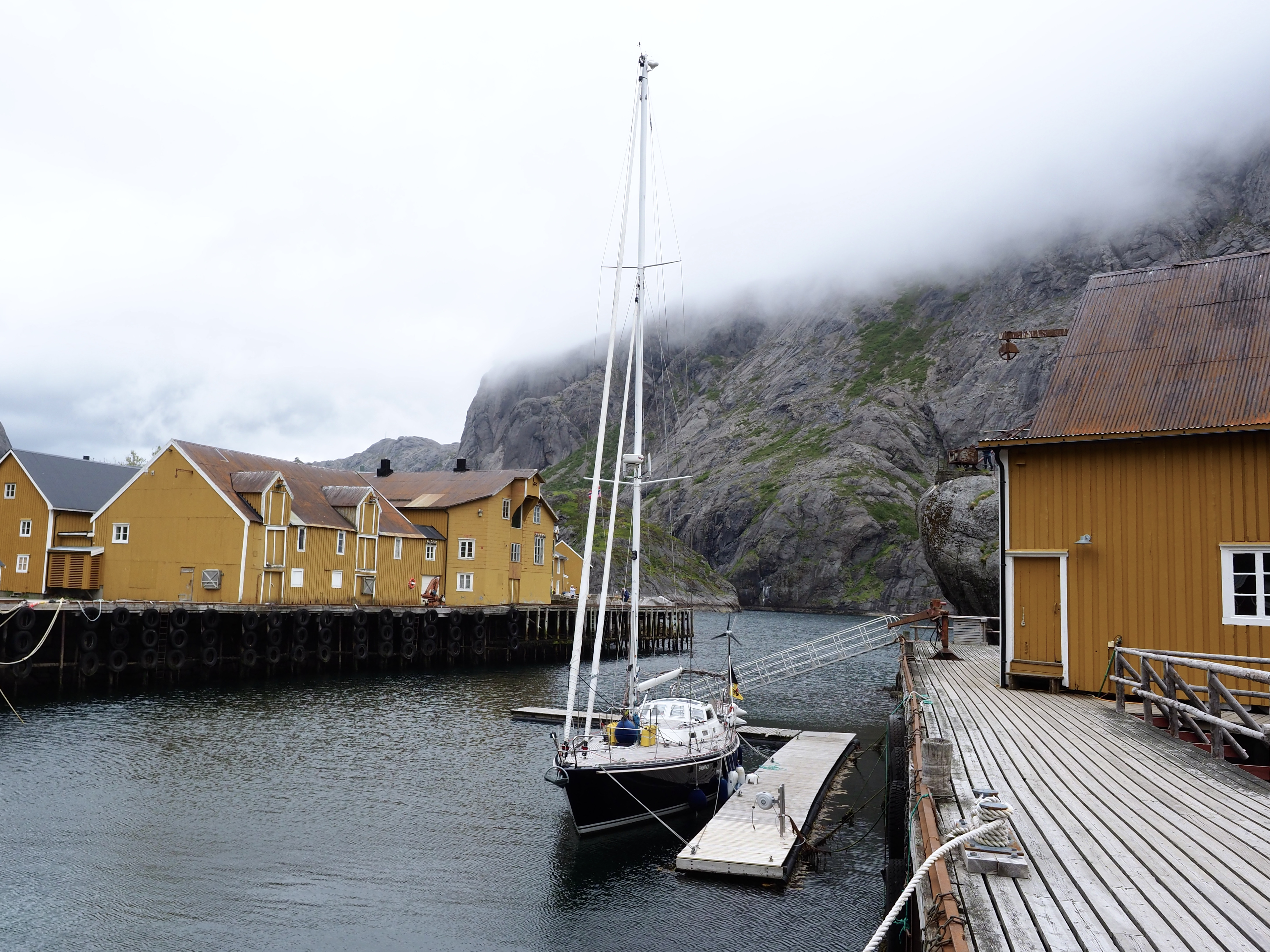 Het is veel te warm en het pashokje van Felstad, Fiskeutsyr is krap. Fiskeutsyr, vrij vertaald, ‘gerief voor vissers’. We zijn in Svolvær, de grootste stad van de Lofoten. Nee, we zijn hier niet met onze boot gekomen maar met de ferry. Ik zweet me te pletter in de zwart met fluogele overall. Nadat we allebei een gevecht geleverd hebben, besluiten we om ze te kopen. Elk een pak van Fladen, de iconische water- en winddichte overall met drijfvermogen zoals alle vissers hier dragen. Ze zijn te omvangrijk voor gewone plastic winkeltassen en de man vraagt bezorgd of we het niet vervelend vinden om ze zo, zonder verpakking mee te nemen. Daar lopen we door de stad, elk met een omvangrijk pak als een bewusteloze drenkeling over de arm.