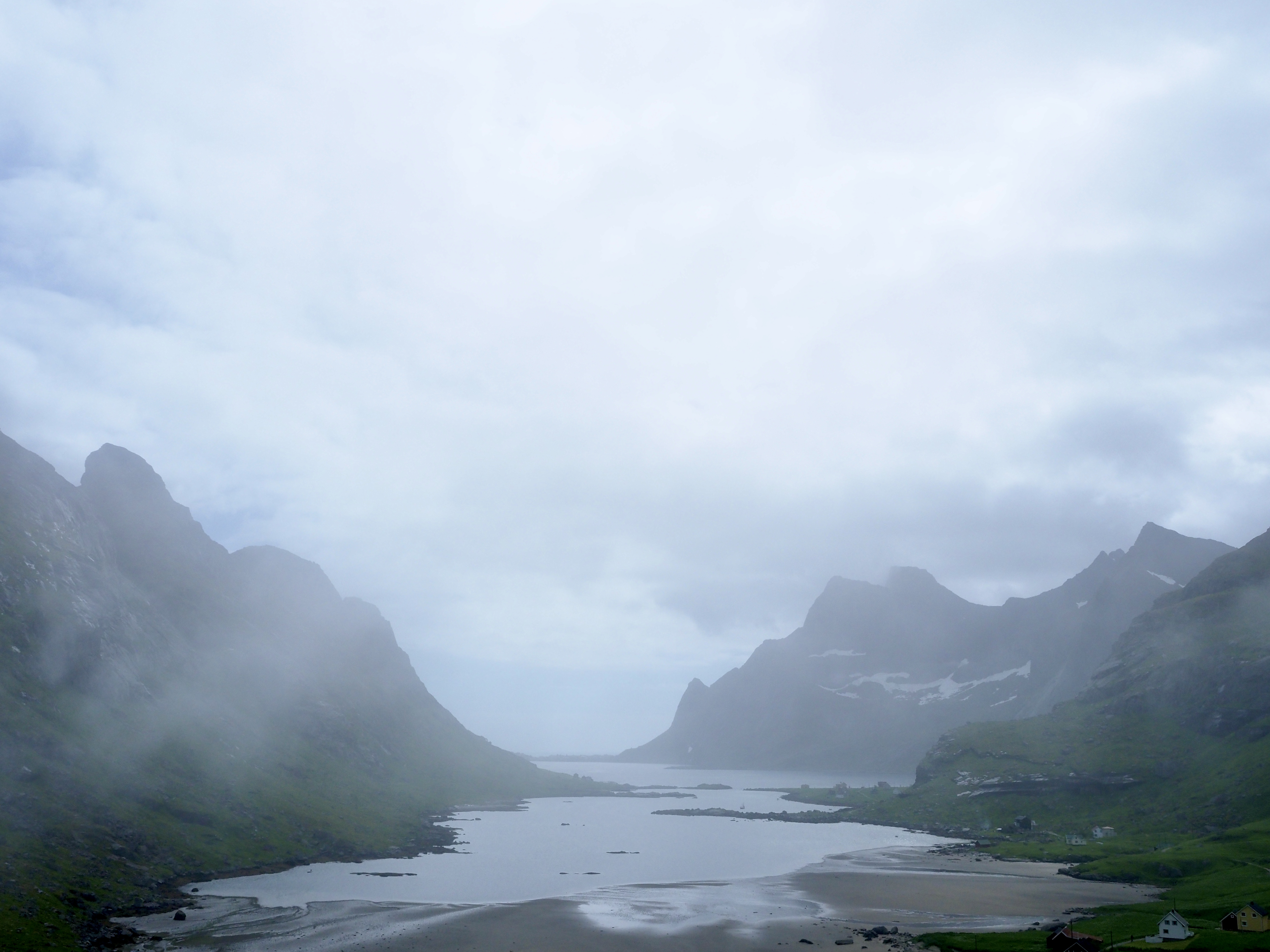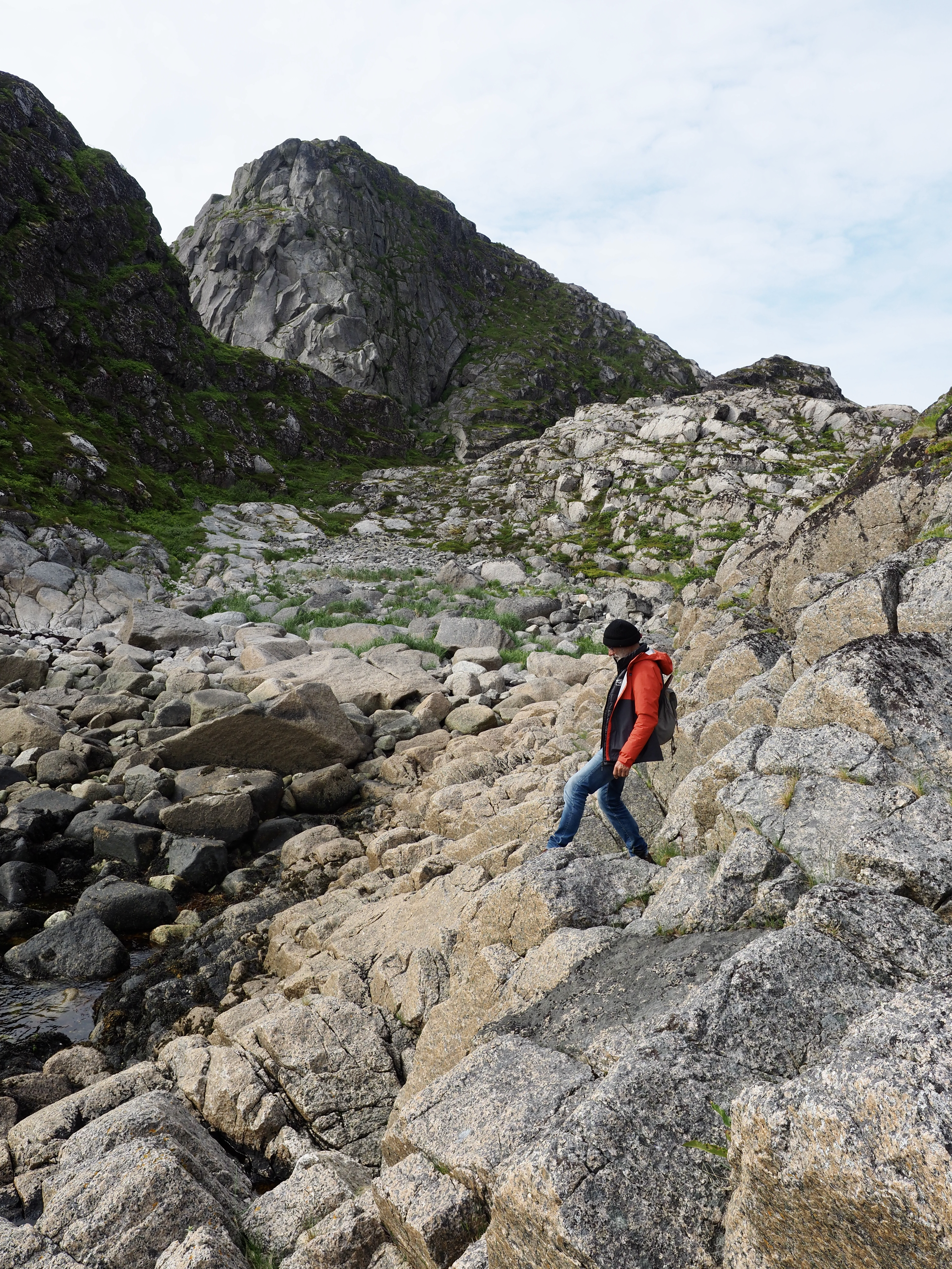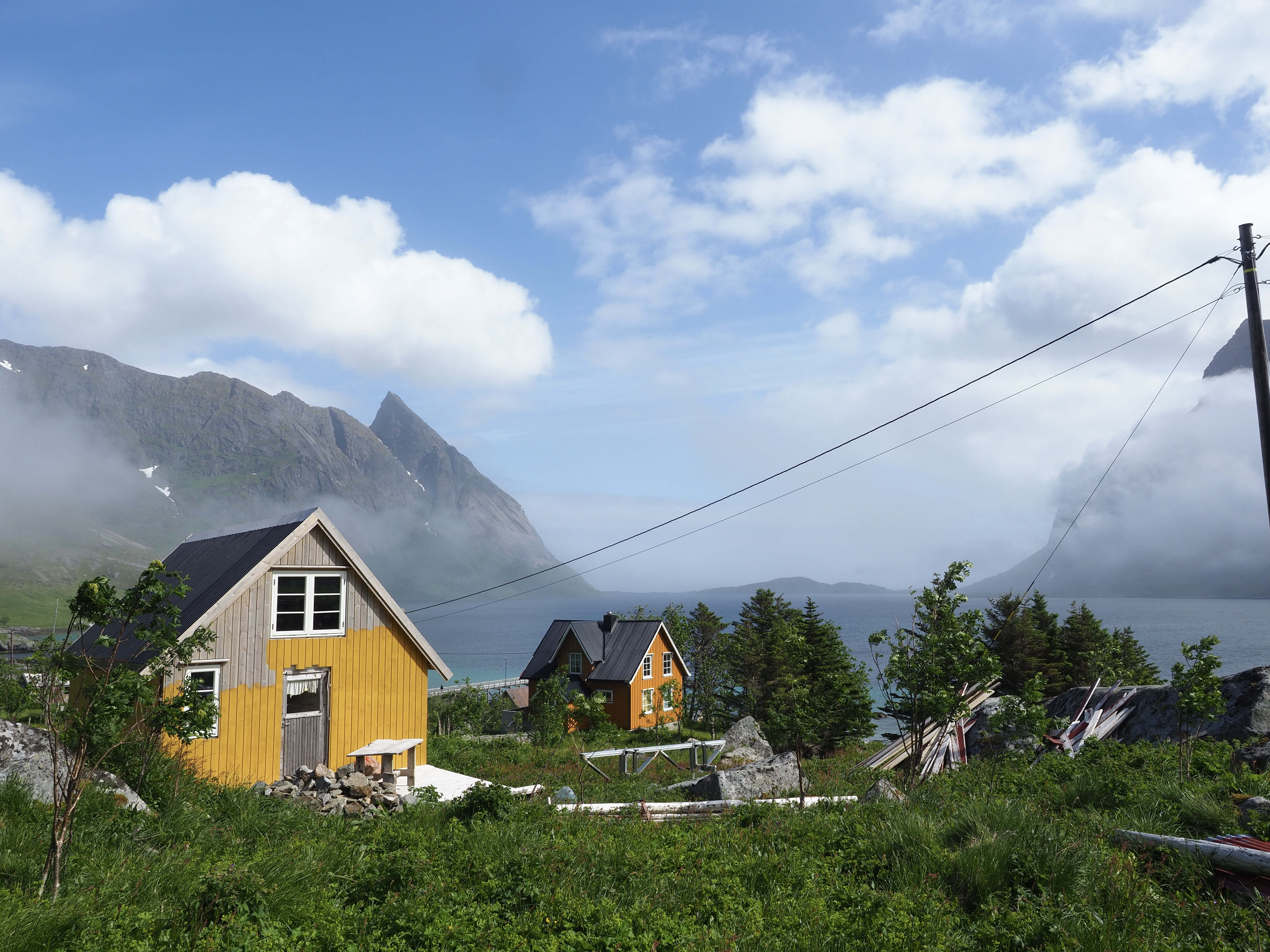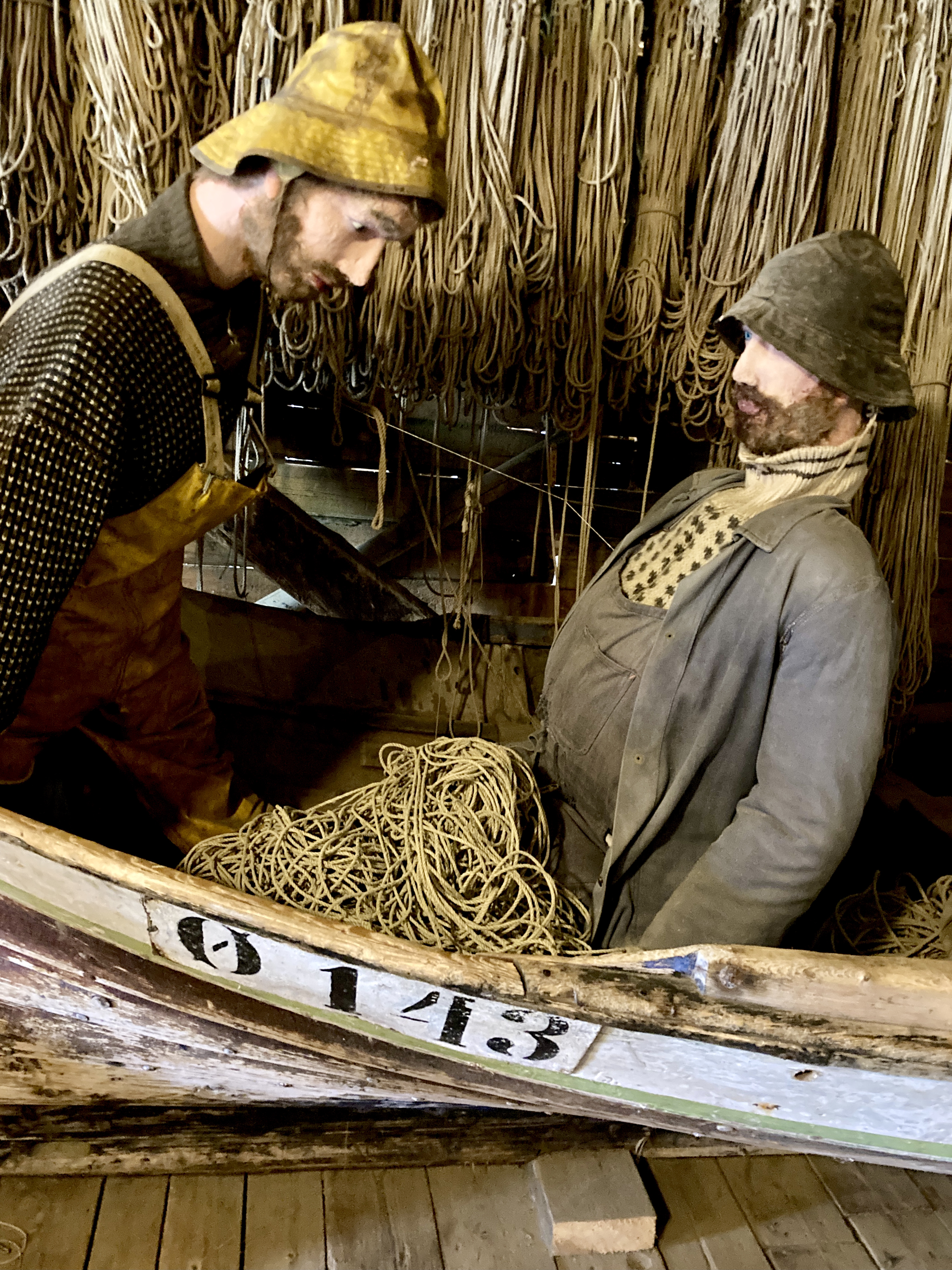 Het is veel te warm en het pashokje van Felstad, Fiskeutsyr is krap. Fiskeutsyr, vrij vertaald, ‘gerief voor vissers’. We zijn in Svolvær, de grootste stad van de Lofoten. Nee, we zijn hier niet met onze boot gekomen maar met de ferry. Ik zweet me te pletter in de zwart met fluogele overall. Nadat we allebei een gevecht geleverd hebben, besluiten we om ze te kopen. Elk een pak van Fladen, de iconische water- en winddichte overall met drijfvermogen zoals alle vissers hier dragen. Ze zijn te omvangrijk voor gewone plastic winkeltassen en de man vraagt bezorgd of we het niet vervelend vinden om ze zo, zonder verpakking mee te nemen. Daar lopen we door de stad, elk met een omvangrijk pak als een bewusteloze drenkeling over de arm.