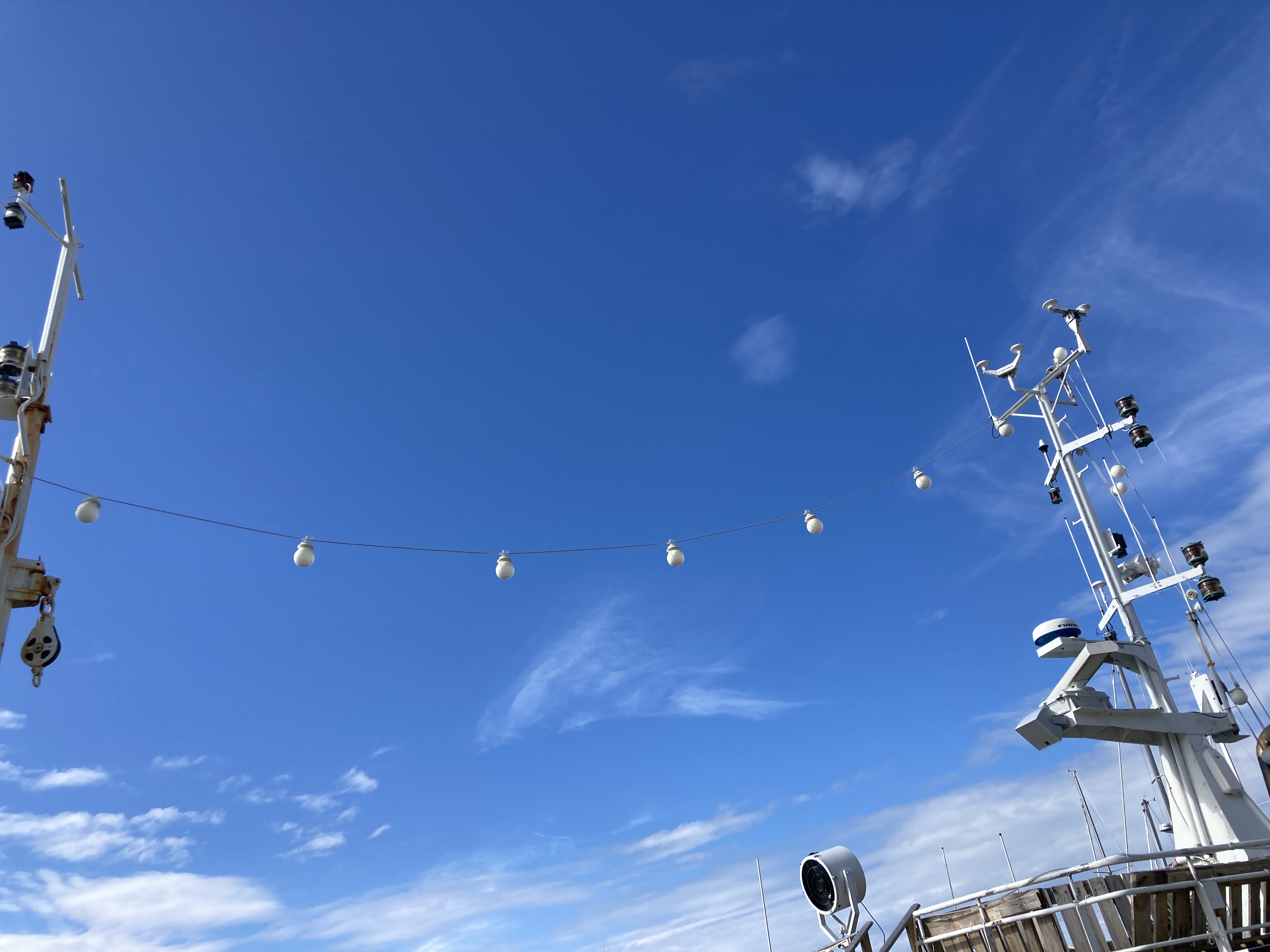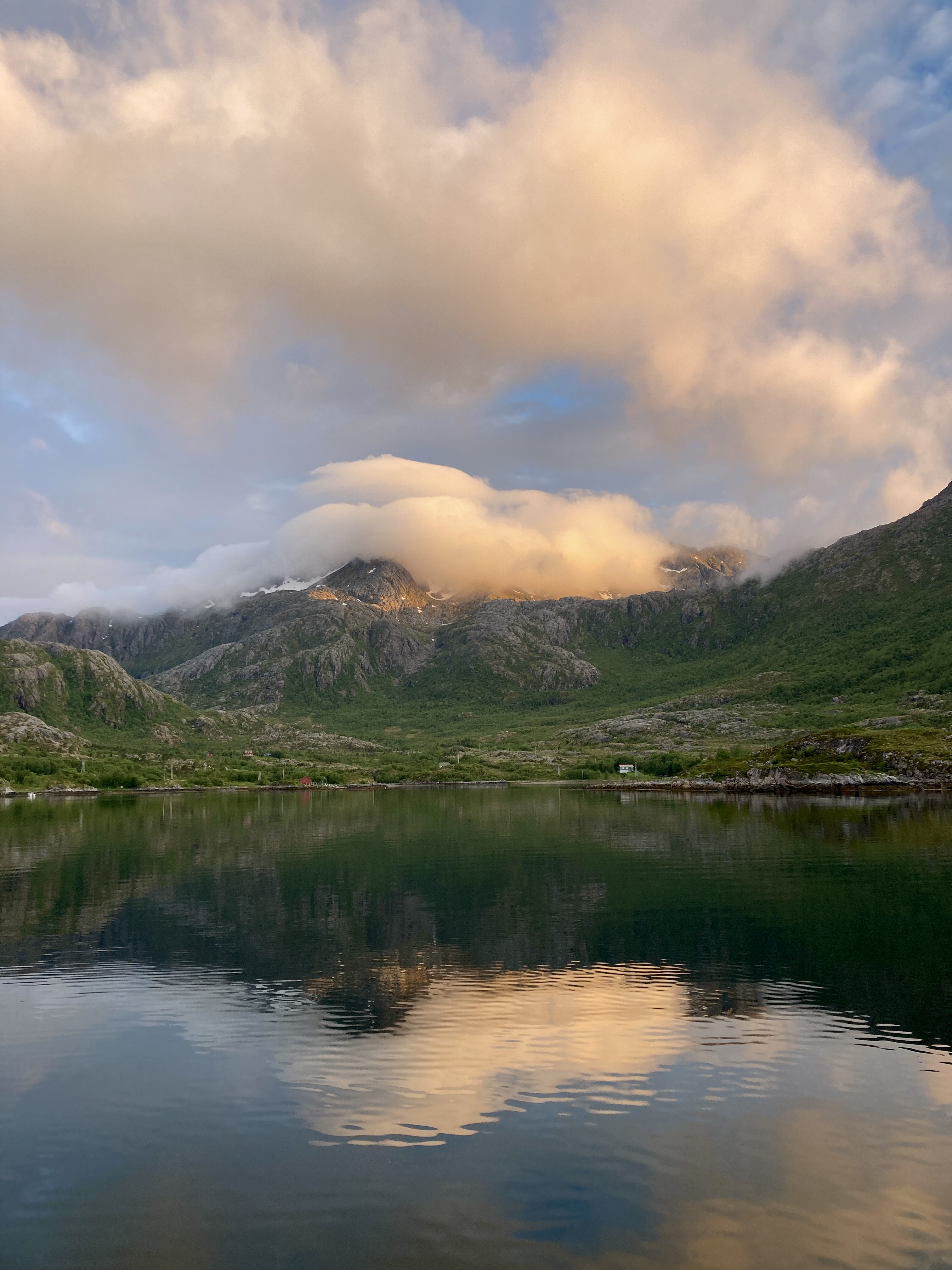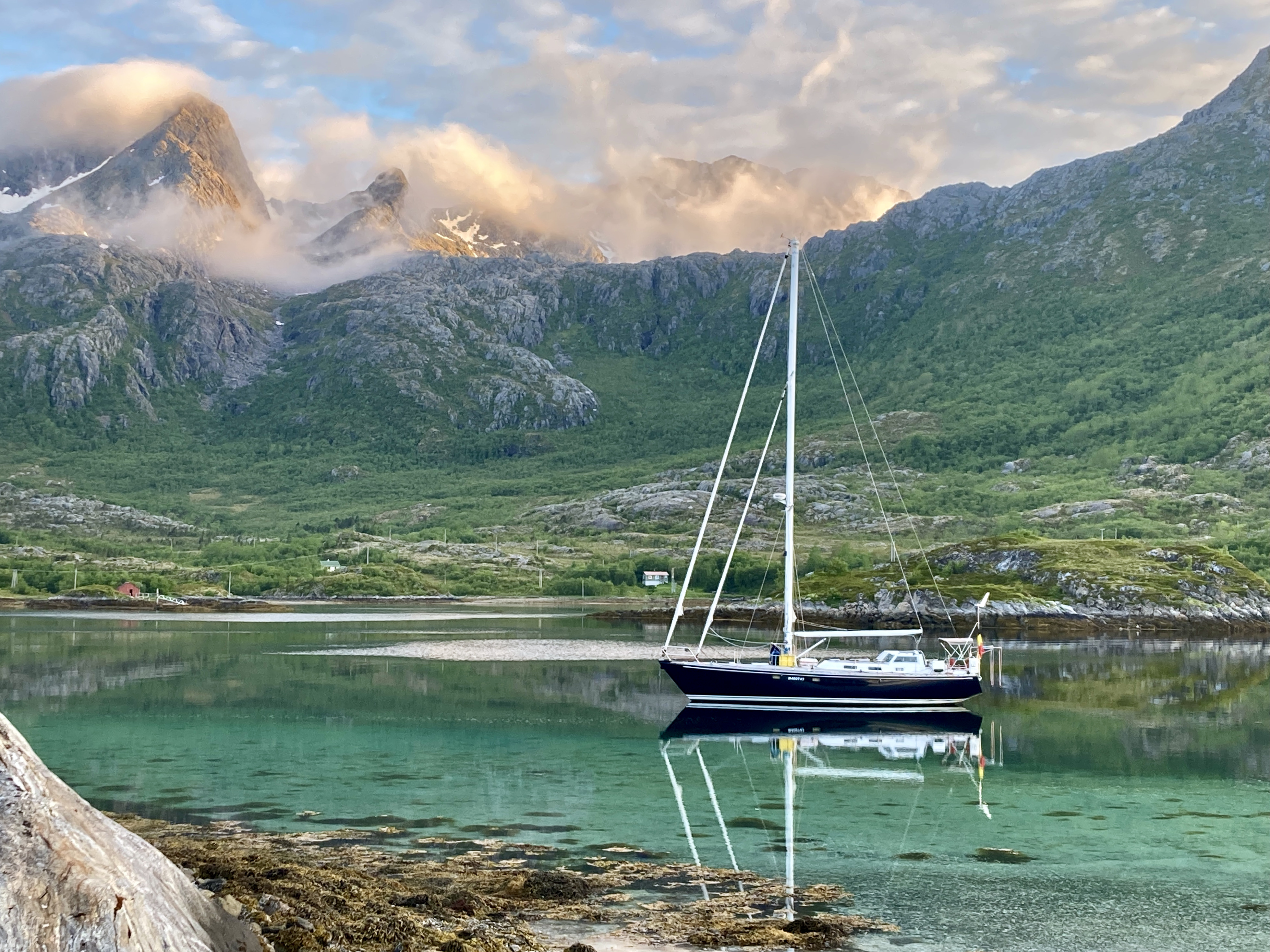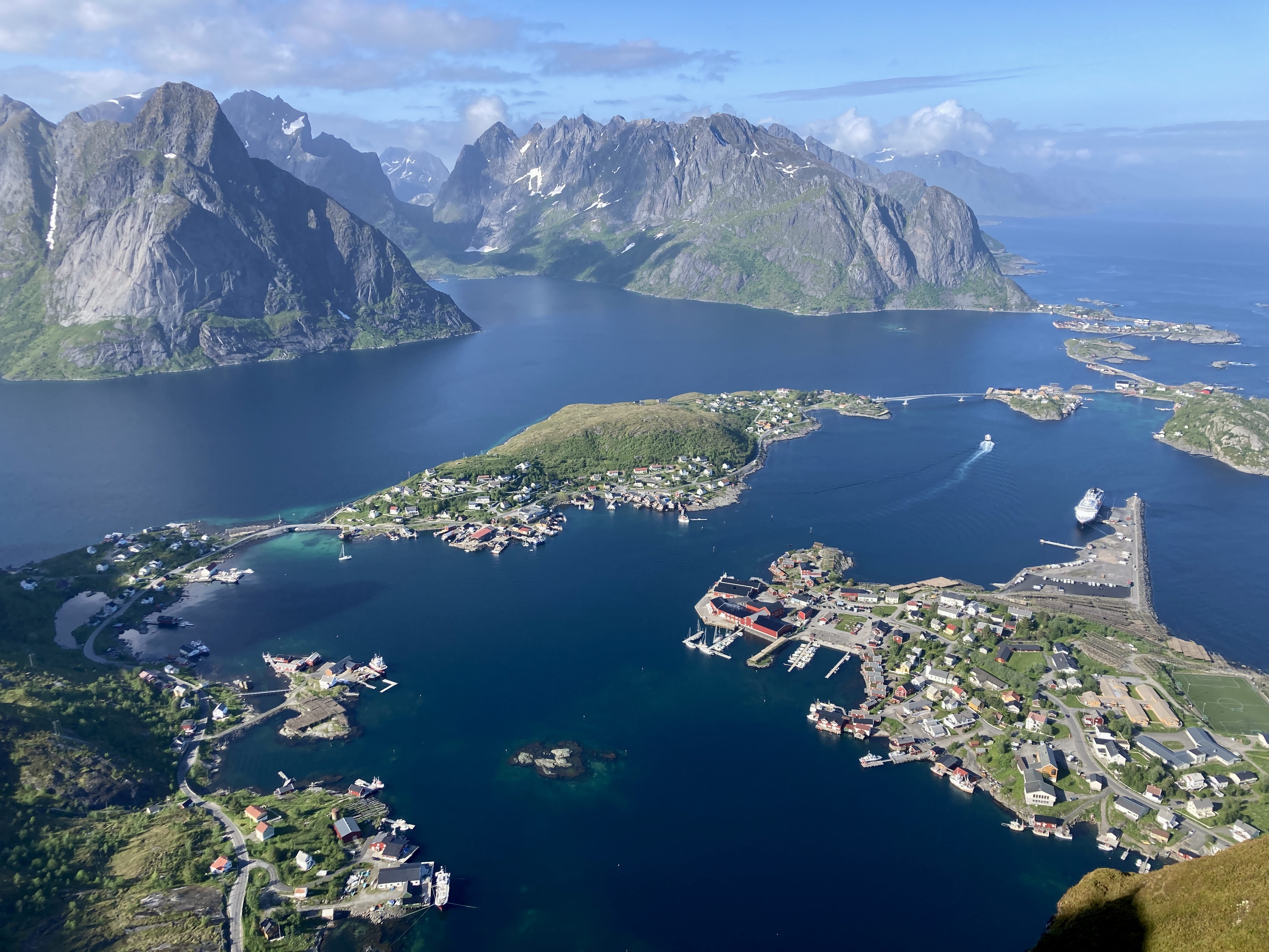 Een dag eerder. Moeilijk te geloven dat er storm op komst is. Heerlijk windje, stralende zon, blauwe lucht. Het tochtje van Henningsvær naar Skrova, goed elf mijl, kan zó in een toeristisch promofilmpje voor de Lofoten.