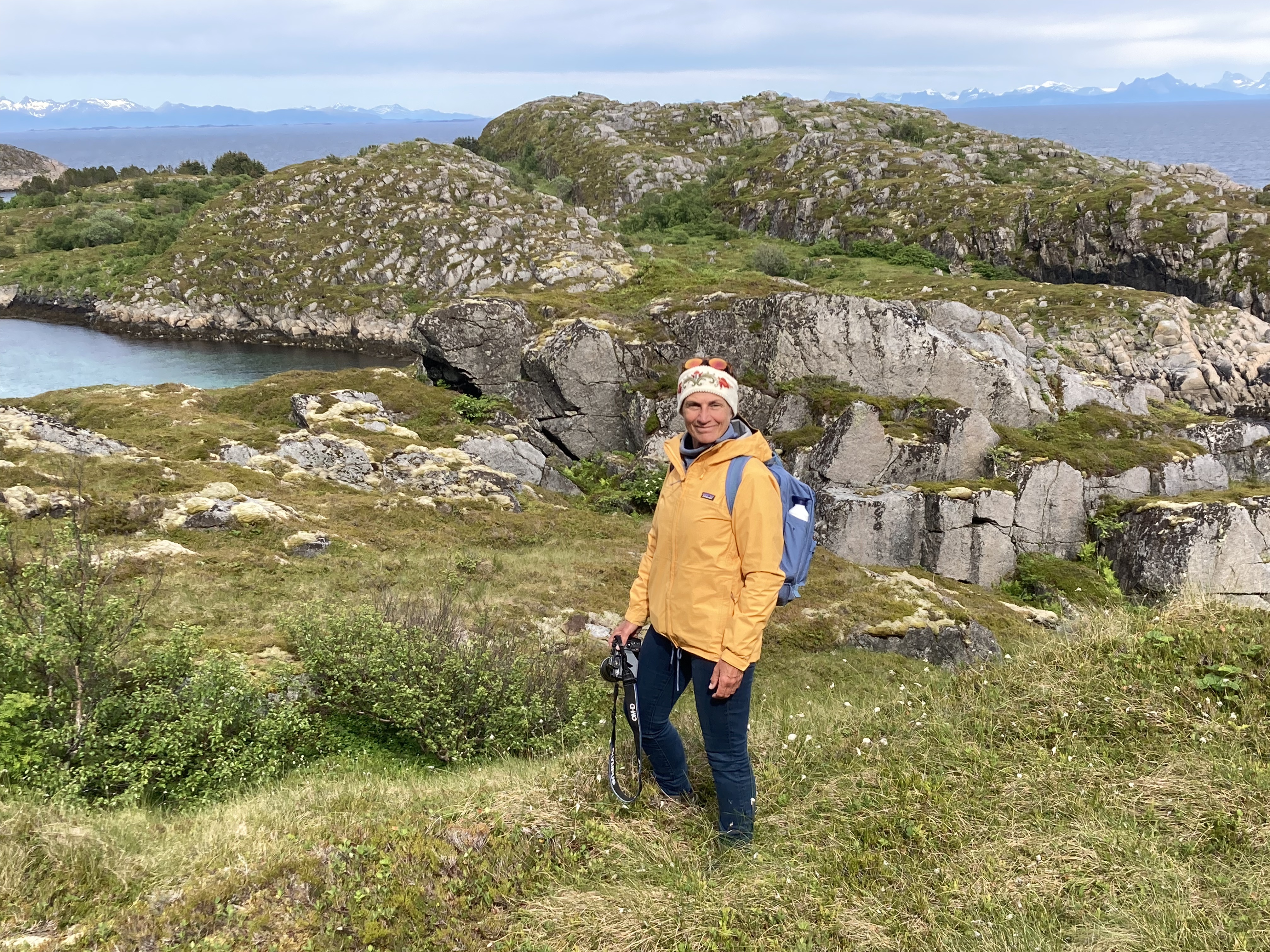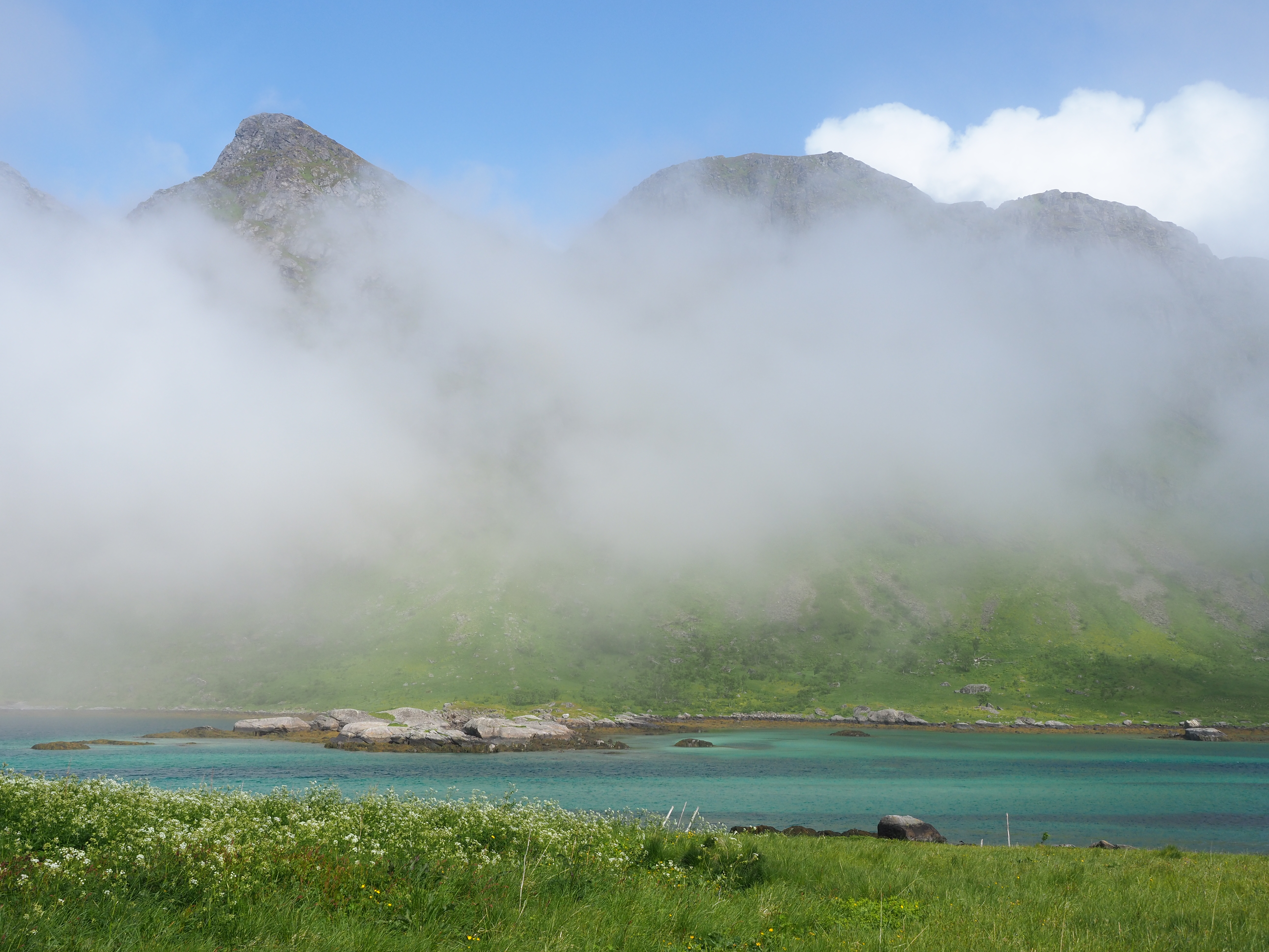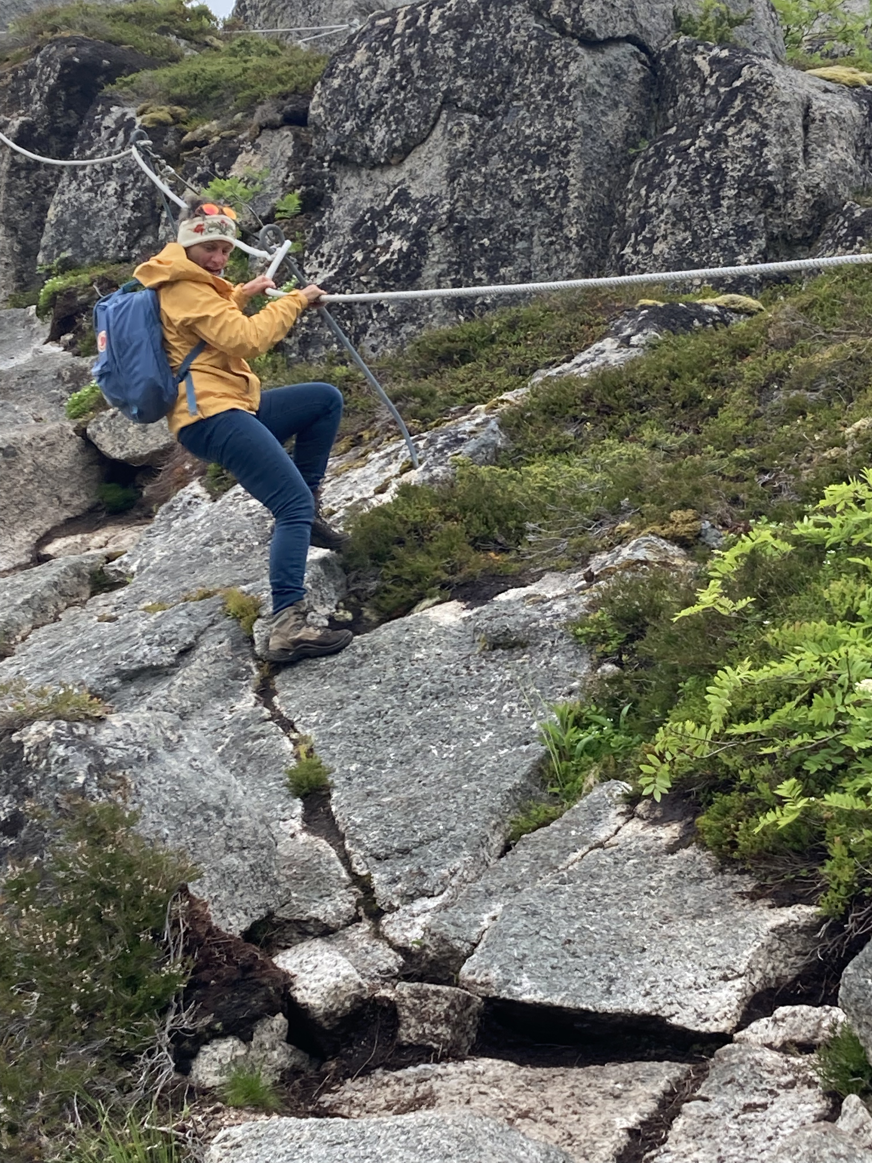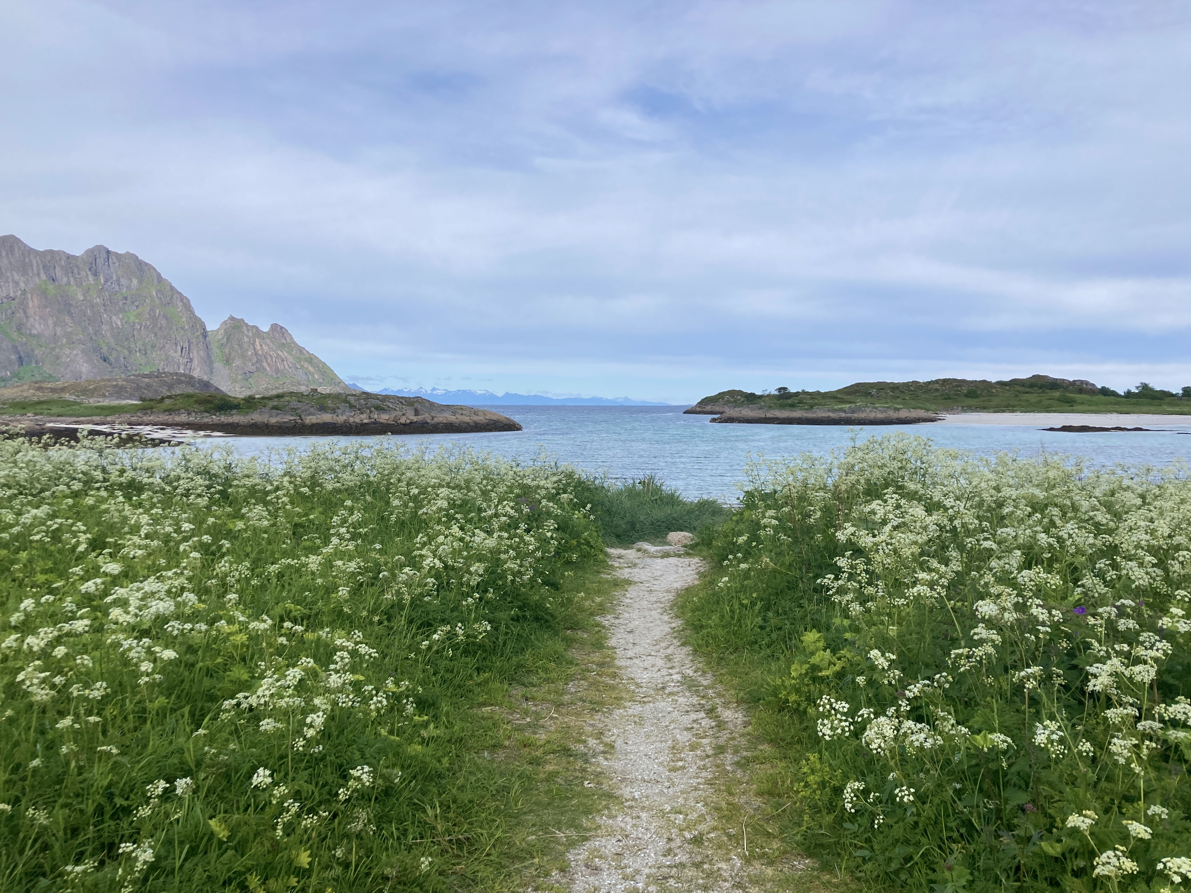 Maar yr.no heeft gezegd dat het mooie weer niet zal blijven duren en daarom besluiten we nog dezelfde dag de hike rond het eiland te doen. Skrova is niet groot, je wandelt er in een namiddag omheen en dan heb je zelfs nog een ommetje gemaakt naar de top van de berg. Onze wandelgids voor vandaag heet Komoot. Dat is een app waar wandel- en fietstochten op te vinden zijn.. Of noem het een digitale community voor stappers en fietsers. Want wandelingen worden niet alleen van naaldje tot draadje uit de doeken gedaan, ijverige wandelaars delen er ook ervaringen, foto’s of nieuw ontdekte wandelroutes. Een gekozen route kan je bovendien na downloaden offline meenemen. Het wordt een pittige namiddag, langs paden vol wilde bloemen, met mooie vergezichten en een schitterend uitzicht op de Lofoten wall aan de overkant. Want zo wordt de rij getande bergpieken ook genoemd. Het laatste stuk van de wandeling, naar de top is het spannendst, ijzeren stangen met touwen als reling bieden houvast op de steilste stukken. 20.000 stappen later genieten we bij een welverdiende Lofotpils van de absolute stilte.