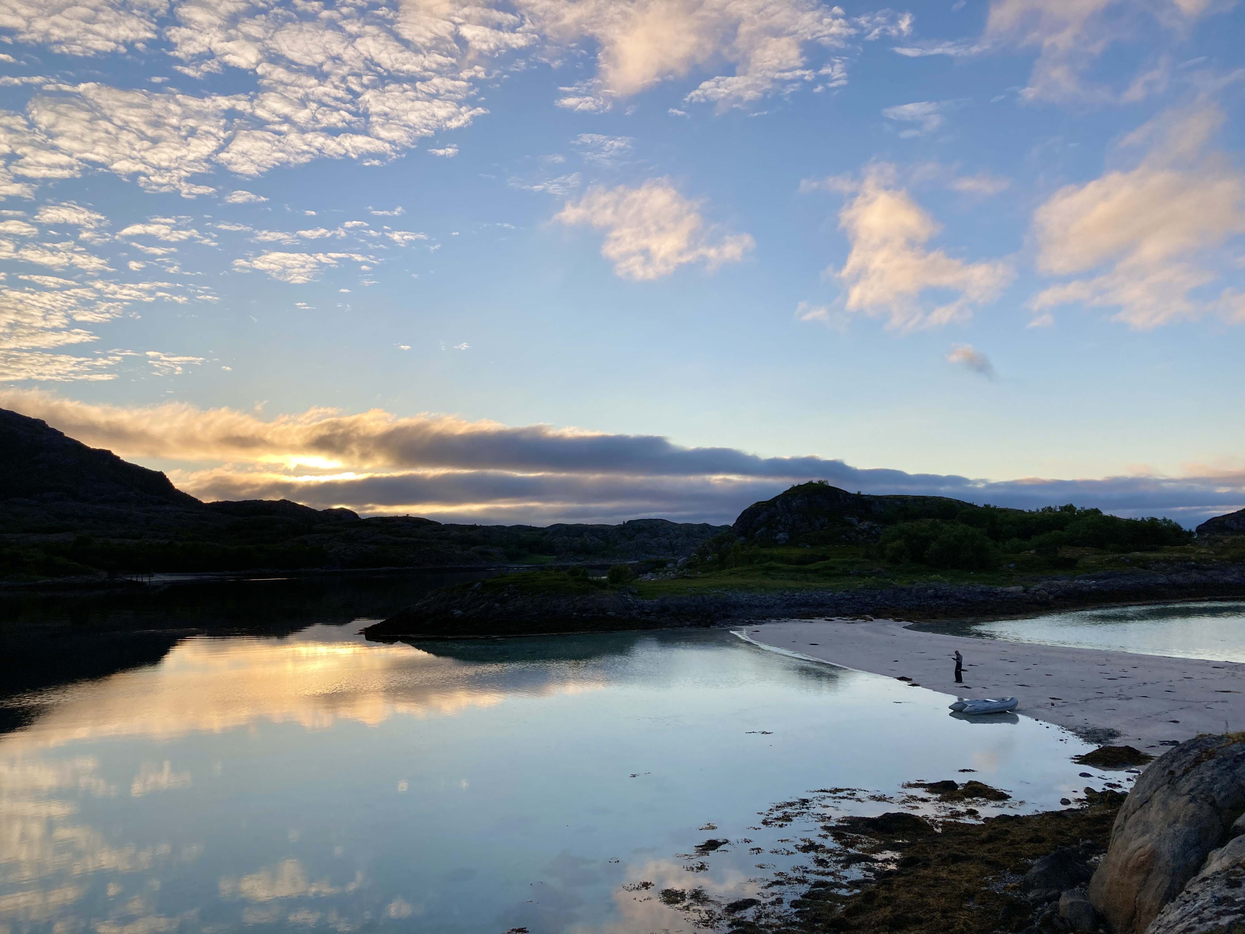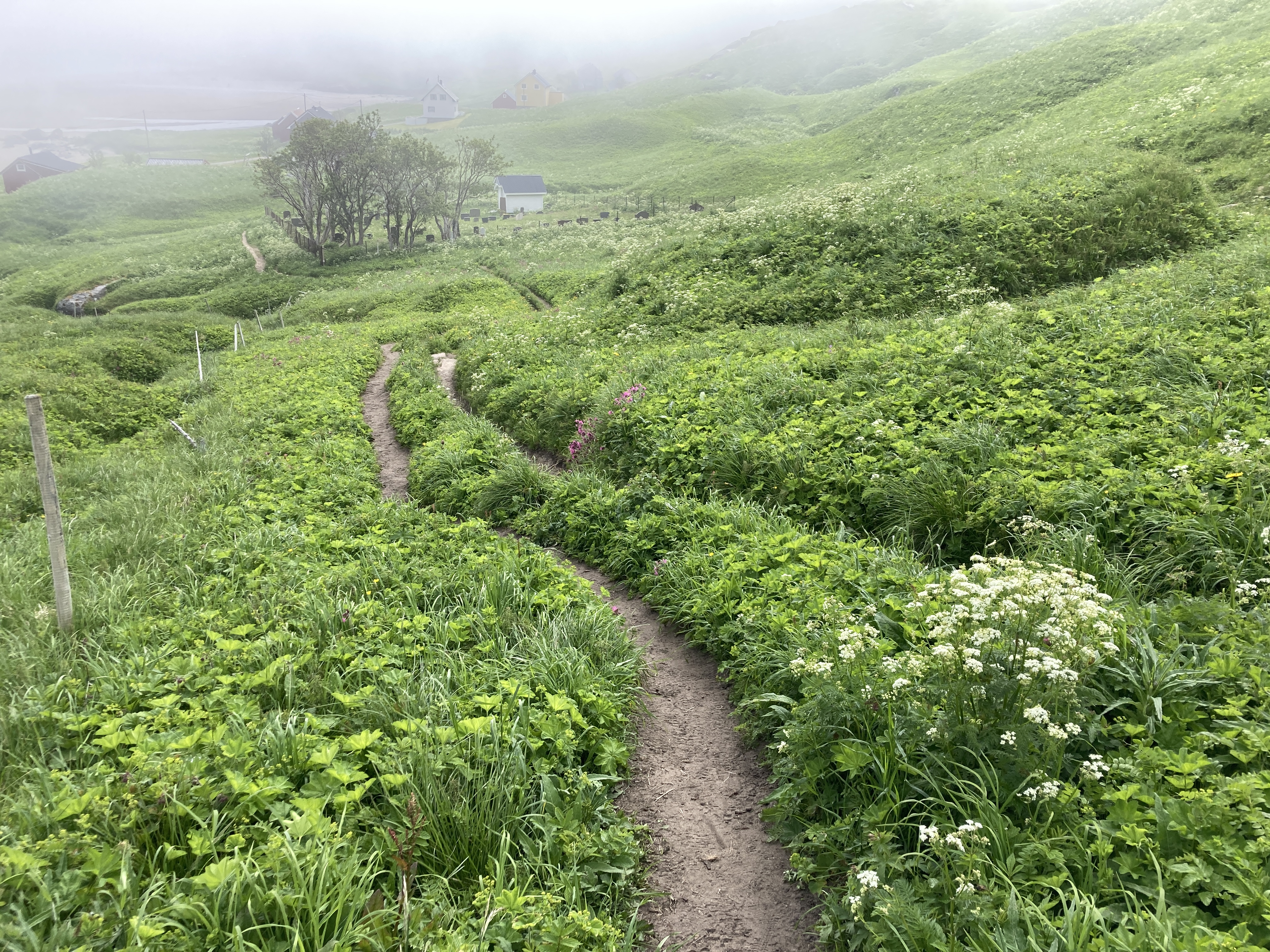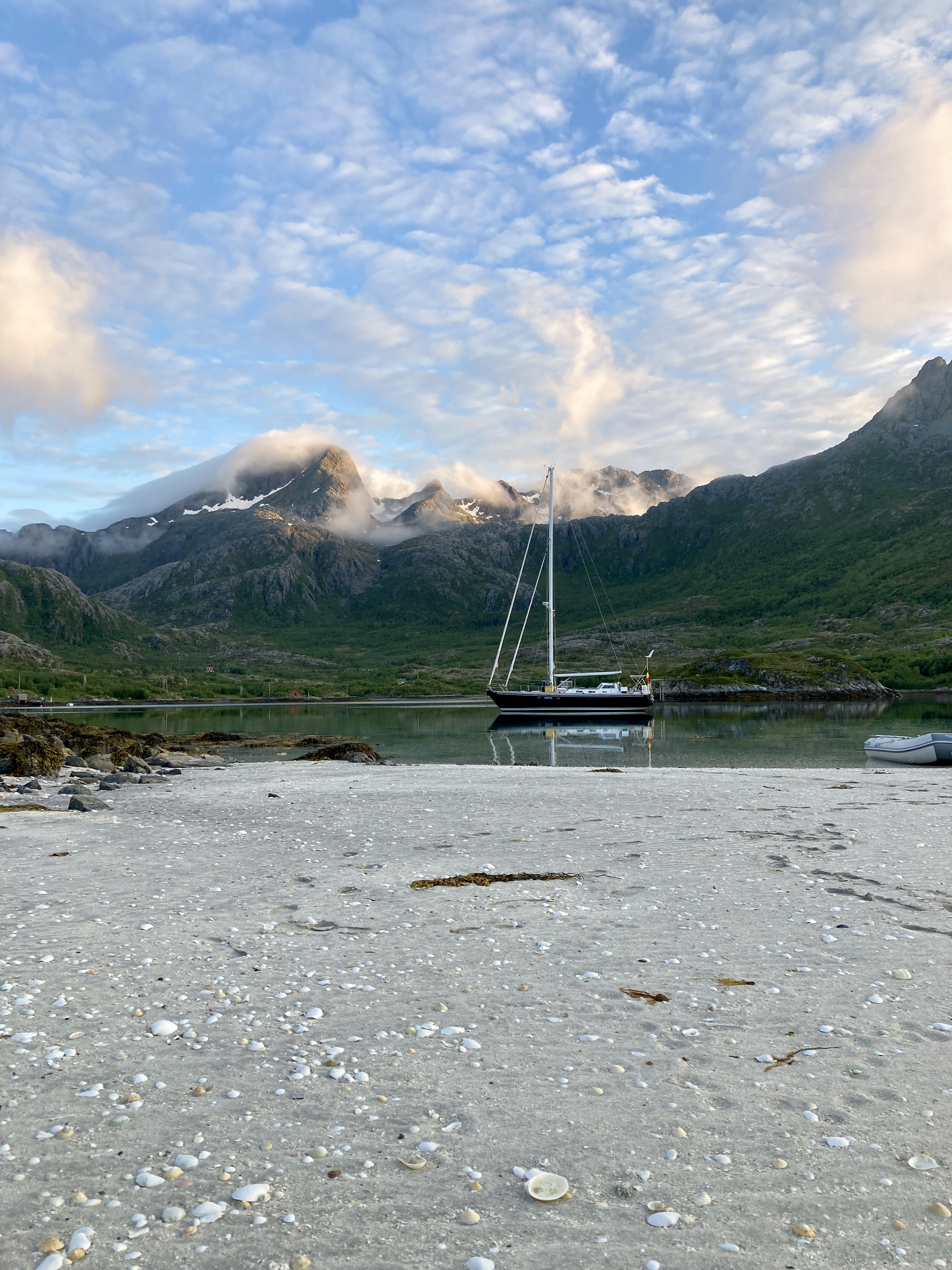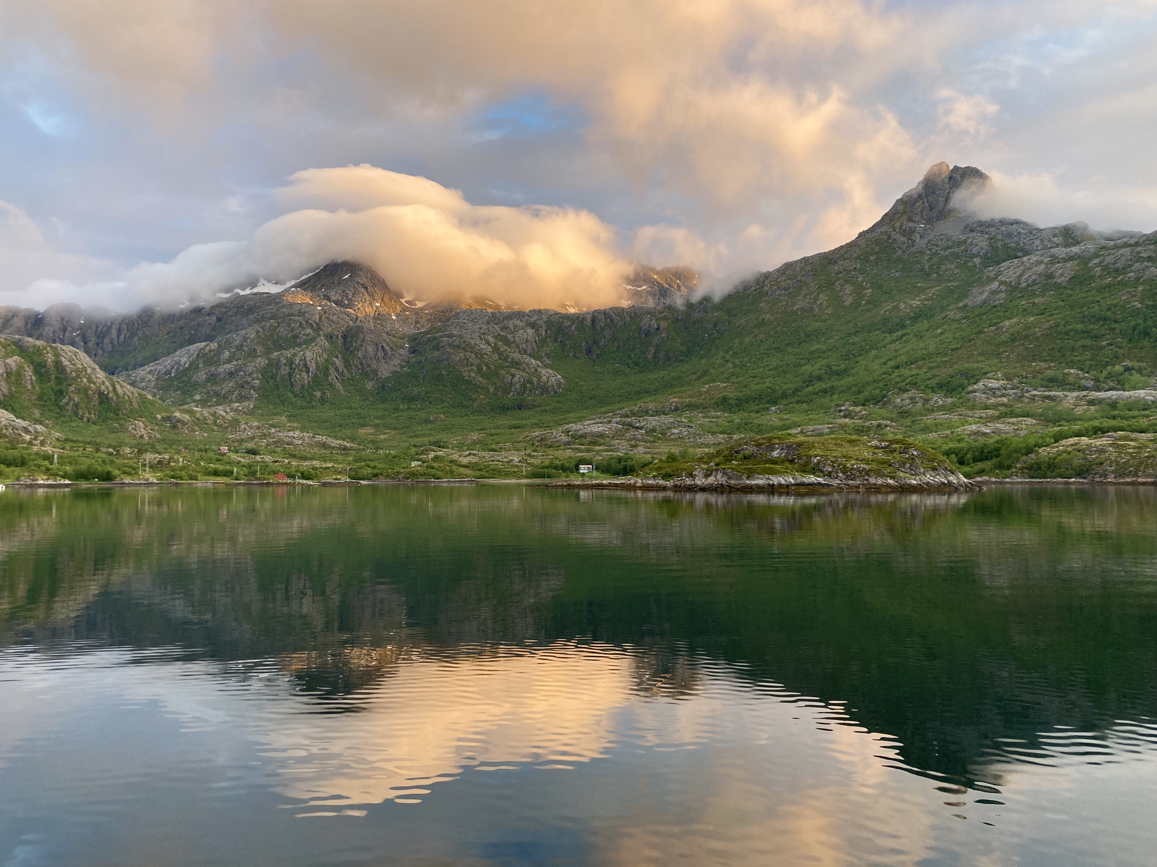 Maar yr.no heeft gezegd dat het mooie weer niet zal blijven duren en daarom besluiten we nog dezelfde dag de hike rond het eiland te doen. Skrova is niet groot, je wandelt er in een namiddag omheen en dan heb je zelfs nog een ommetje gemaakt naar de top van de berg. Onze wandelgids voor vandaag heet Komoot. Dat is een app waar wandel- en fietstochten op te vinden zijn.. Of noem het een digitale community voor stappers en fietsers. Want wandelingen worden niet alleen van naaldje tot draadje uit de doeken gedaan, ijverige wandelaars delen er ook ervaringen, foto’s of nieuw ontdekte wandelroutes. Een gekozen route kan je bovendien na downloaden offline meenemen. Het wordt een pittige namiddag, langs paden vol wilde bloemen, met mooie vergezichten en een schitterend uitzicht op de Lofoten wall aan de overkant. Want zo wordt de rij getande bergpieken ook genoemd. Het laatste stuk van de wandeling, naar de top is het spannendst, ijzeren stangen met touwen als reling bieden houvast op de steilste stukken. 20.000 stappen later genieten we bij een welverdiende Lofotpils van de absolute stilte.