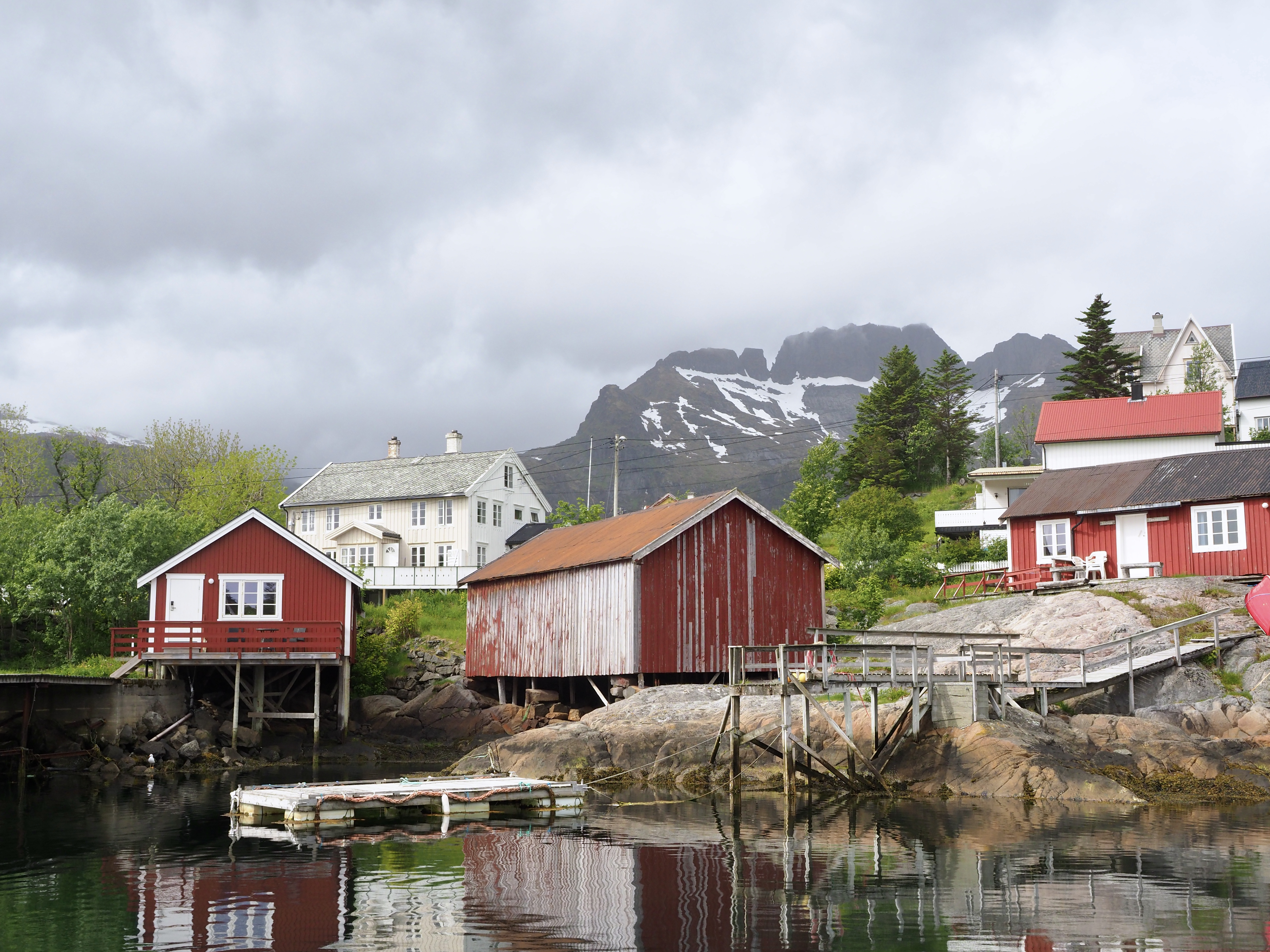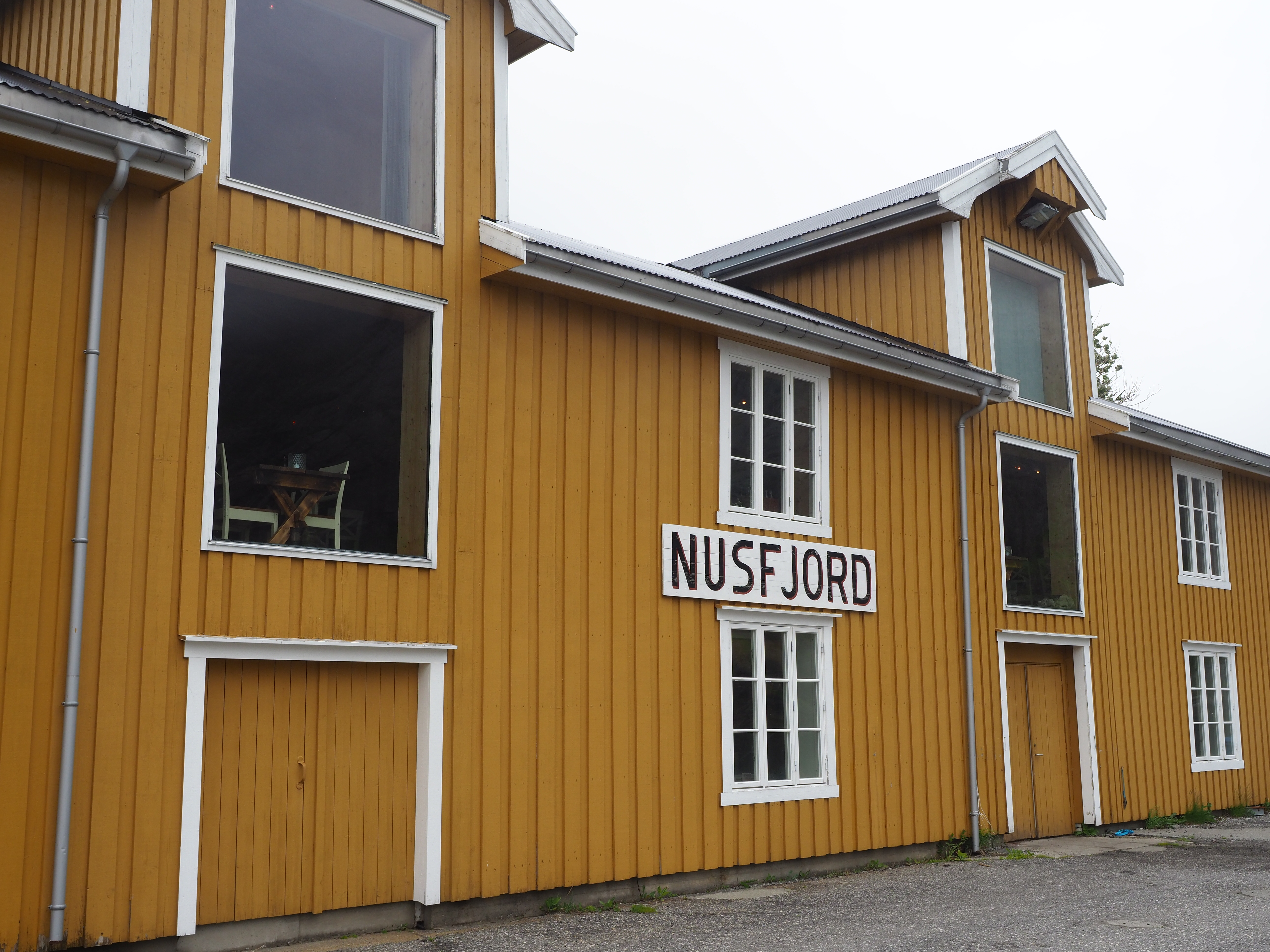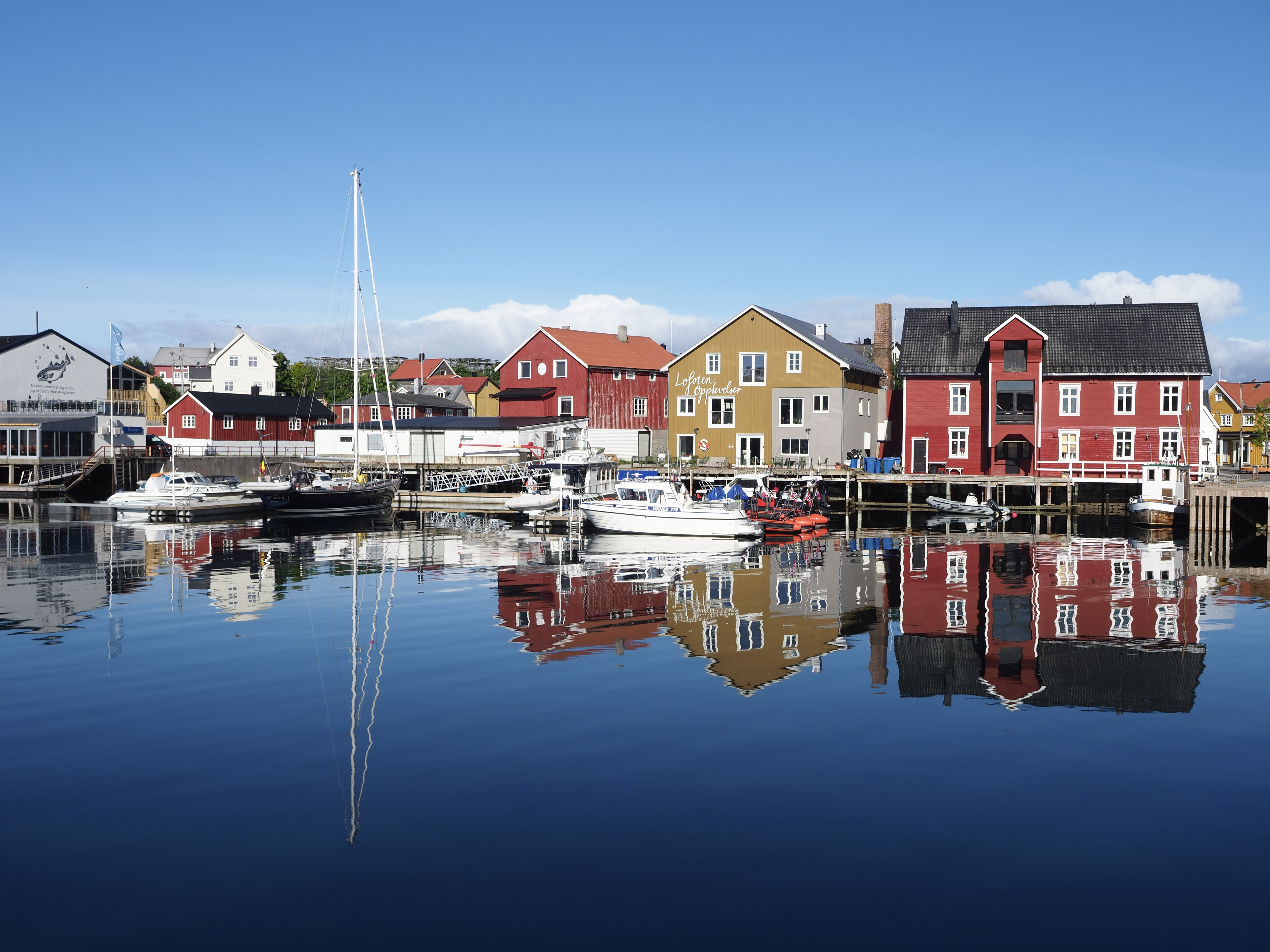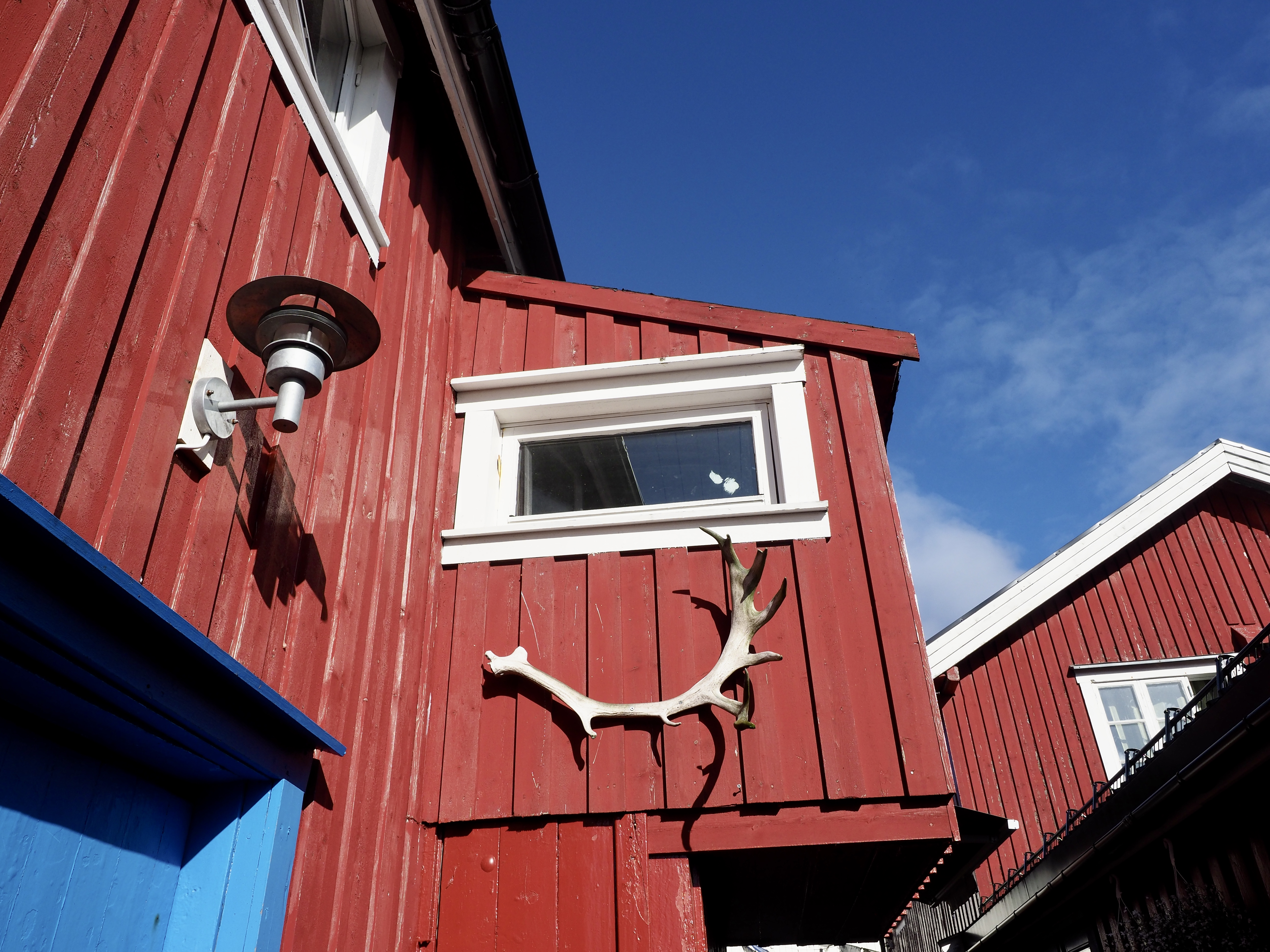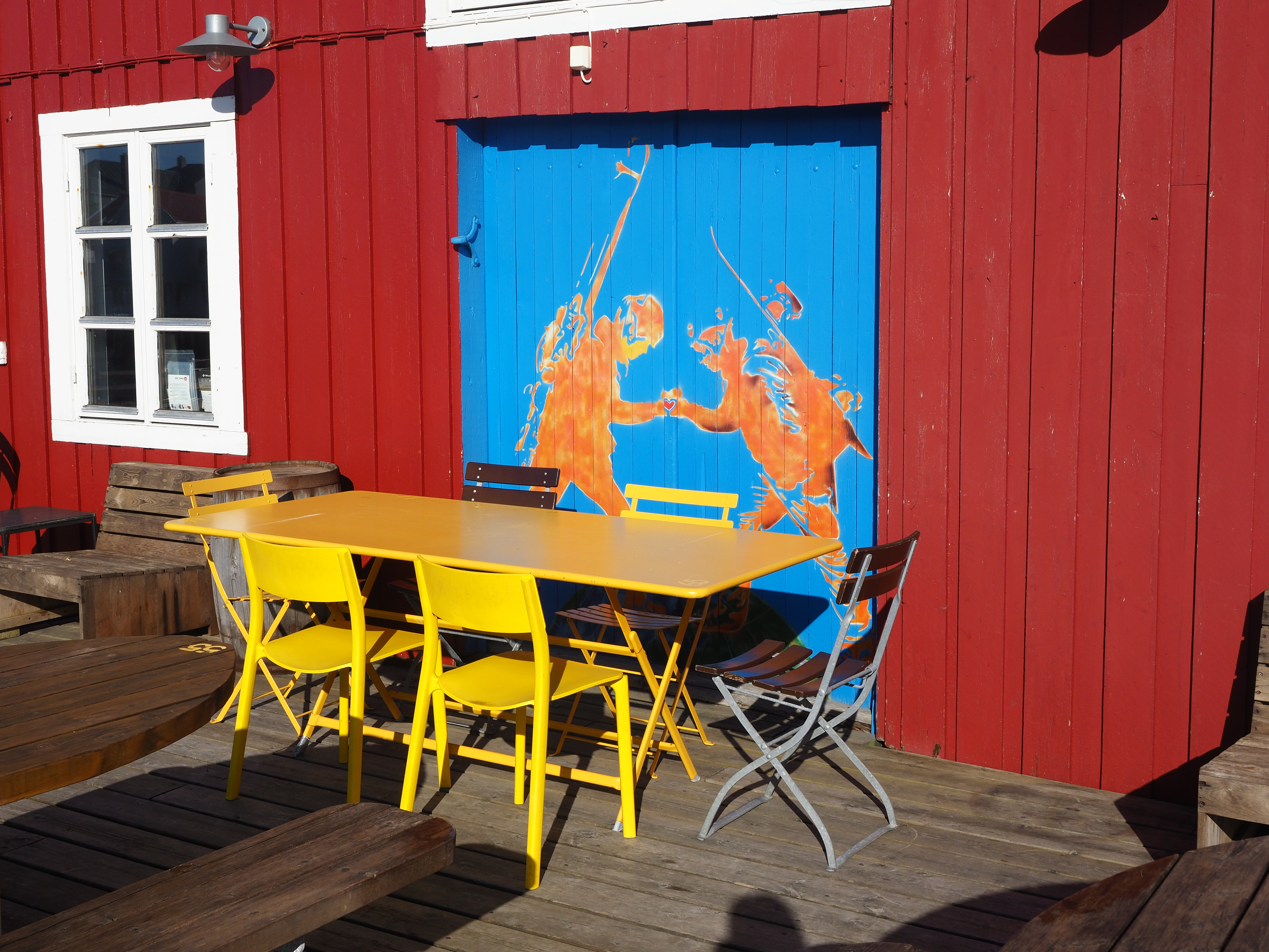We varen langs bontgekleurde huisjes de haven in en meren af aan een ponton bij een wit, houten gebouw. Is of was het vervallen complex een theaterzaal, dat is niet helemaal duidelijk. Skrova, ooit hét centrum van de walvisvangst, is nu een slaperig eilandje waar een paar rorbuer worden verhuurd, waar het enige restaurantje knalgeel is geverfd en kunstzinnige foto’s de straten kleuren. Meer moet het niet zijn om me verliefd te krijgen.