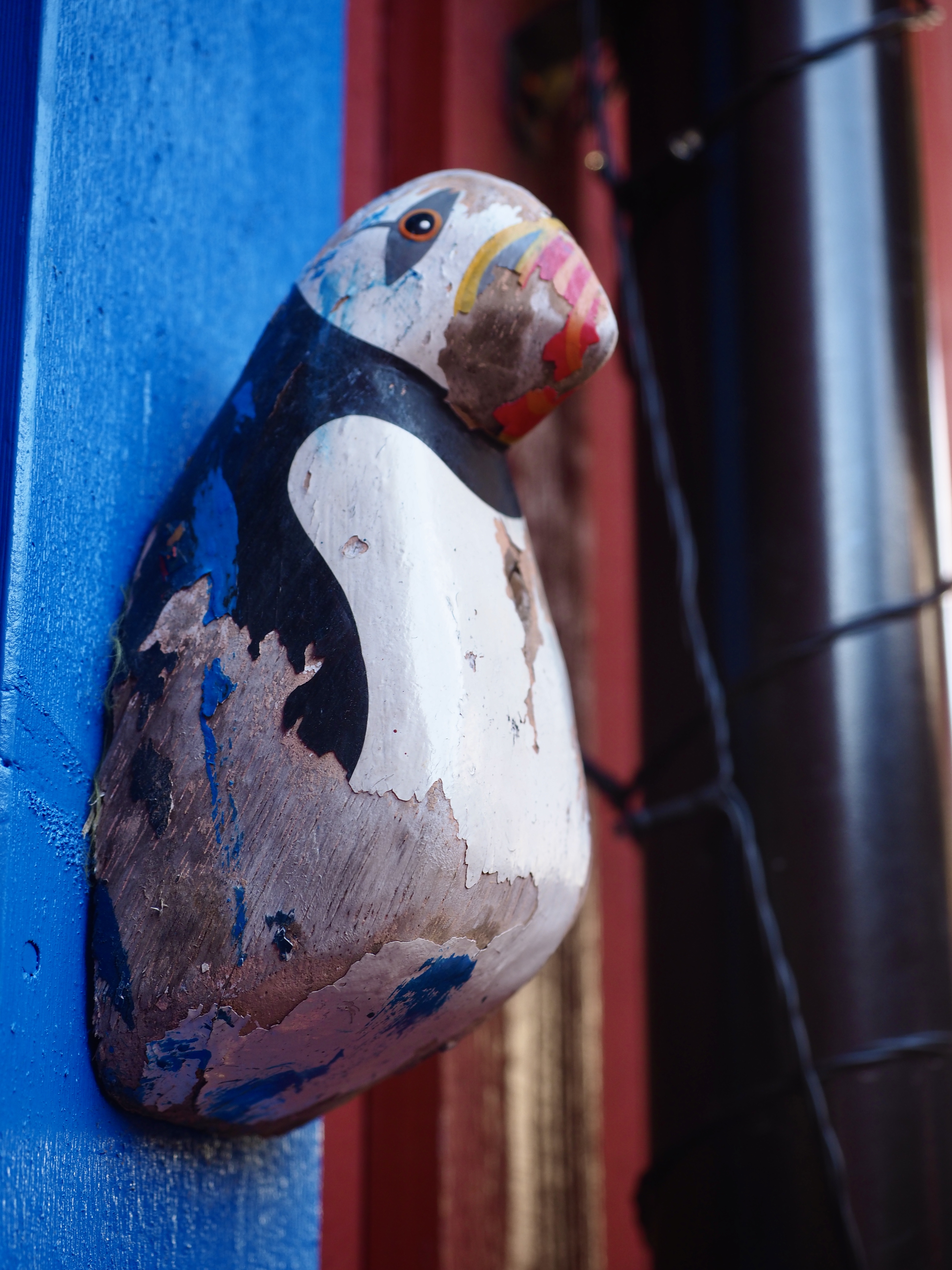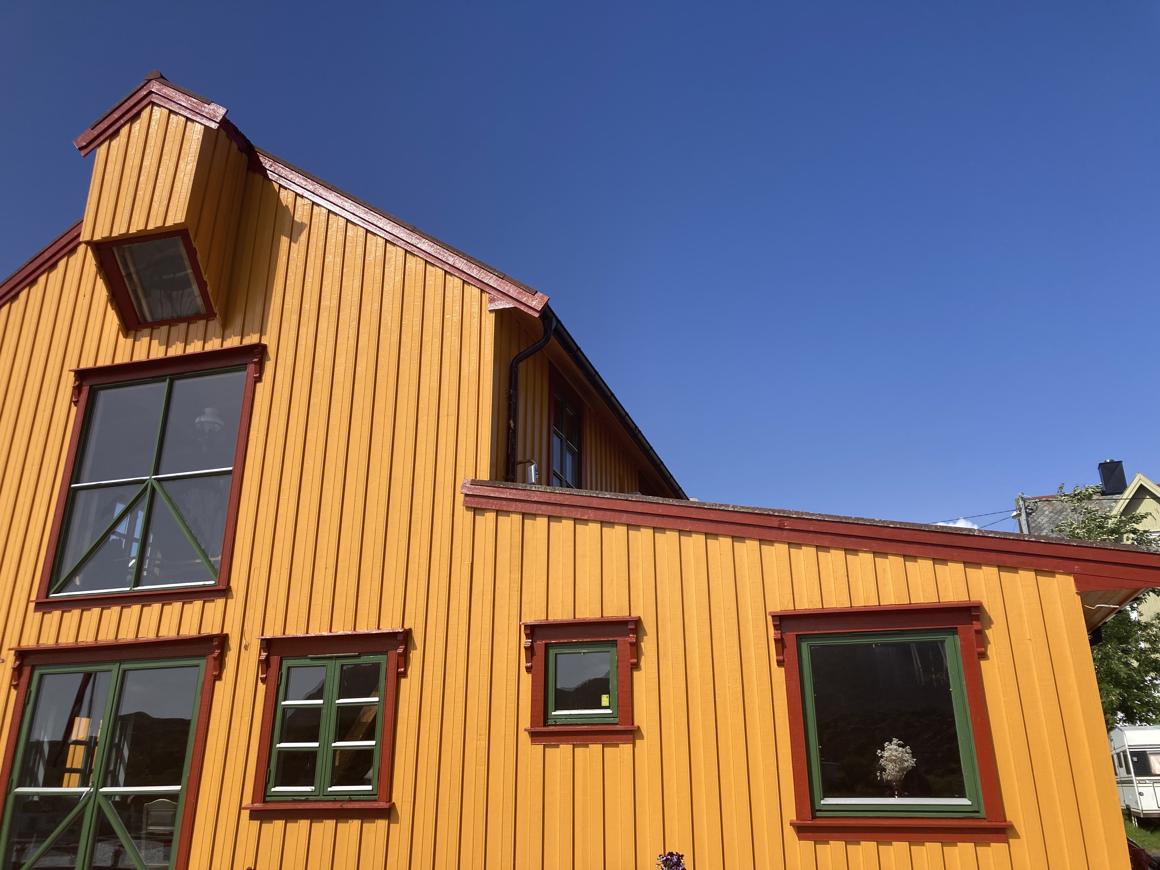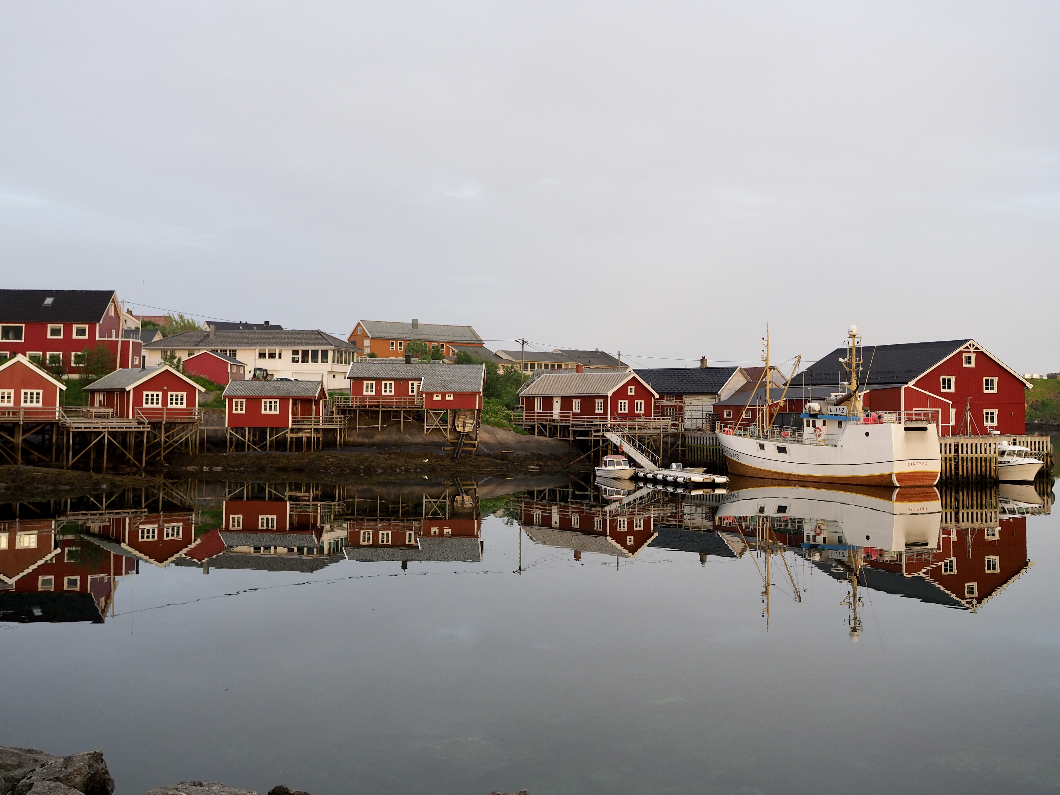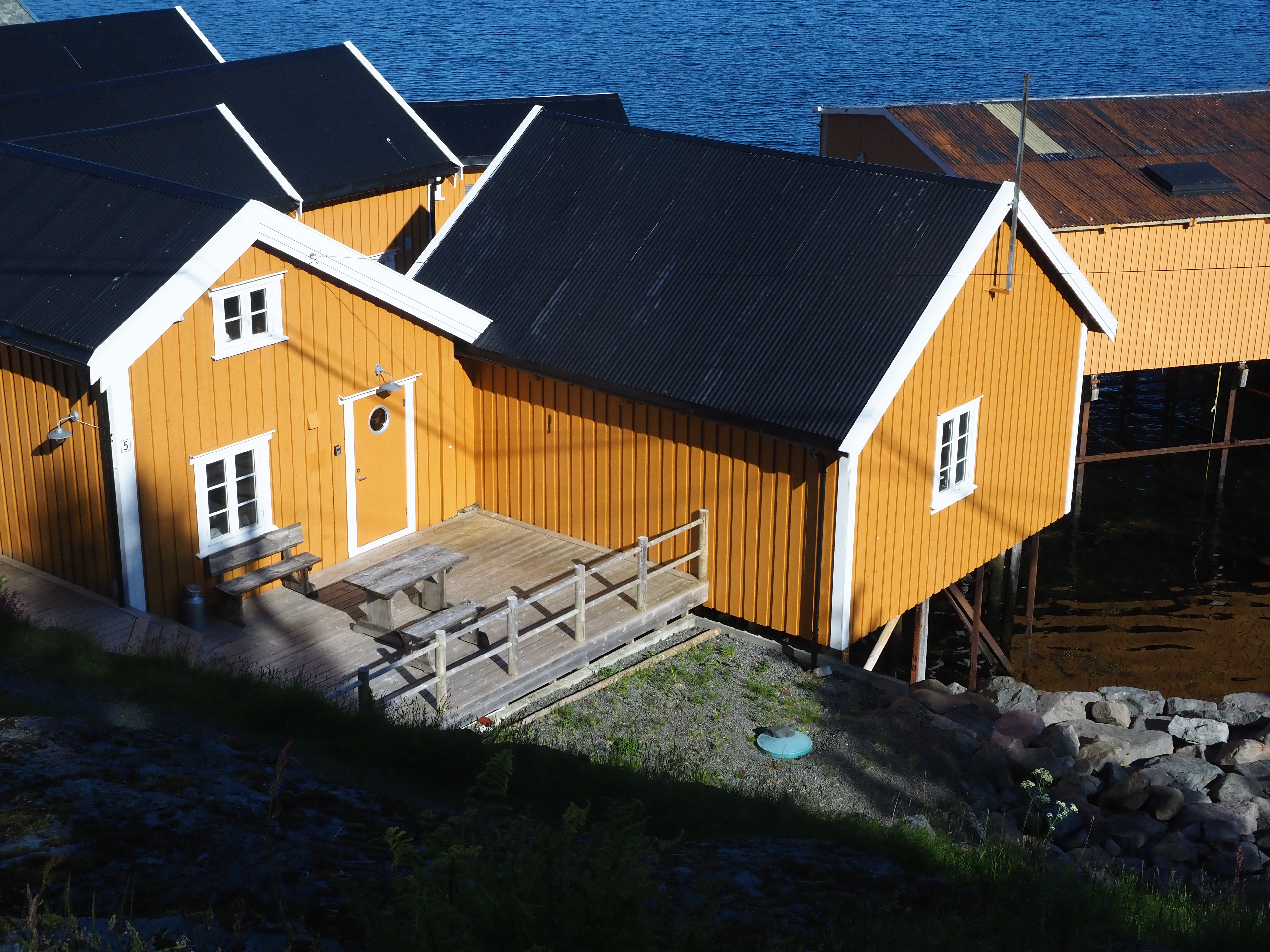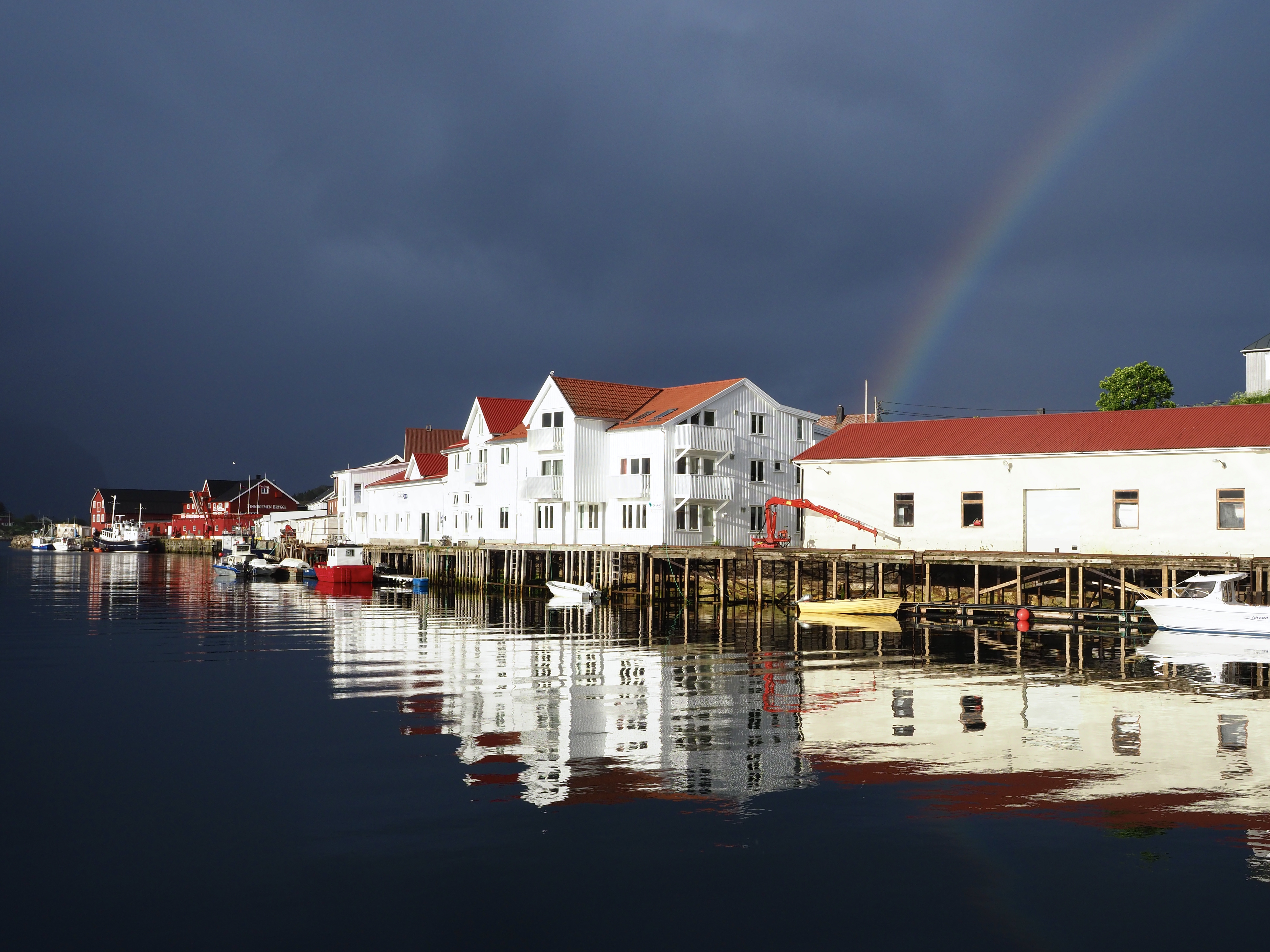 We varen langs bontgekleurde huisjes de haven in en meren af aan een ponton bij een wit, houten gebouw. Is of was het vervallen complex een theaterzaal, dat is niet helemaal duidelijk. Skrova, ooit hét centrum van de walvisvangst, is nu een slaperig eilandje waar een paar rorbuer worden verhuurd, waar het enige restaurantje knalgeel is geverfd en kunstzinnige foto’s de straten kleuren. Meer moet het niet zijn om me verliefd te krijgen.