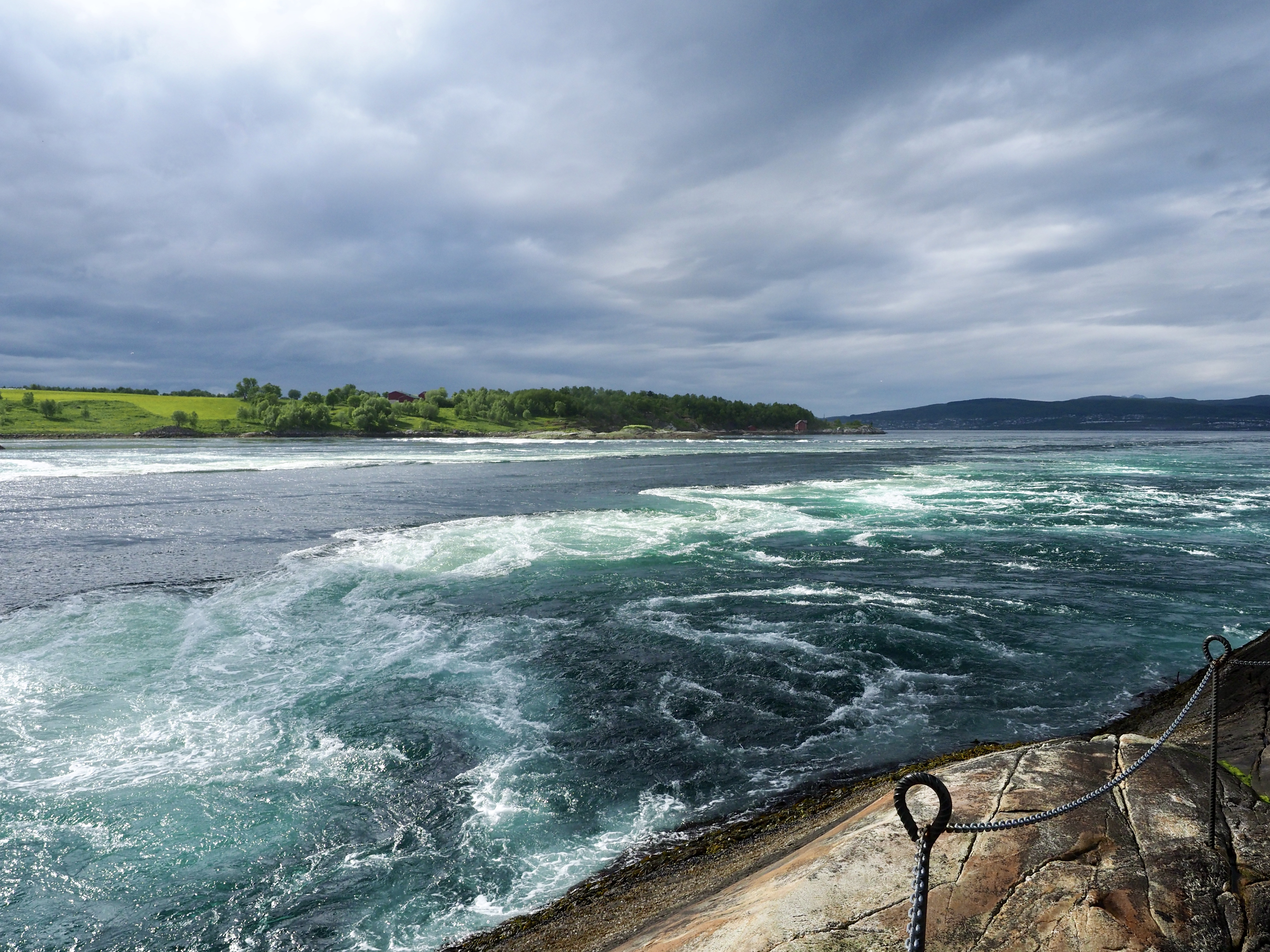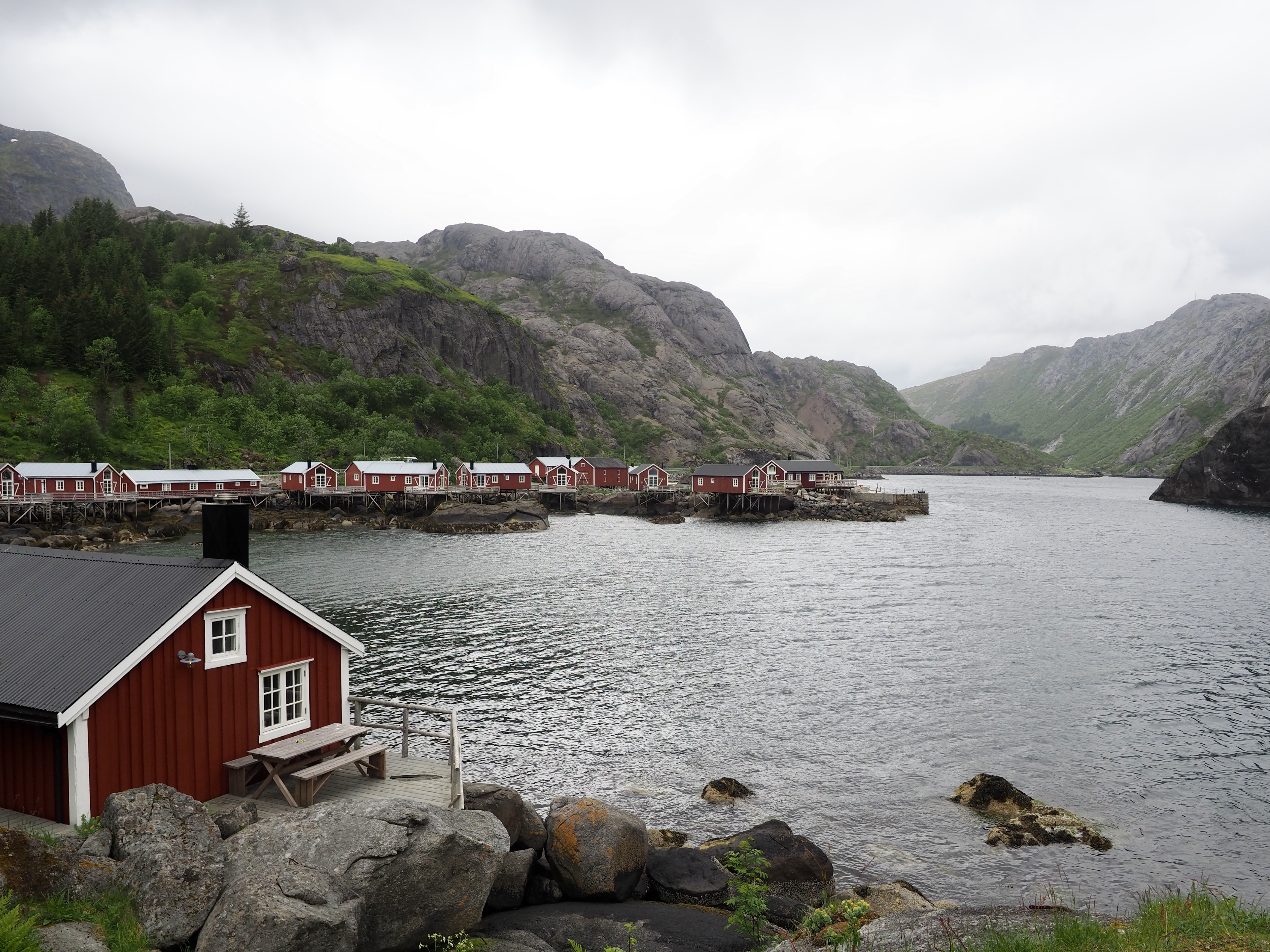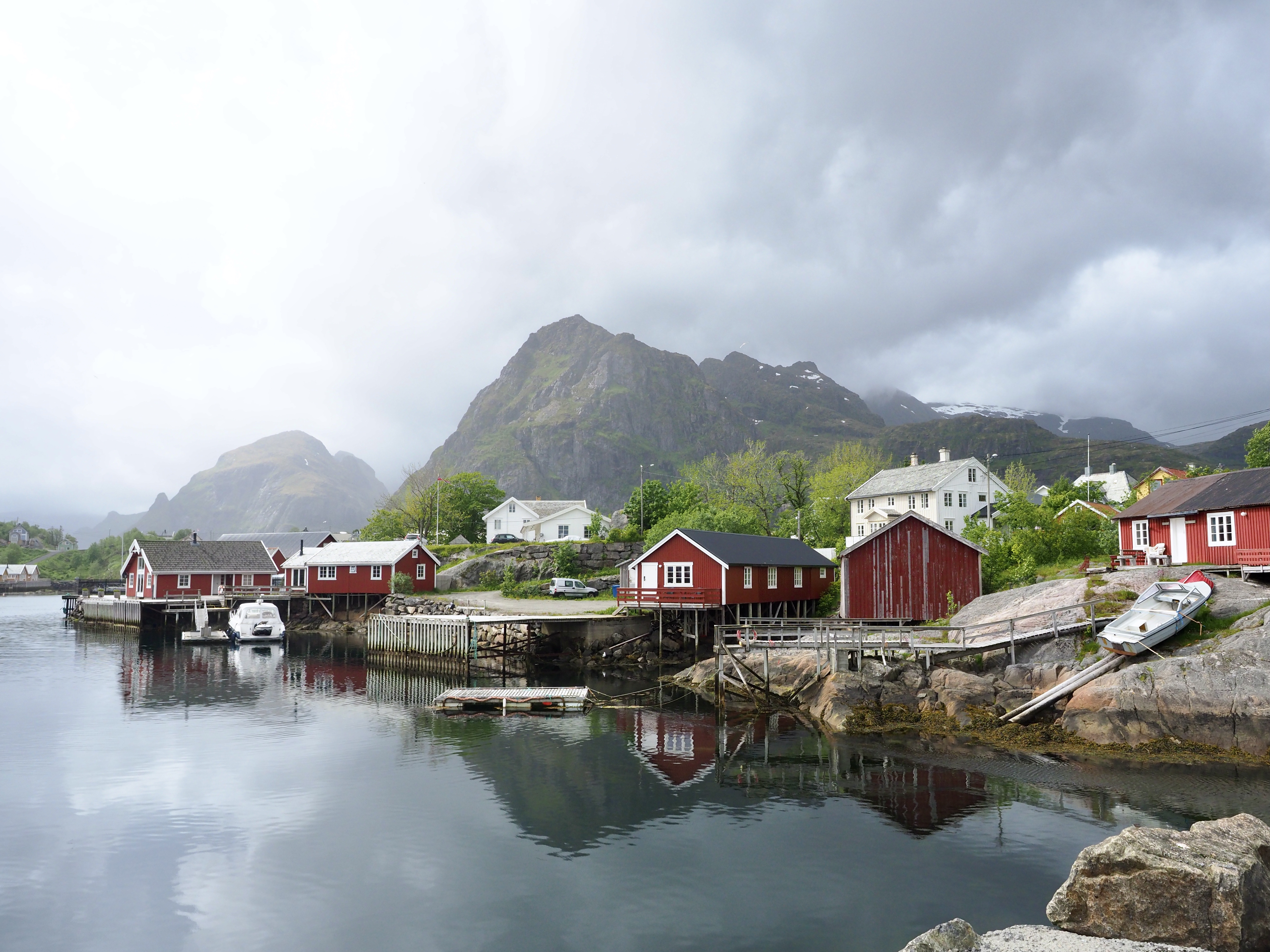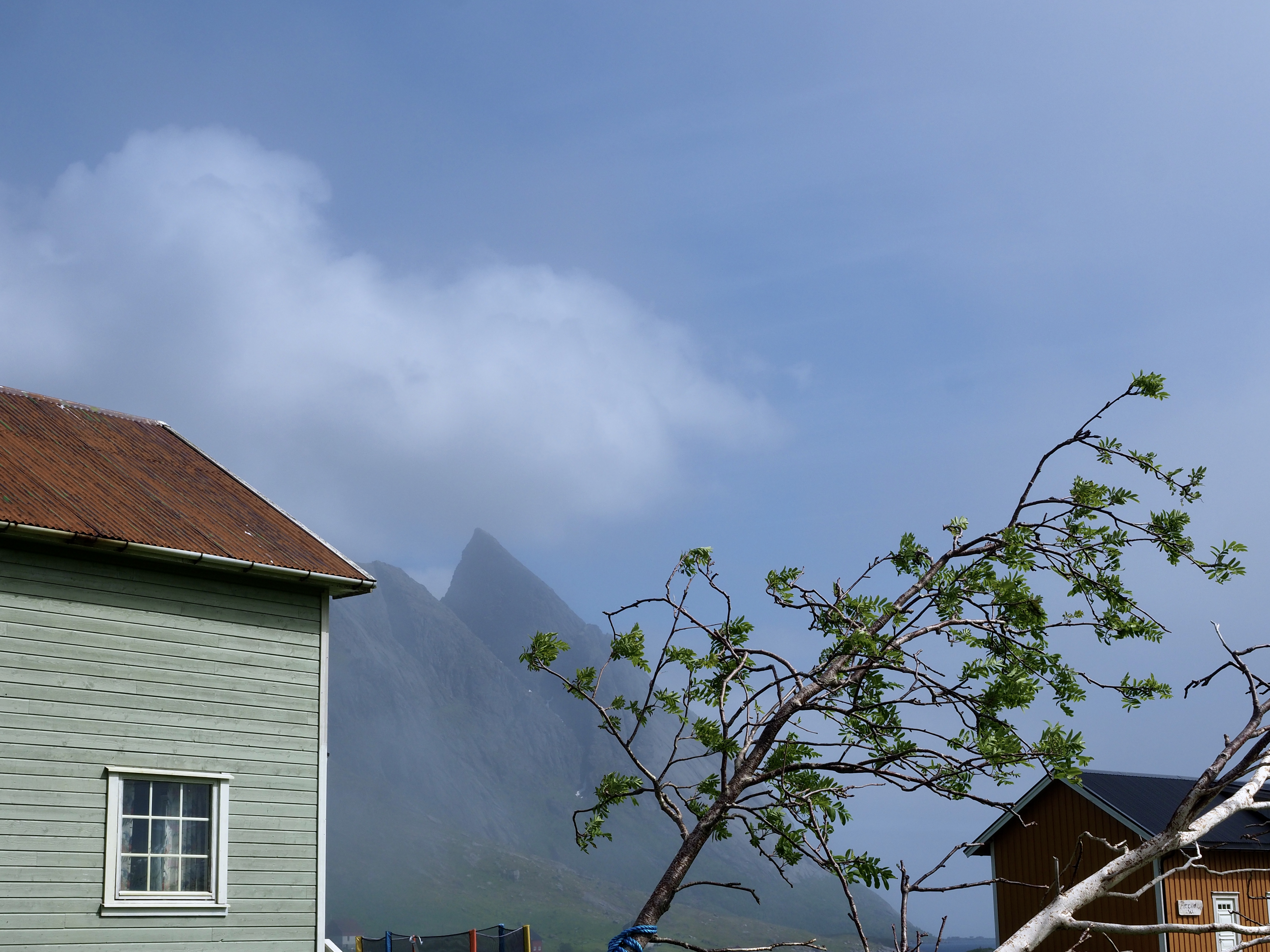 Als een dag later een fikse storm het eiland teistert nemen we de ferry naar Svolvær. Het is die ferry die we een dag eerder bij het binnenvaren kruisten en we verbazen ons ook nu weer over de snelheid waarmee die rakeling langs de rotsen vaart. Svolvær kan ons niet helemaal bekoren, misschien speelt het mindere weer een rol, of het stadse karakter. Maar Noorwegen-waardige slecht-weer-pakken hebben we nu wel…