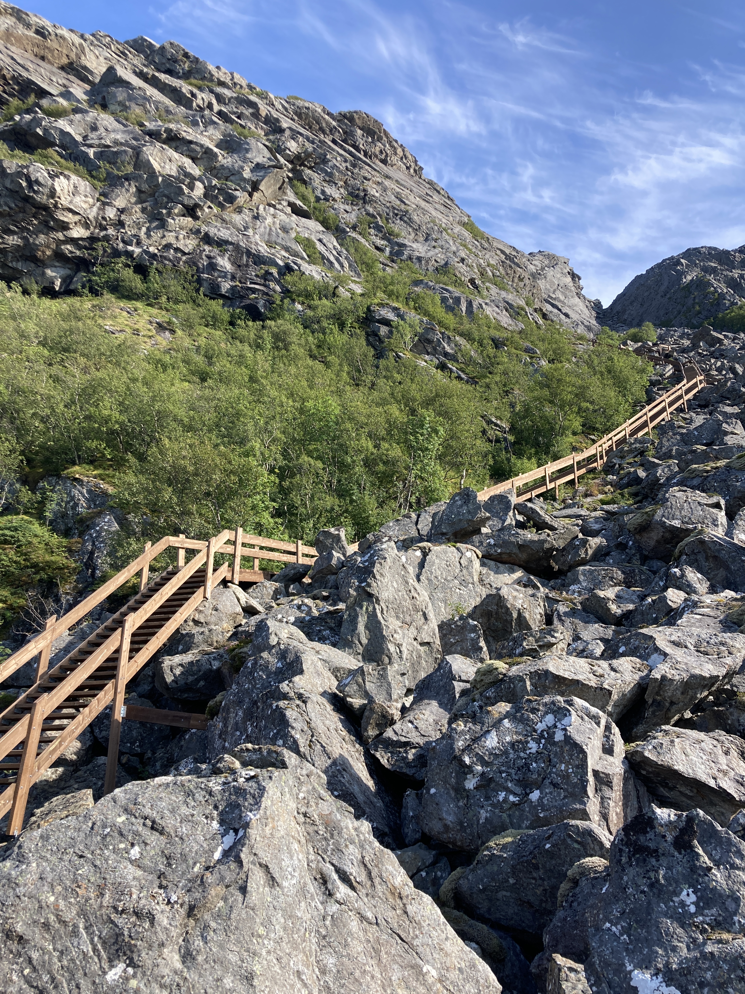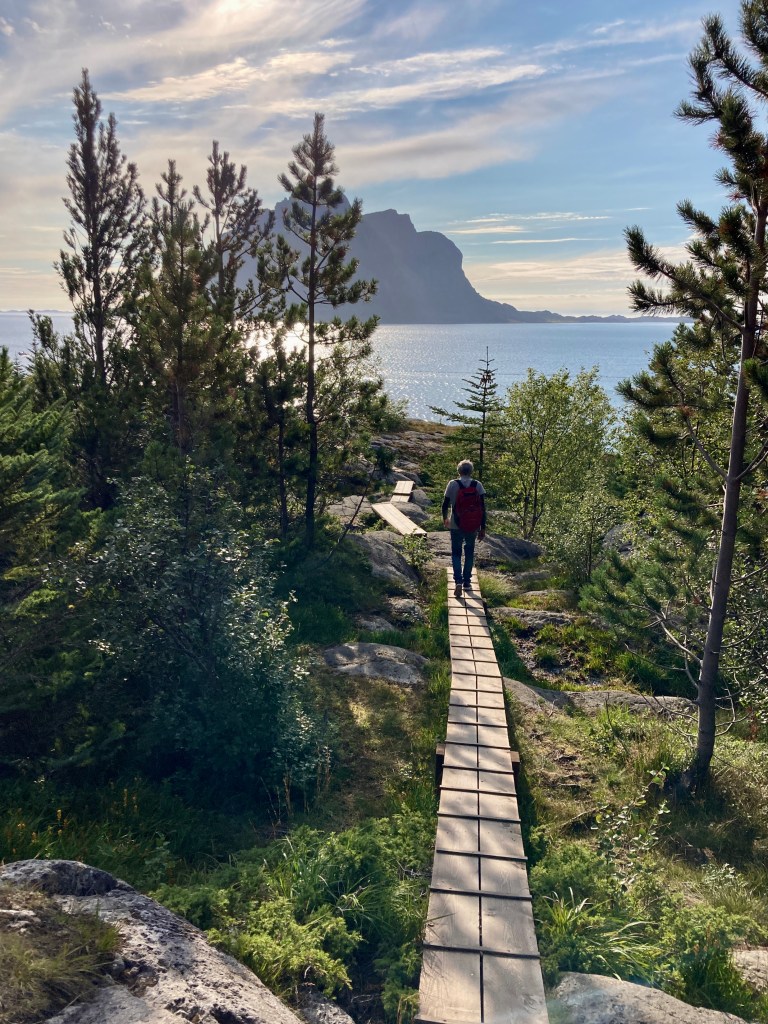 Maar eilandbloed kruipt waar het niet gaan kan en na enkele decennia keren mensen terug. Huizen en boerderijtjes worden opgeknapt, de mannen gaan weer vissen en de vrouwen herstellen een wel heel aparte traditie in ere, het verzamelen en verwerken van eendendons. De eilandgemeenschap van Vega gaat verrassend liefdevol met de natuur om. Zo vertroetelen de vrouwen van Vega de wilde eidereenden door schattige schuilplaatsen voor ze te knutselen zodat ze veilig kunnen nesten. Of zetten de mannen, wanneer een eiland kaal gegraasd is, hun schapen op veerpontjes om ze naar een eiland met meer en malser gras te brengen. Door die buitengewone combinatie van hard work and tender care, hard labeur en tedere zorg, op een geïsoleerde plek als deze, werd de Vega archipel Unesco werelderfgoed. In het Verdensarvsenter, of bezoekerscentrum, een modern en knap gebouw, kom je er alles over te weten. Maar Vega heeft nog meer te bieden. Een groot deel van het eiland is verrassend vlak en het is er leuk fietsen. Klimmen kan ook en als je er tweeduizend houten traptreden voor over hebt, word je met een schitterend uitzicht beloond.
