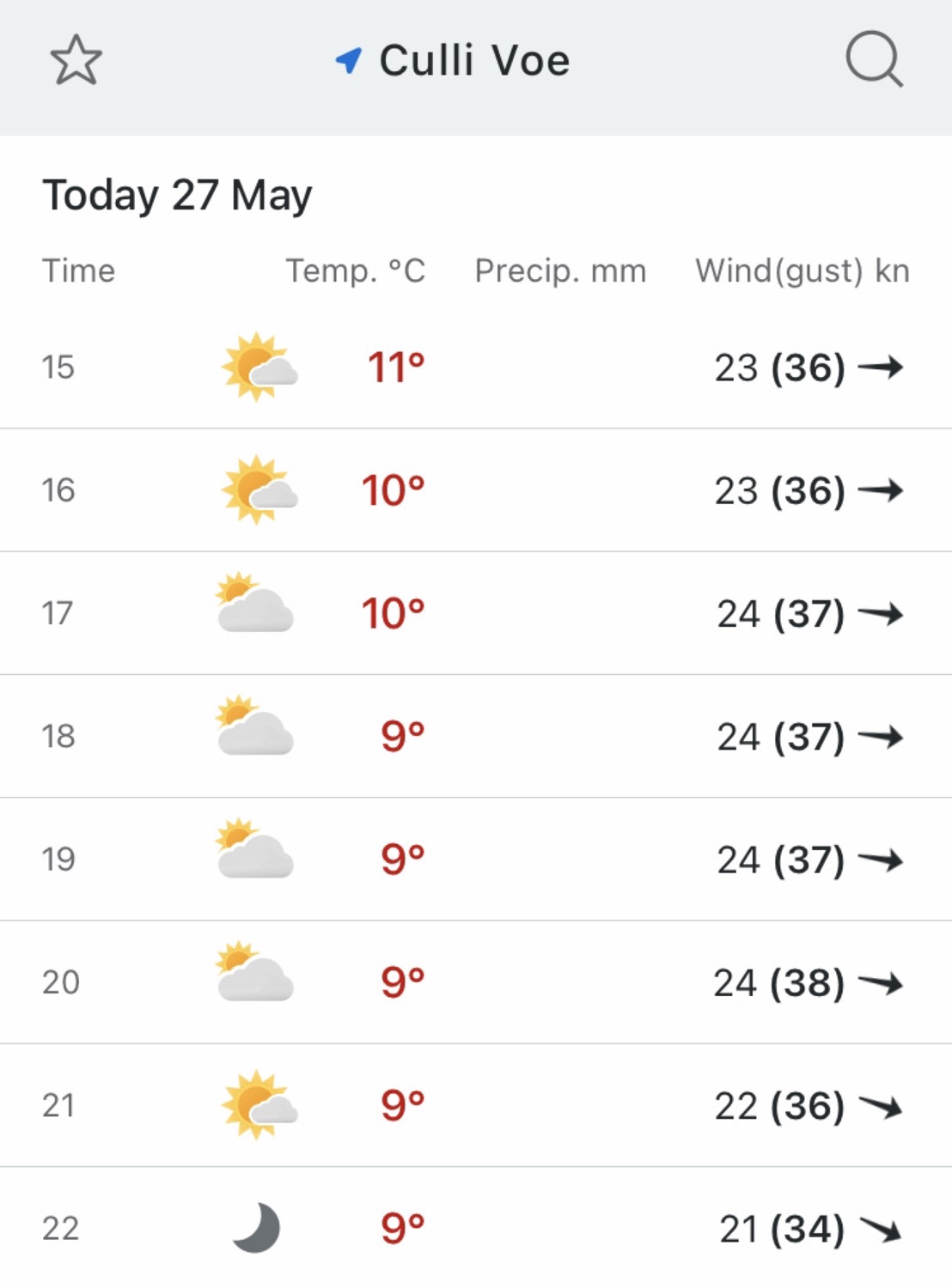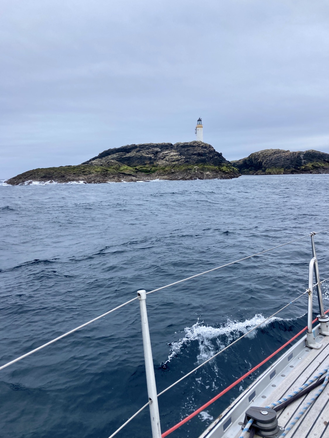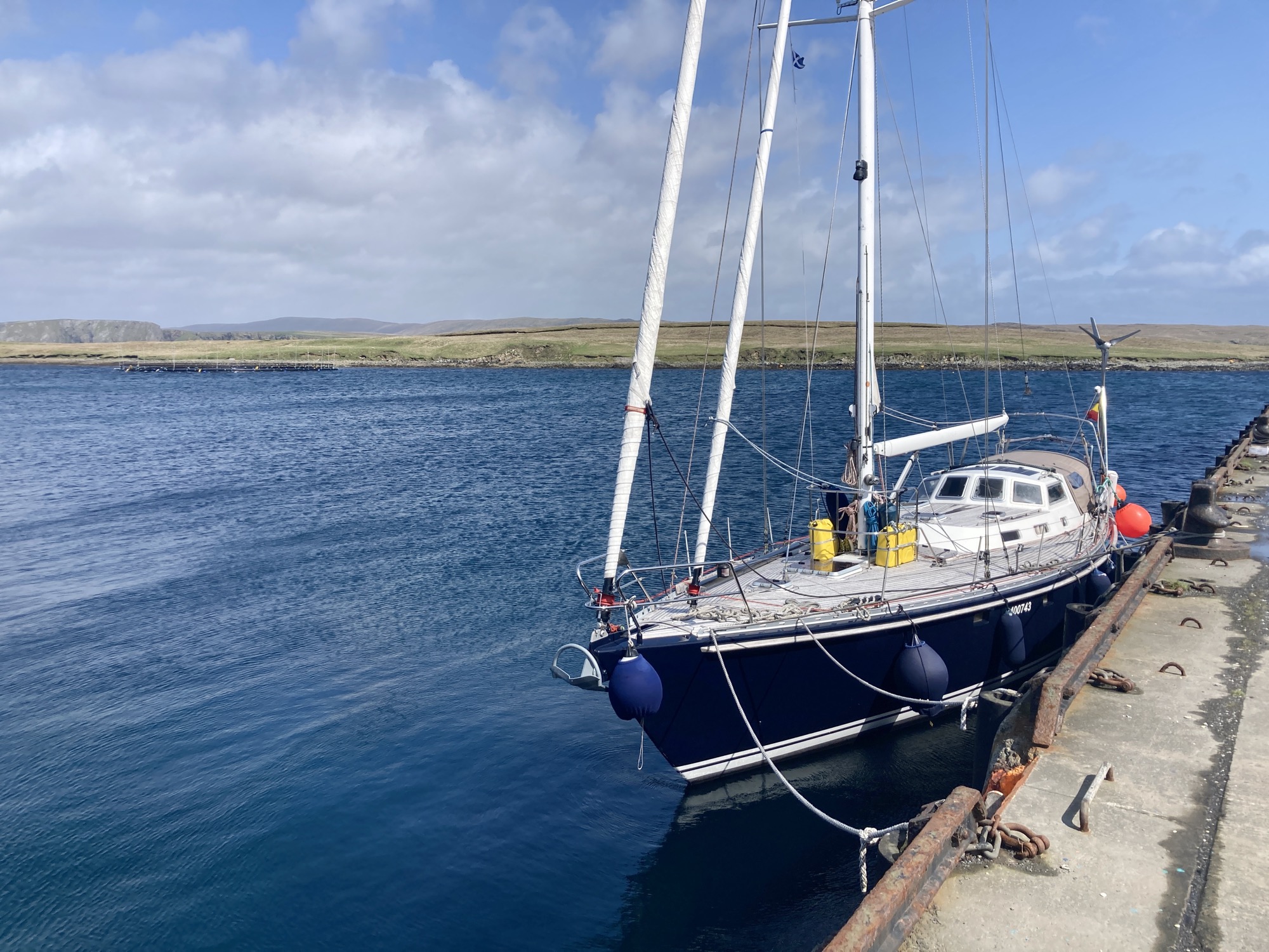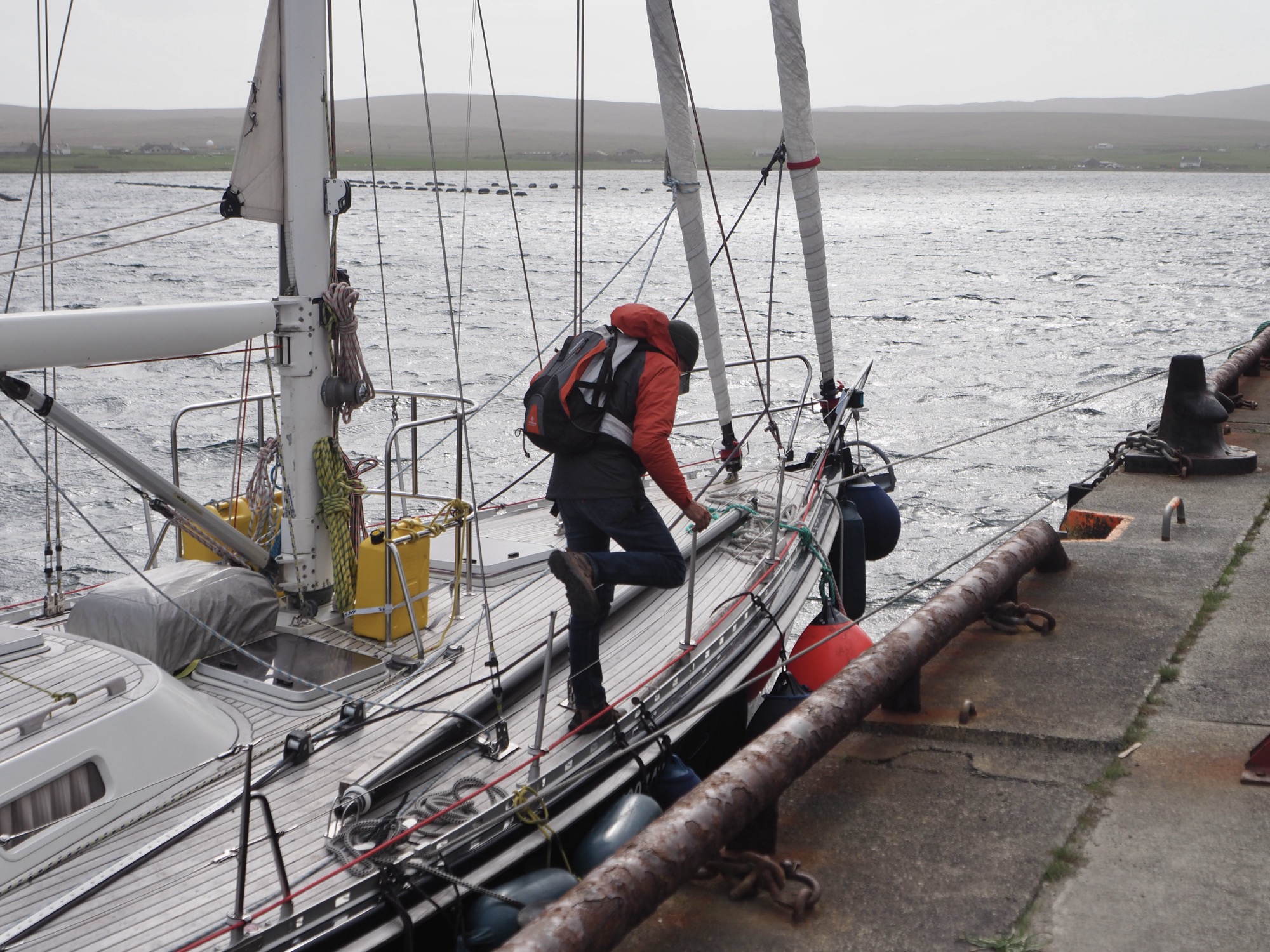 We hebben gewacht op de uitgaande stroom om uit de Bluemull Sound weg te varen maar hebben de wind op kop. Wind tegen stroom maken een wildwaterbaan van de 2,5 mijl naar open zee. De knoop komt strakker te zitten, Las neemt het stuurwiel over en loodst ons uit de wasmachine… Ook op zee vlot het niet meteen. Het heeft hard gewaaid en er staat meer zee dan wind. We kruisen in ongemakkelijke, trage slagen tot er meer regelmaat komt en onze koers bezeild is. De zee wordt vlakker en met volle zeilen lopen we heerlijk soepel, de knoop ontspant. Voor de enige hindernis onderweg, het Clair Ridge Oil Field, gaan we een beetje zuidelijker varen. Om middernacht is het nog niet helemaal donker, tegen 03:00 alweer licht, de ochtendgloed rozig.
