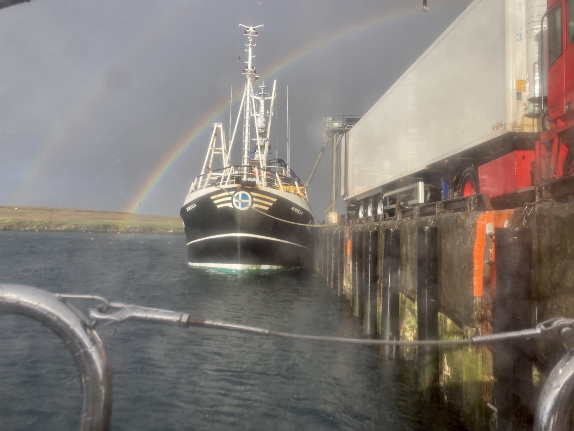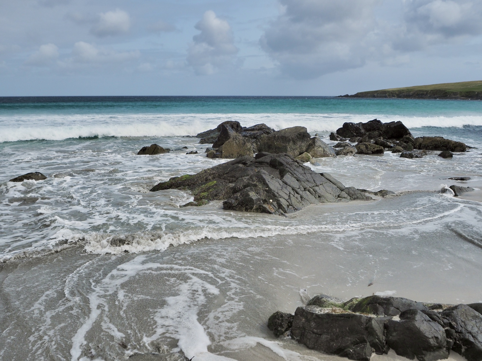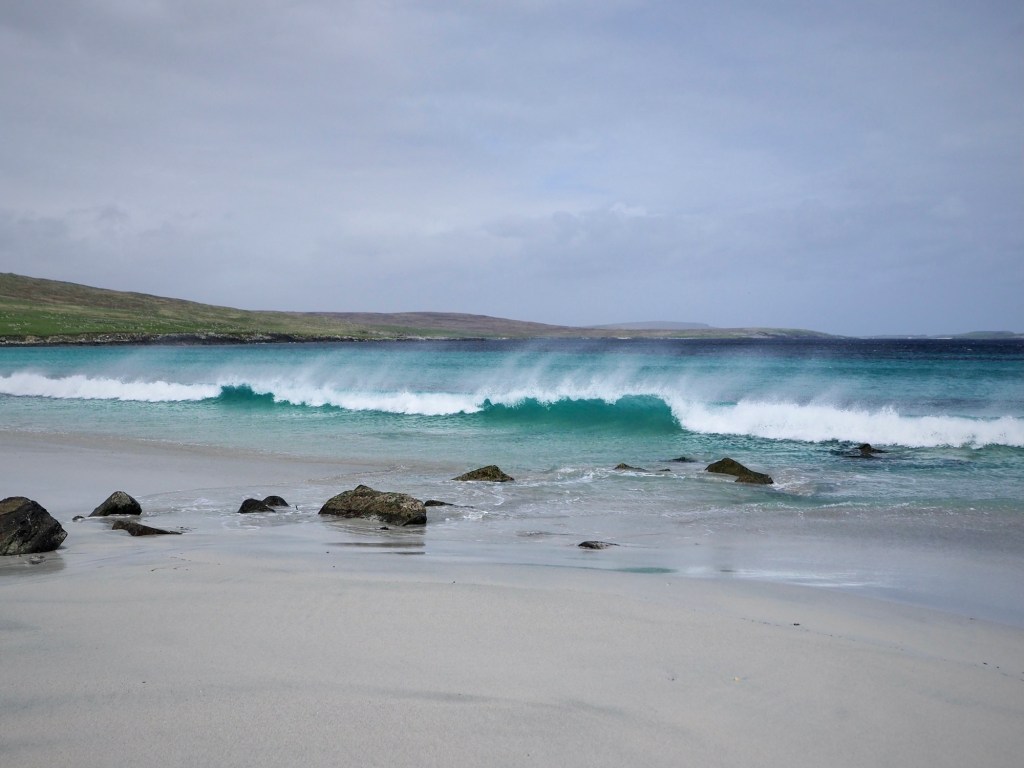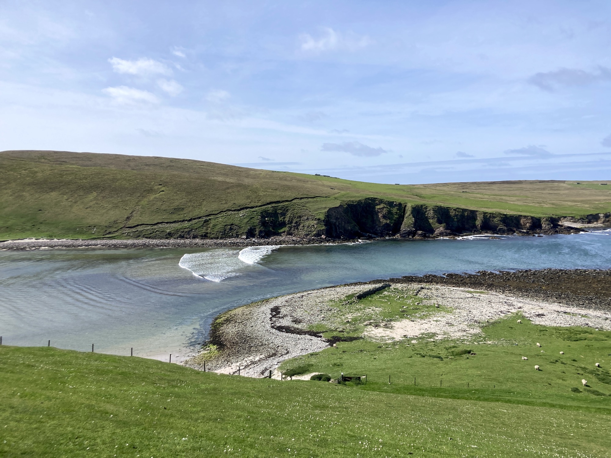 We hebben gewacht op de uitgaande stroom om uit de Bluemull Sound weg te varen maar hebben de wind op kop. Wind tegen stroom maken een wildwaterbaan van de 2,5 mijl naar open zee. De knoop komt strakker te zitten, Las neemt het stuurwiel over en loodst ons uit de wasmachine… Ook op zee vlot het niet meteen. Het heeft hard gewaaid en er staat meer zee dan wind. We kruisen in ongemakkelijke, trage slagen tot er meer regelmaat komt en onze koers bezeild is. De zee wordt vlakker en met volle zeilen lopen we heerlijk soepel, de knoop ontspant. Voor de enige hindernis onderweg, het Clair Ridge Oil Field, gaan we een beetje zuidelijker varen. Om middernacht is het nog niet helemaal donker, tegen 03:00 alweer licht, de ochtendgloed rozig.
