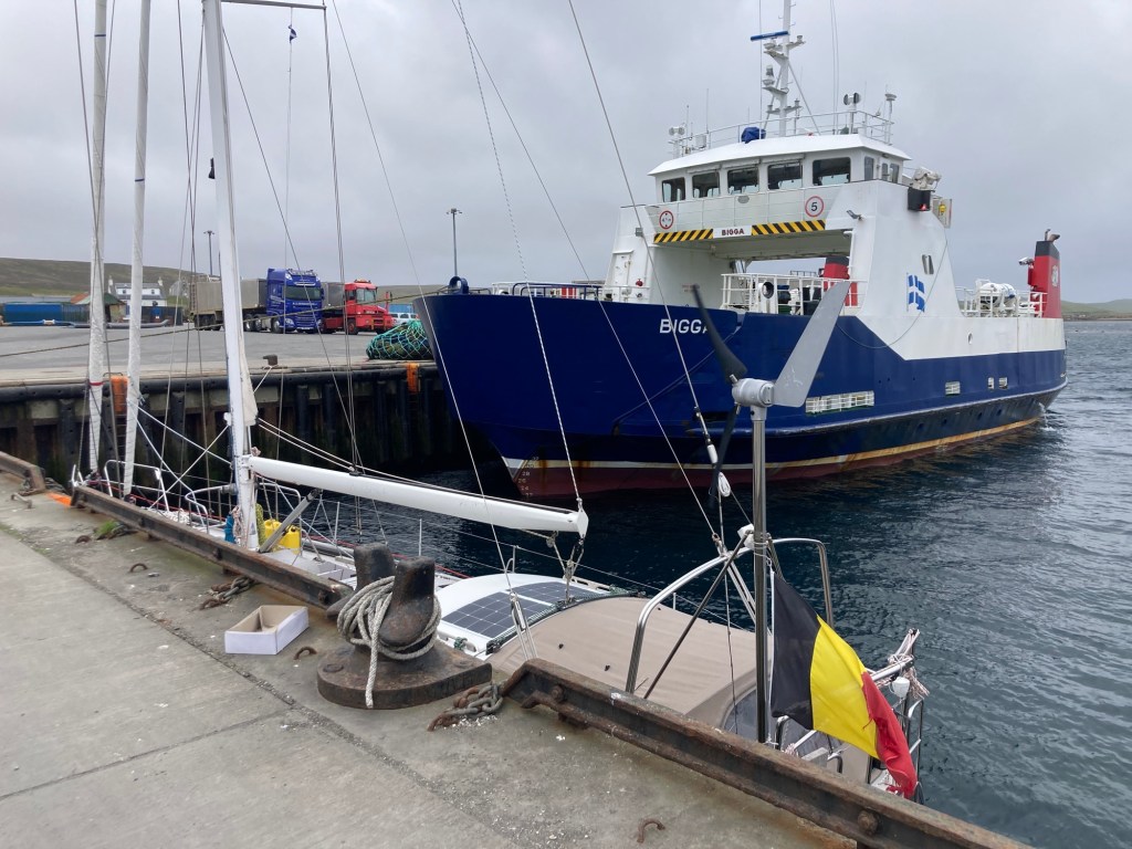 Om halftien ’s avonds, 34 uur en 194 mijl na vertrek, lopen we Vágsfjørdur binnen, een brede fjord zonder noemenswaardige gevaren of verontrustende stromingen. Niet veel later liggen we afgemeerd aan een stoere kade met autobanden, we zijn in de Faeröer!