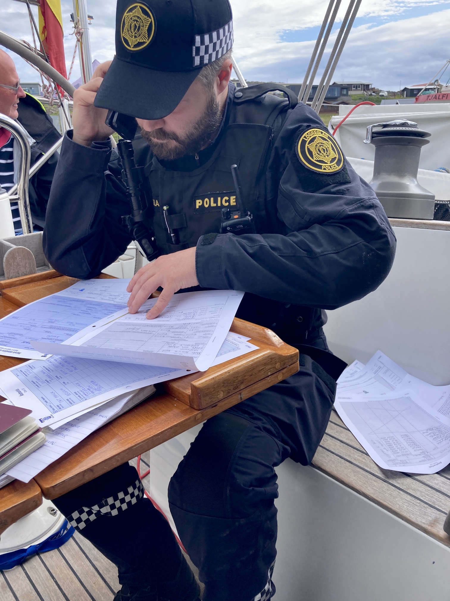 Aan stuurboord wappert de Ijslandse vlag samen met de gele Q vlag maar niemand van de douane daagt op. Als we het navragen, vernemen we dat de douane het te druk heeft en dat er iemand van de politie zal komen. De jongen van de politie heeft nog nooit eerder een zeilboot ingeklaard en worstelt met de formulieren. Ja, meervoud. Want per boot in IJsland aankomen, daar hoort wat papierwerk bij. Welgeteld vijf rapporten.