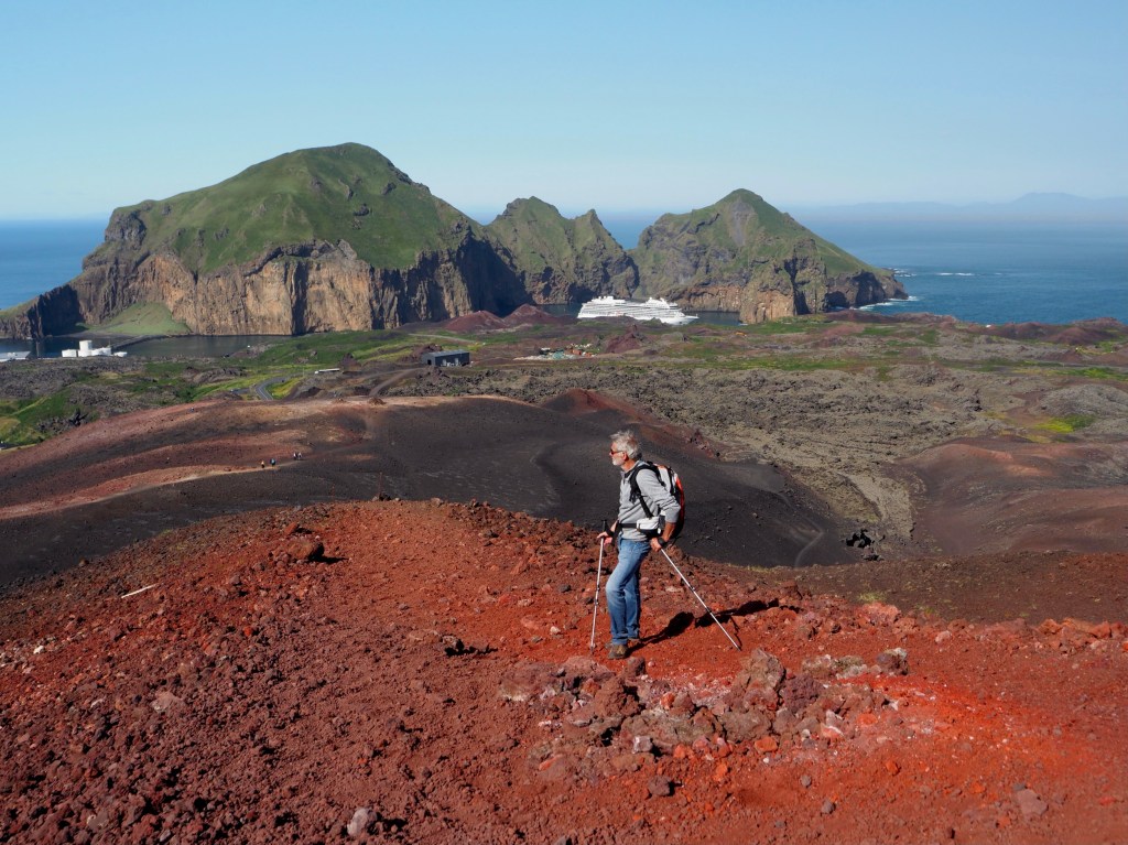Nog even lijkt het erop dat wolken de pret toch gaan bederven maar hoera, ze lossen wonderwel op, en als we vlakbij zijn kleurt de inmiddels al lage zon de unieke zeshoekige basaltformaties goudgeel.
