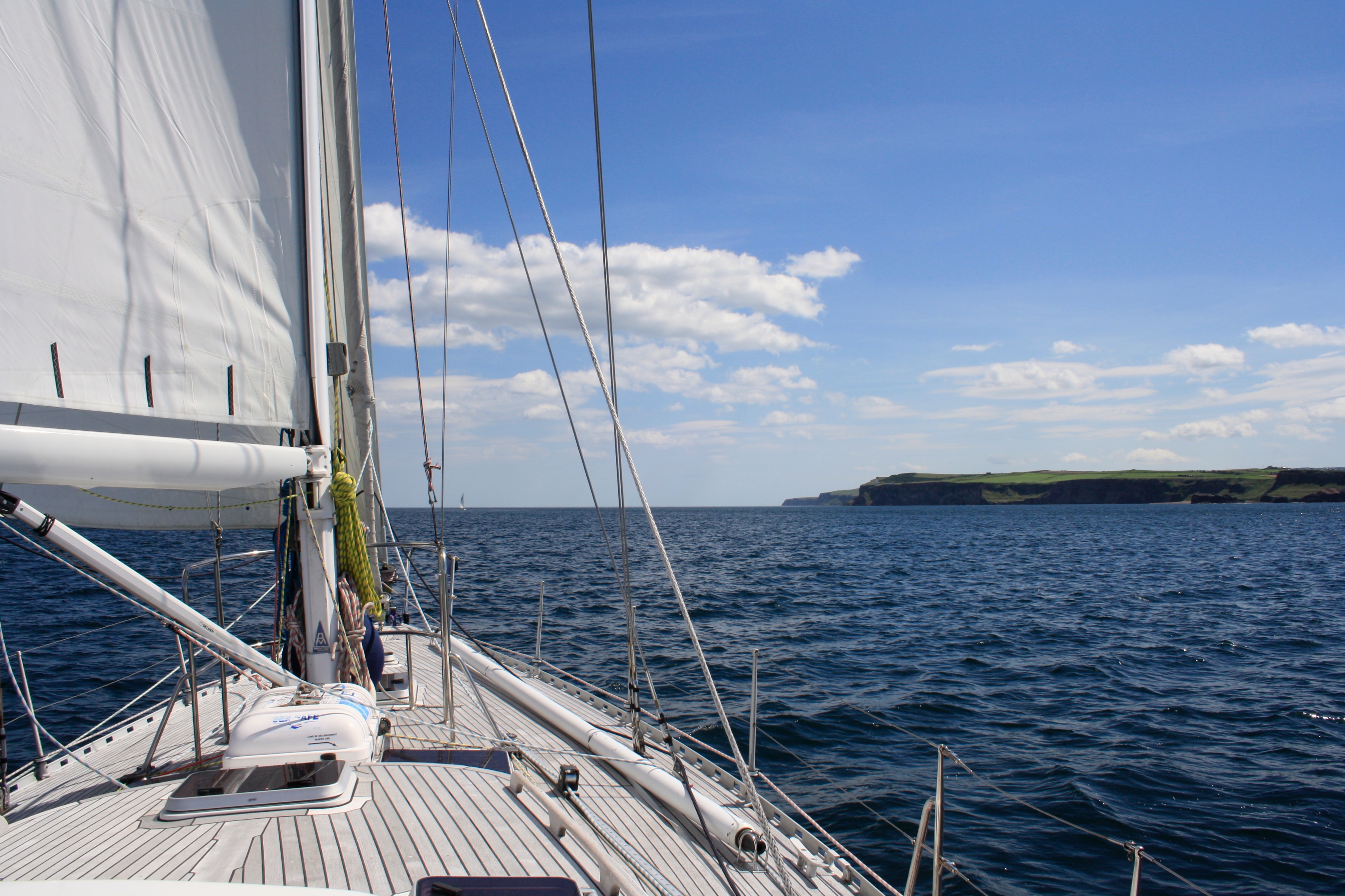 15 juni 2016. Scarborough. We zijn enkele uren geleden vertrokken voor een tocht naar Wick, het noorden van Schotland. Bij aankomst in Scarborough, twee dagen eerder, was er dikke mist geweest, het leek wel herfst. Een dag later was de hemel strak blauw, de zon straalde. En nu, nog een dag later, lijkt die zomer alweer voorbij. Alles is grijs, het water, de lucht, de boot, wij. Massa’s mijlen liggen voor ons. De miezer gaat over in regen. Dat gaan wel hele lange mijlen worden denk ik dan. Tijd voor iets leuks. ‘Wat dacht je van thee en cake?’, vraag ik mijn schipper. Opklaring!