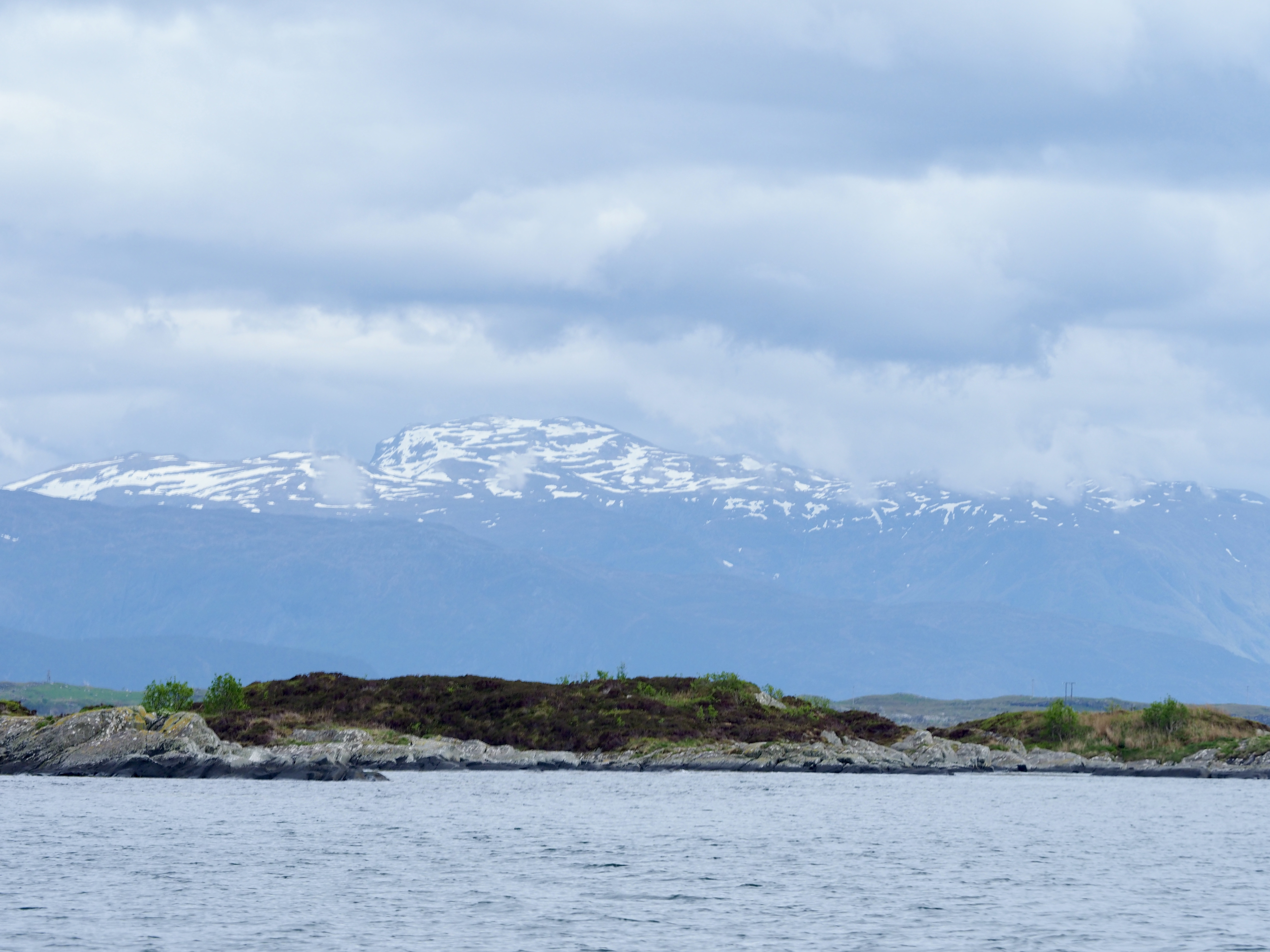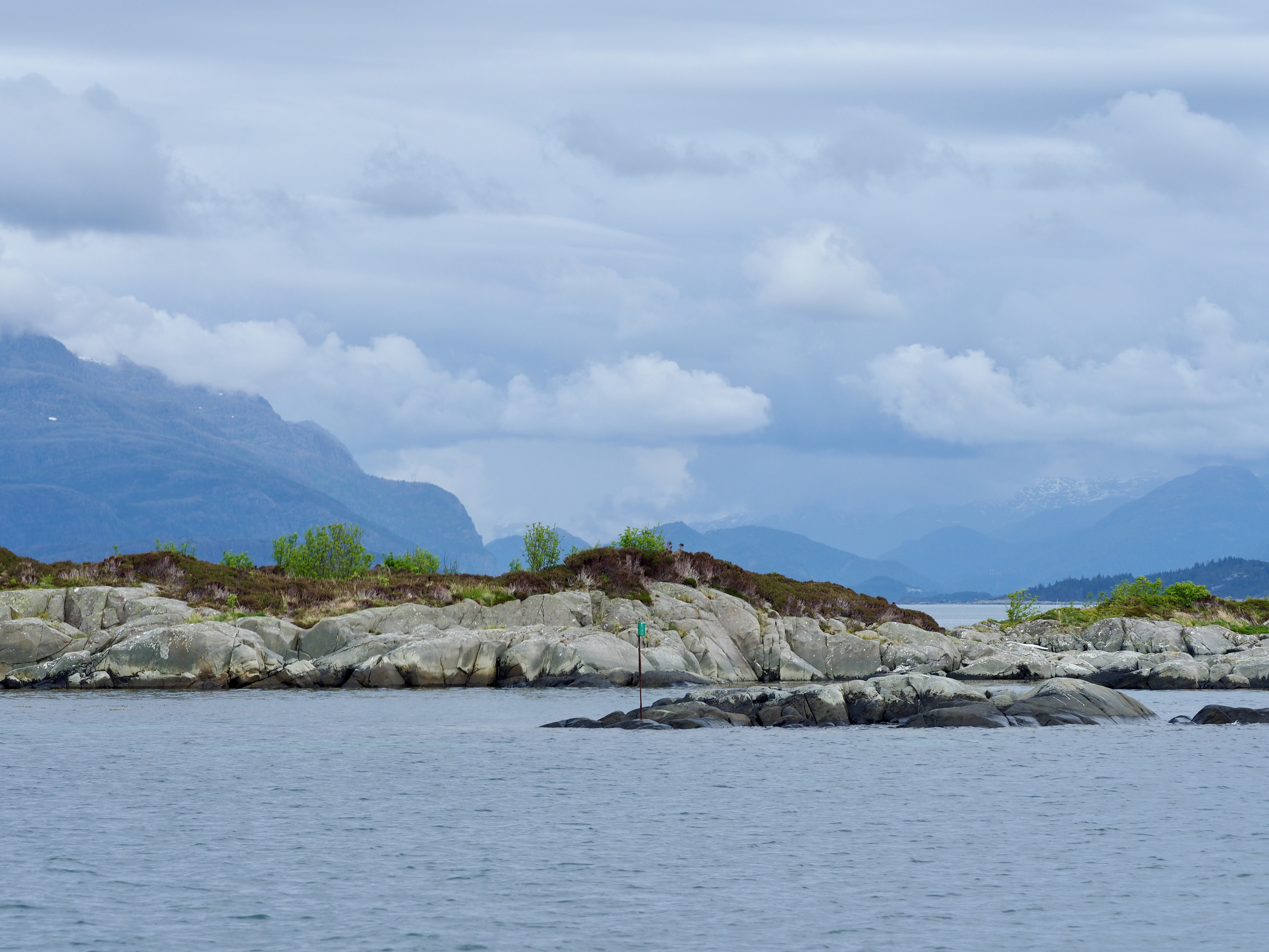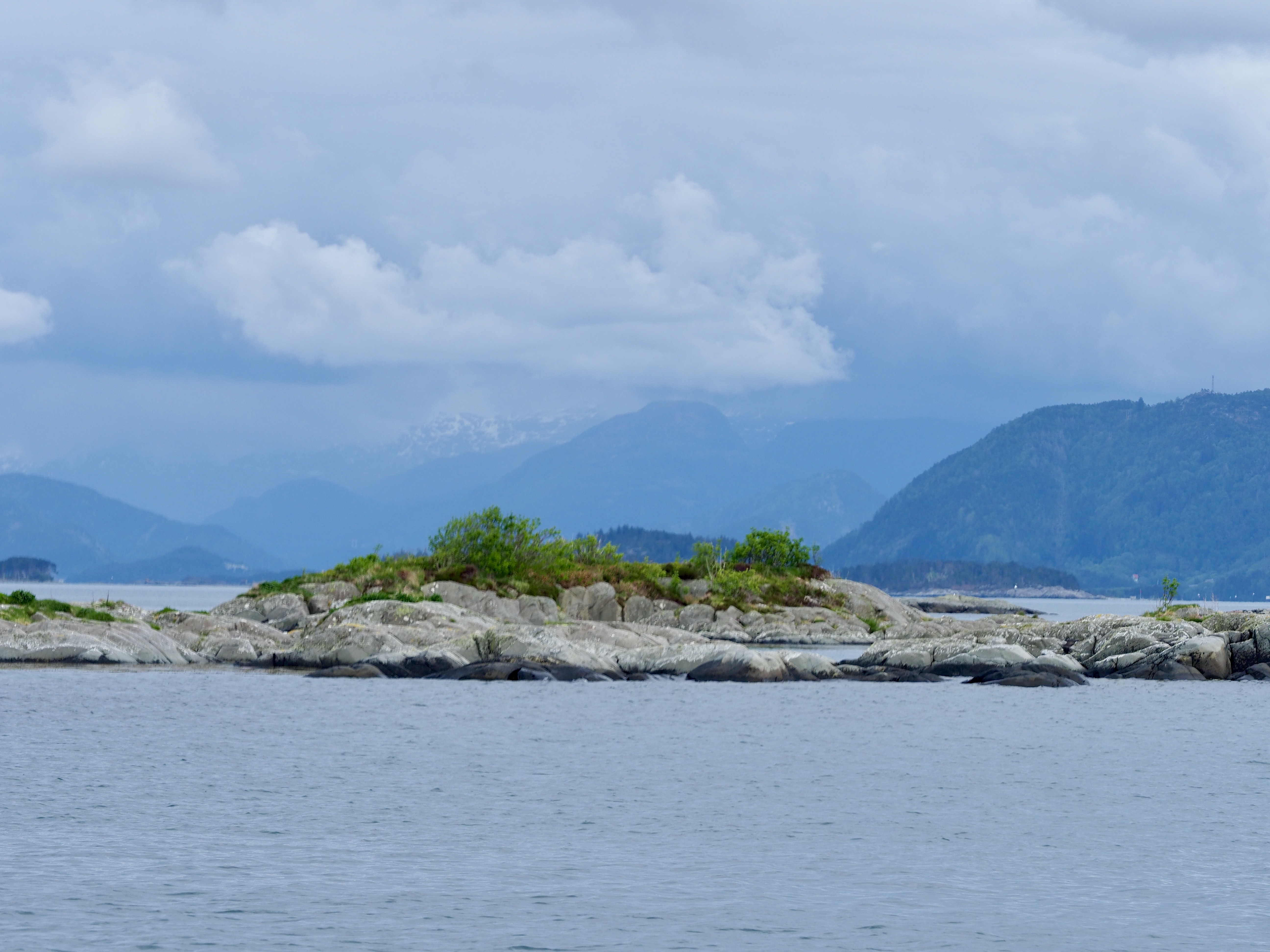 De scheren waar we langs varen zijn laag, grijsgroen en rotsachtig, soms staat er een schriel struikje of boompje op. Ver op de achtergrond zien we kolossale stompe oer-bergen, zwartblauw met witte vlekken van sneeuw. De dichtbijgelegen scheren schuiven snel voorbij terwijl het massieve decor met de bergen ogenschijnlijk op zijn plaats blijft. Zo verandert het landschap onophoudelijk, wat een beetje bevreemdend werkt. Je zou er het gevoel voor maat en afstand bij verliezen.