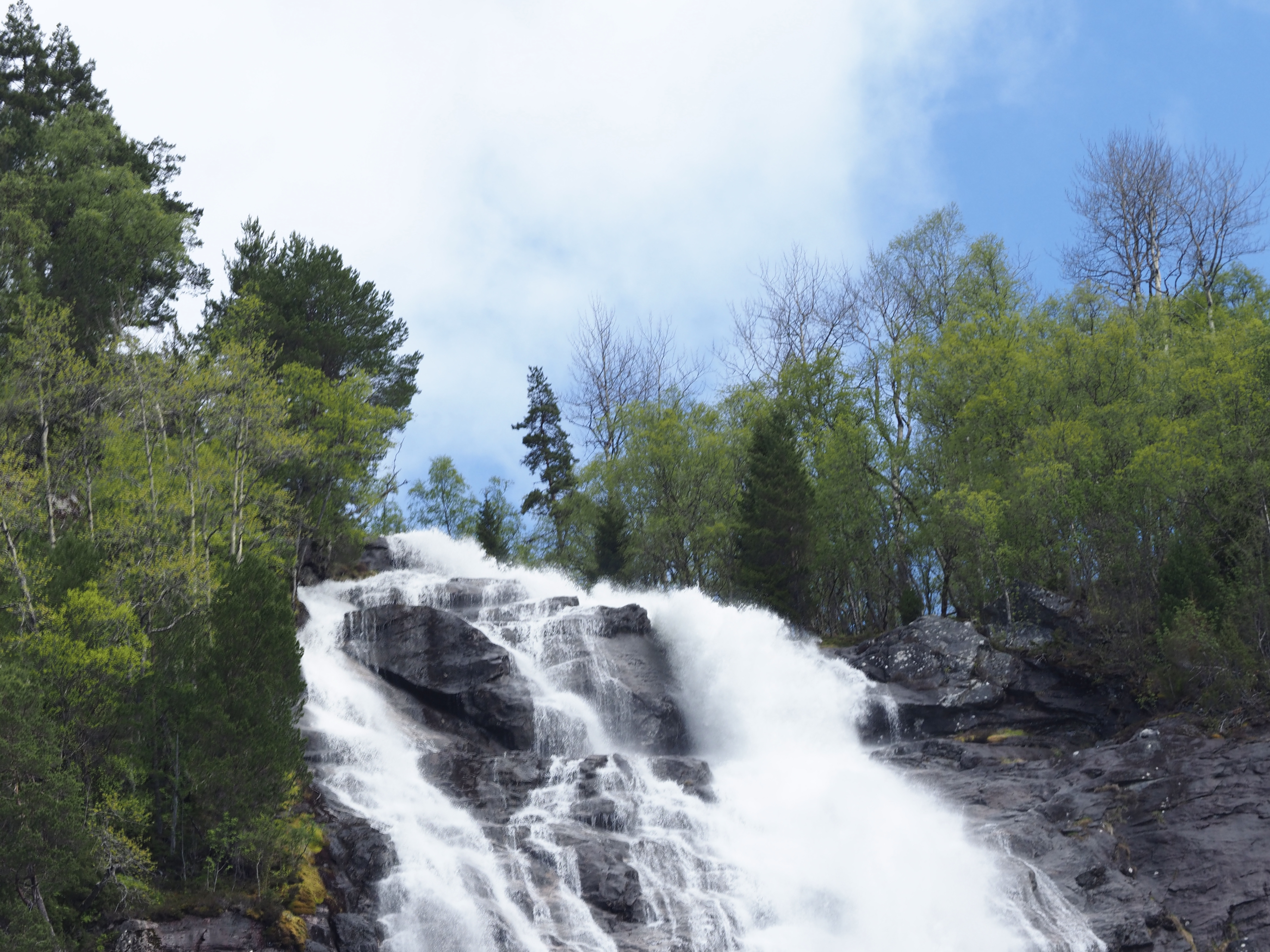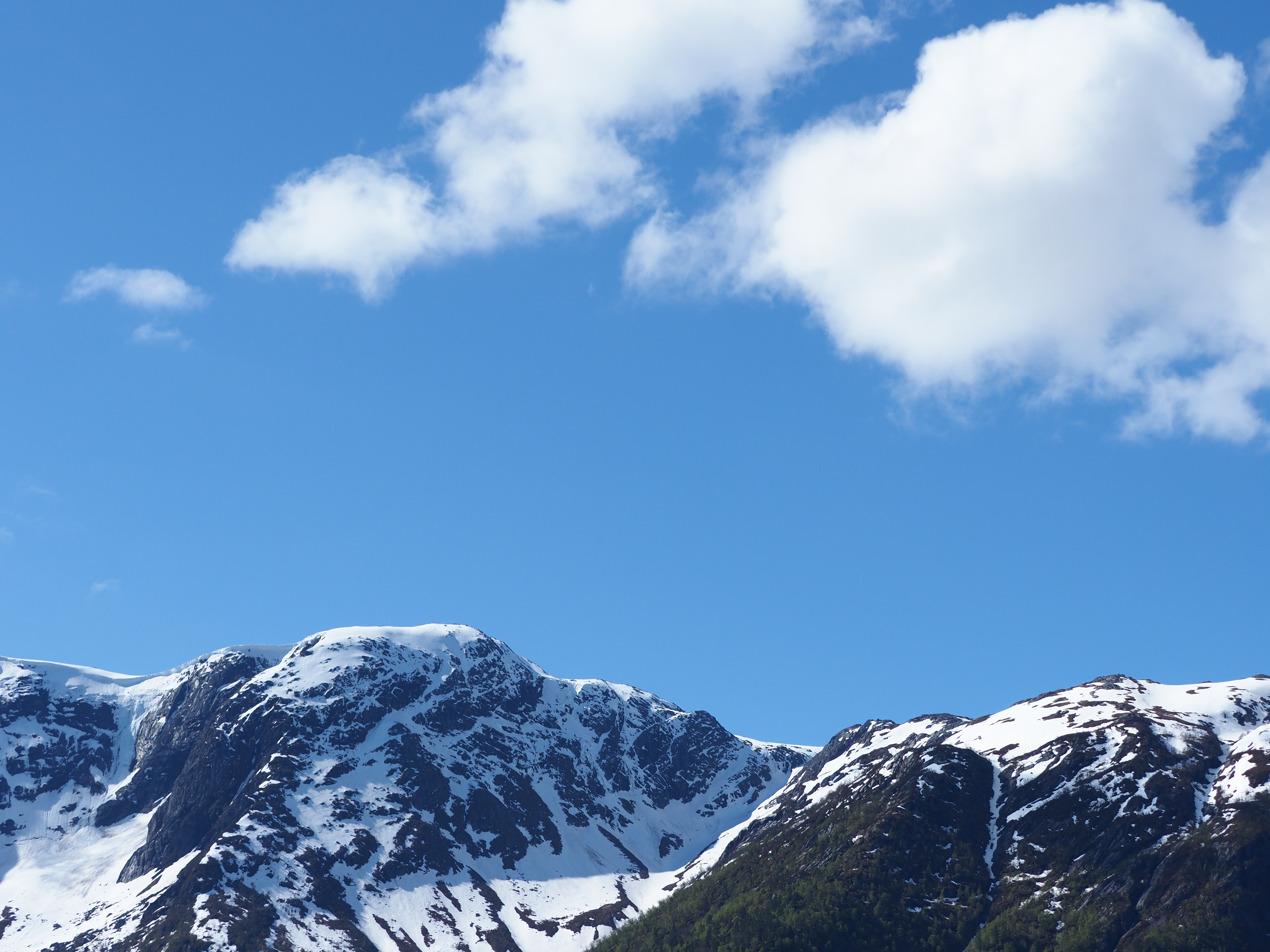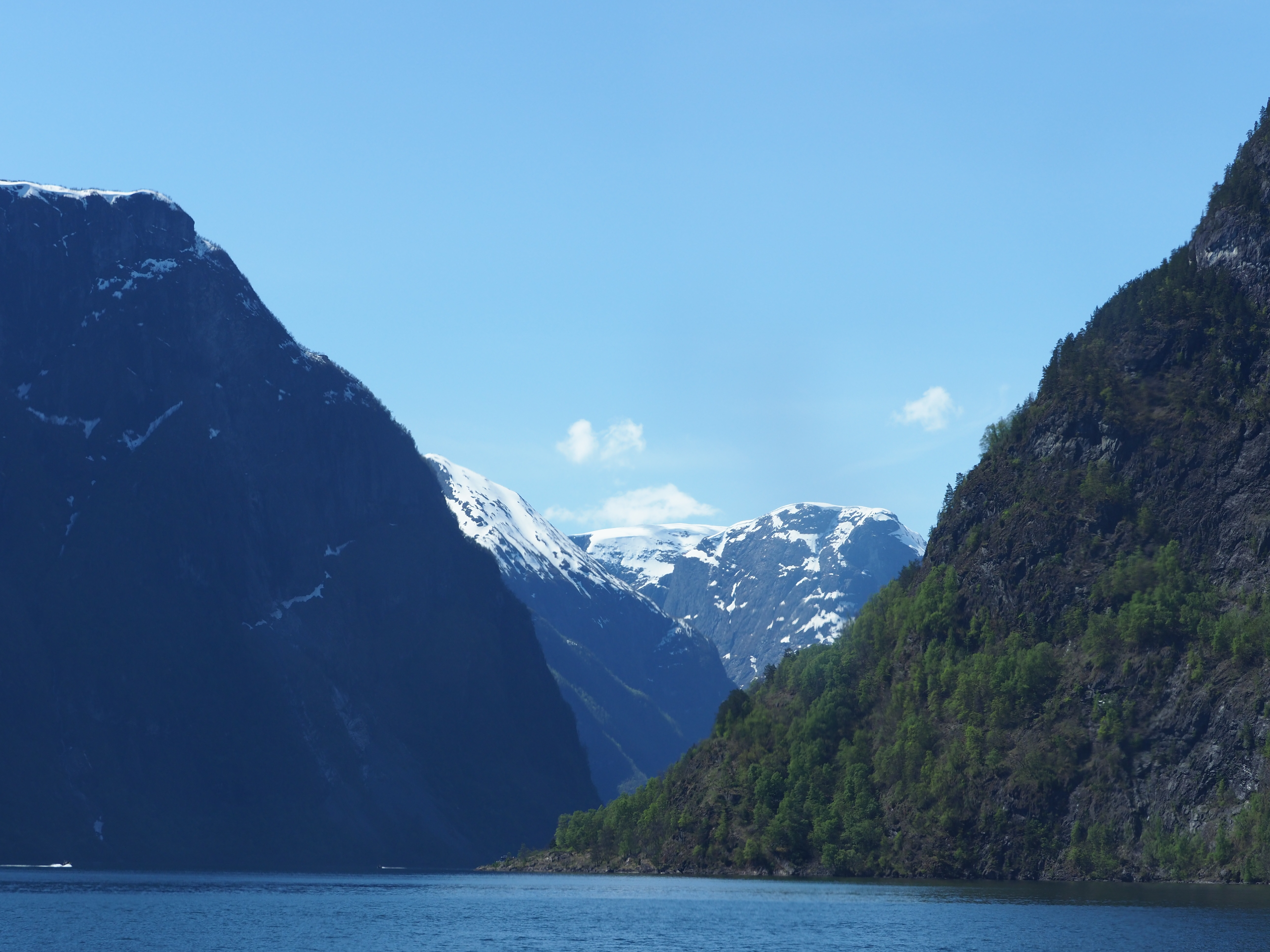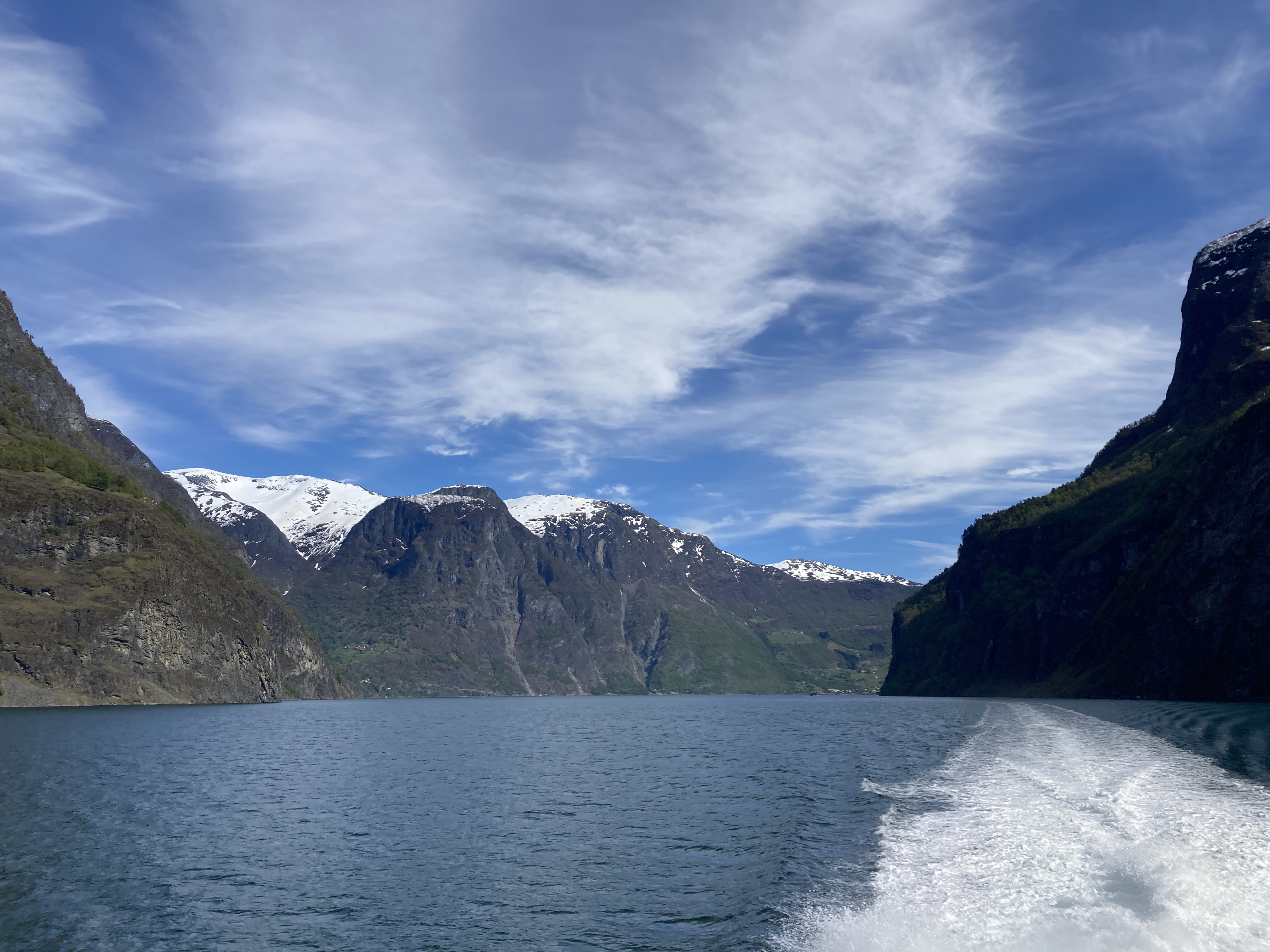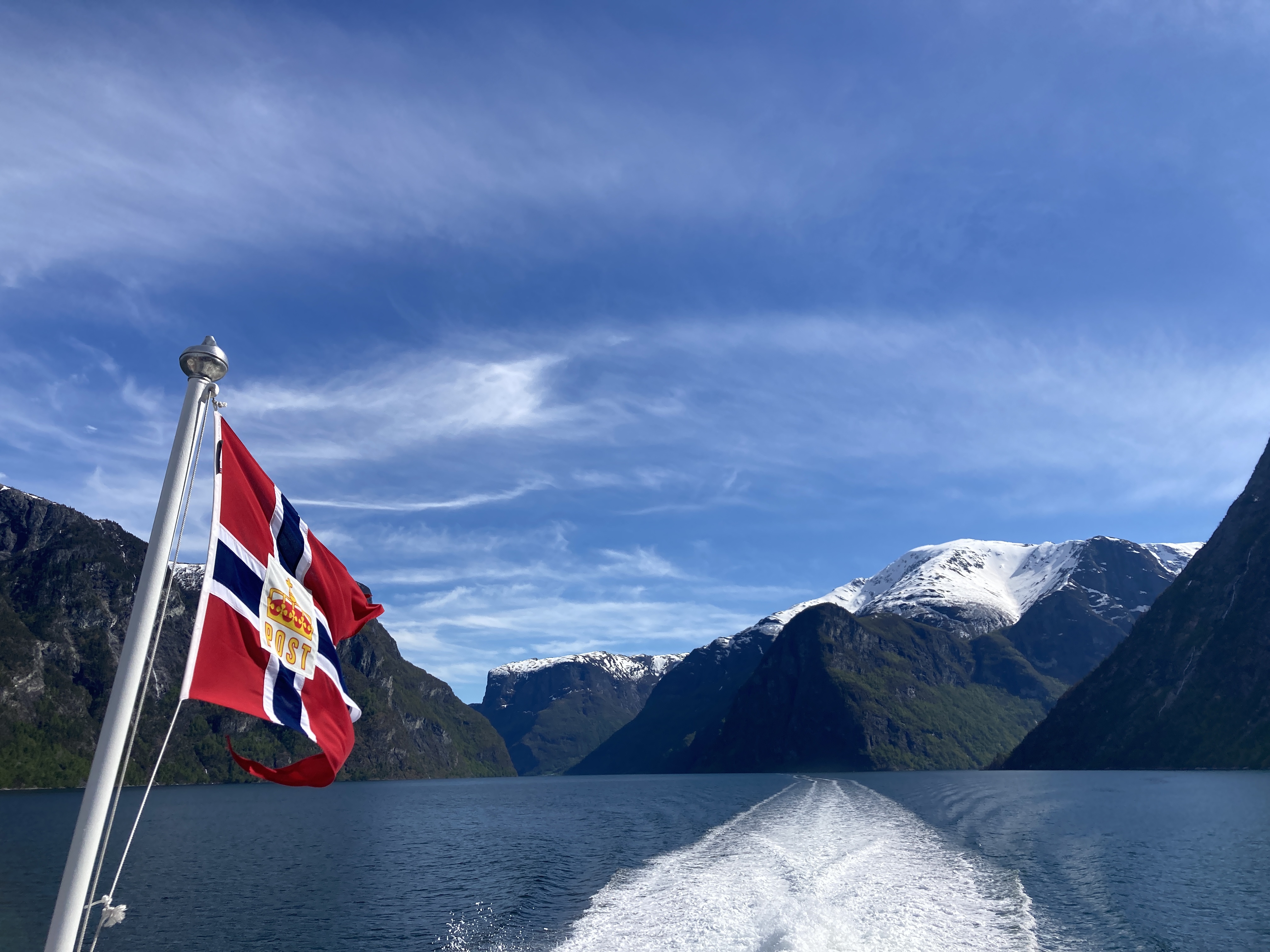 De Sognefjord is de derde langste fjord ter wereld en een toeristische trekpleister van formaat. We zouden de 204 km helemaal heen en terug kunnen varen maar dat is tijdrovend en veelal op motor. We verkiezen de tip van Judy om het met een snelle toeristenferry te doen. En wat blijkt? We hoeven daar niet nóg een haven verder voor te varen zoals vermeld in haar boek (editie 2016). Want vlakbij de kade waar we afgemeerd liggen blijkt de express-boot Bergen-Flåm nu ook een halte te hebben. En zo snellen we een dag later in een postkaart-decor aan 33 knopen naar Flåm, het eindpunt in de Sognefjord. Besneeuwde bergtoppen, imposante watervallen, lieflijke dorpjes en fruitbomen in bloei… De tickets zijn niet goedkoop maar hun geld wel waard!